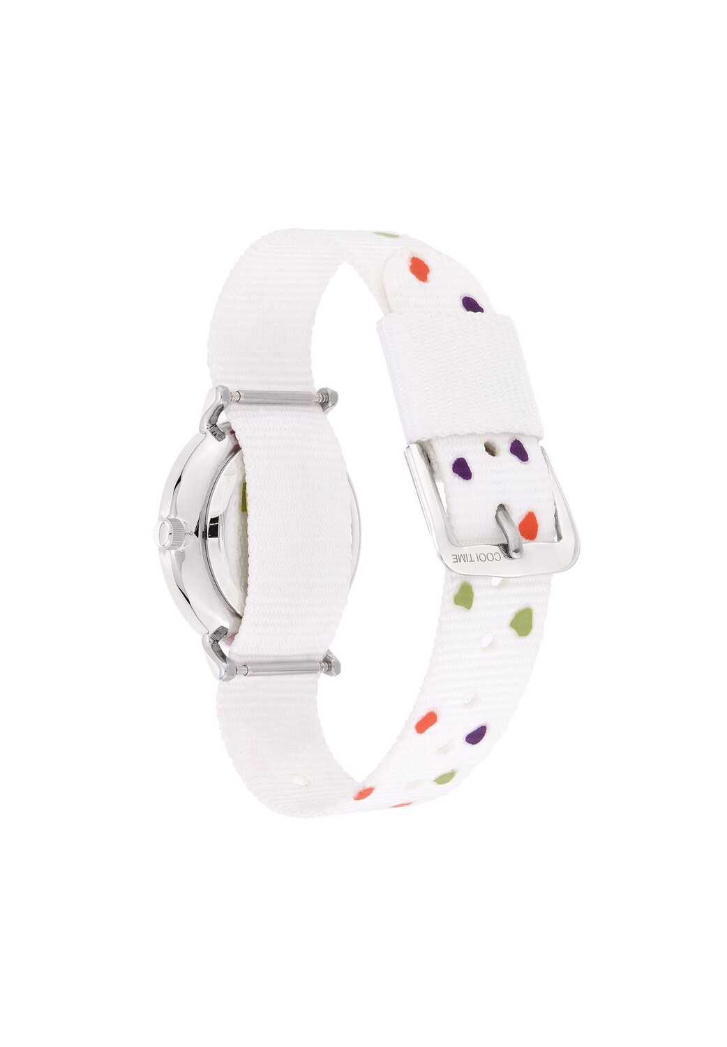 Особенности Качественные детские часы от бренда Cool Time с обезьянкой мотив и механизм японского качества Корпус из полированного металла Ø28 мм; Задняя крышка корпуса, заводная головка и застежка из нержавеющей стали; Минеральное стекло, 3 атм удобный прочный текстильный ремешок белого цвета с разноцветными точками; Длина: 195 мм