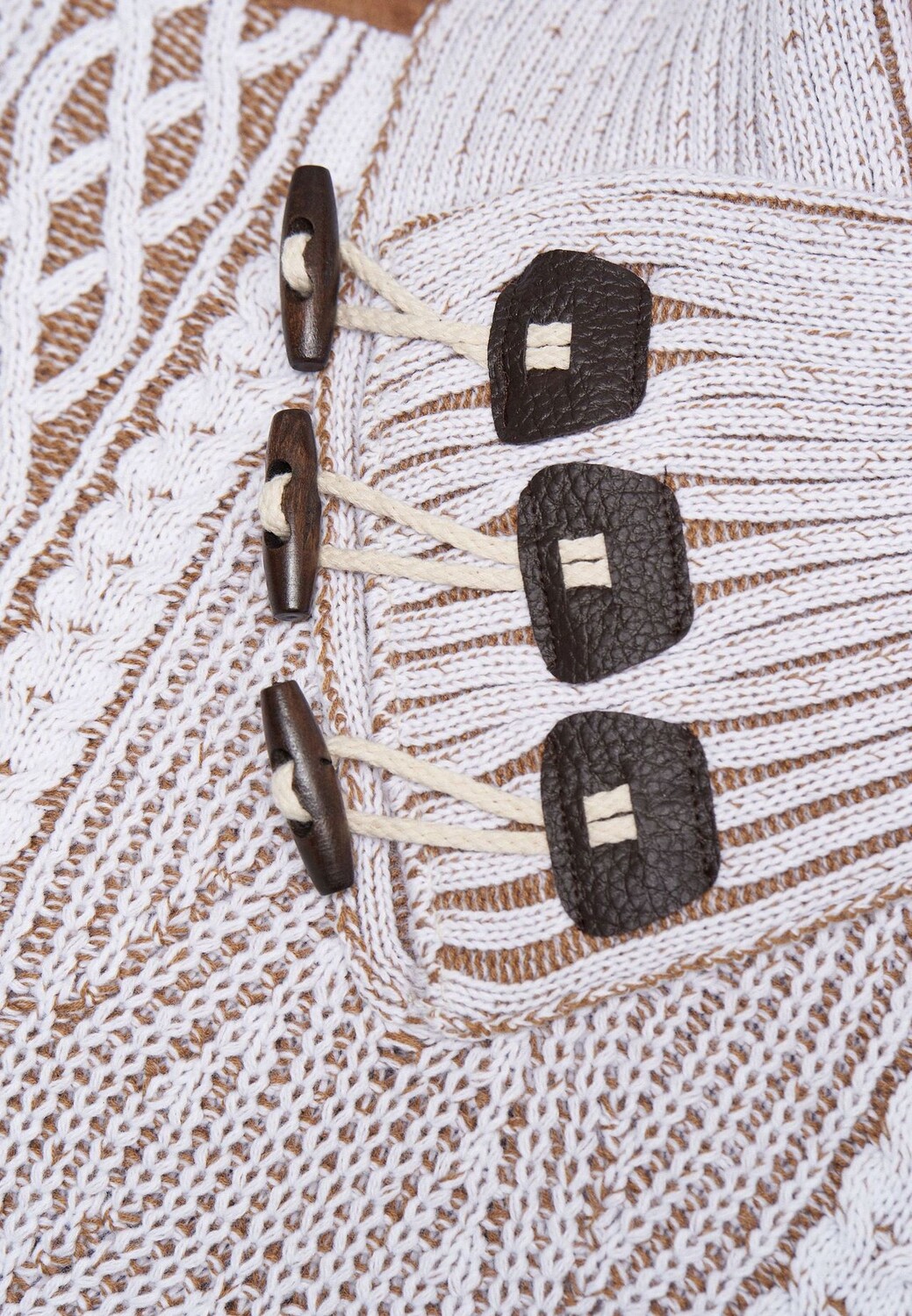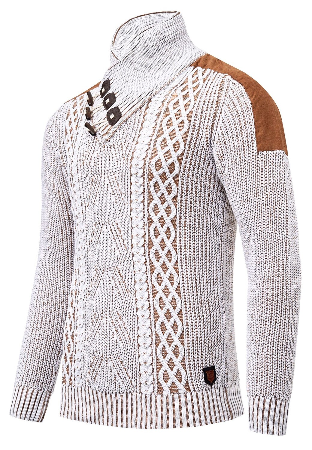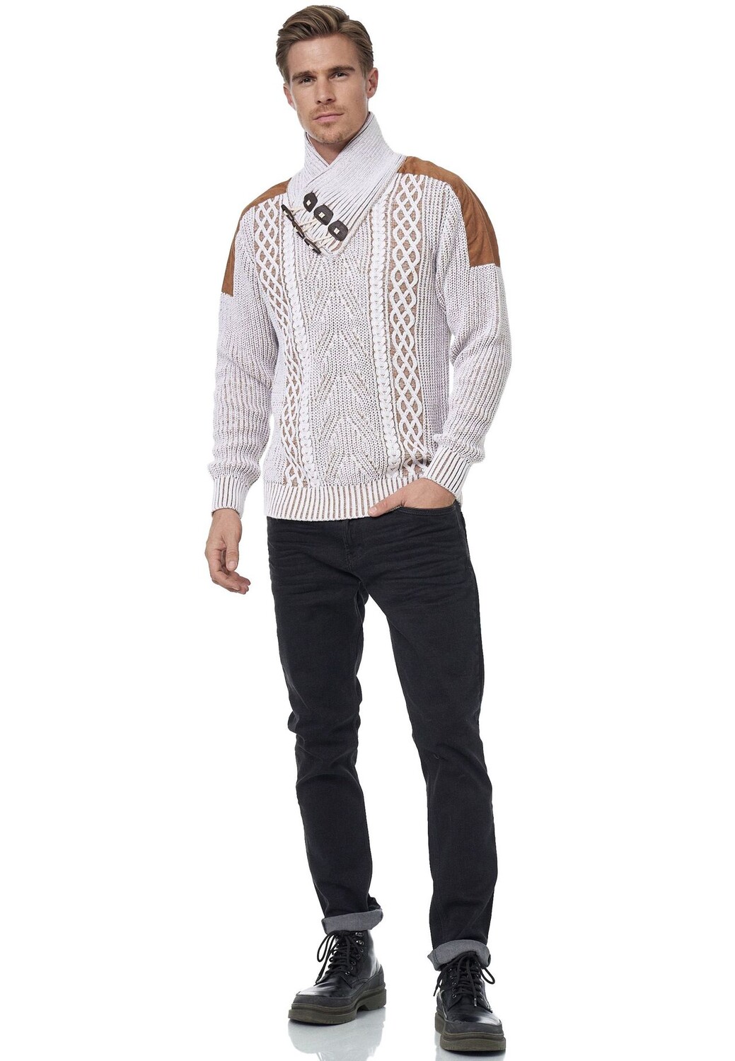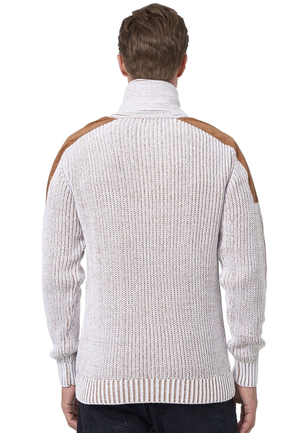 Если вы хотите быть модно одетыми в холодные дни осени и зимы, вы просто не можете игнорировать этот свитер от Rusty Neal. Уютная модель из хлопка и полиакрила впечатляет своим двухцветным дизайном, элементами под кожу на плече и элегантным вязаным узором по всей поверхности. У него современный шалевый воротник, который закрывается на пуговицы и обеспечивает отличную защиту шеи от холода. Свитер – настоящий универсал и особенно хорошо сочетается со спортивным или повседневным образом для отдыха. Модель ростом 1,85 м весит более 80 кг, носит размер М.