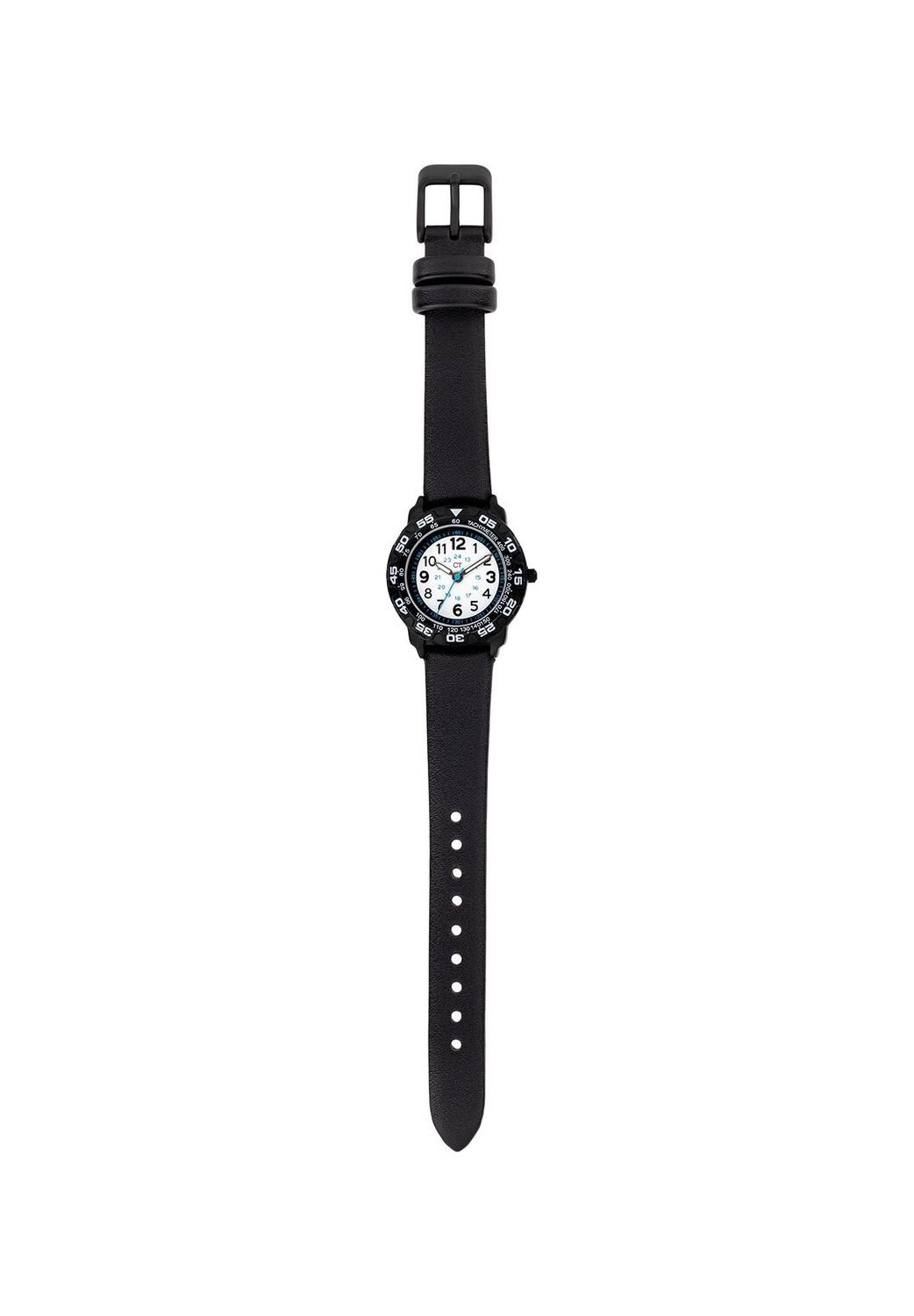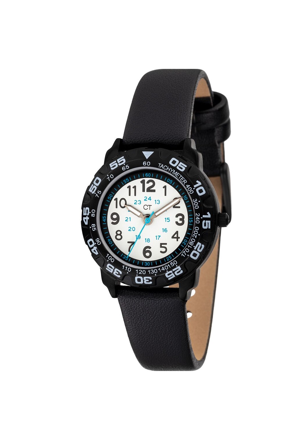 Особенные характеристики Высококачественные детские часы Cool Time черного цвета. с белым циферблатом и бирюзово-синими акцентами Металлический корпус с вращающимся верхним кольцом, Ø 30 мм; Задняя крышка корпуса, заводная головка и застежка из нержавеющей стали; Устойчивое к царапинам минеральное стекло, водонепроницаемость проверена до 3 бар/атм
