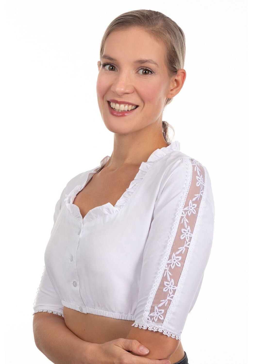 Классическая блузка в дирндле, которая никогда не выходит из моды, в современной интерпретации: наша блузка в дирндле Annabella. Небольшой V-образный вырез с планкой на пуговицах и рюшами на шее — прекрасный фаворит на все времена в блузке в стиле дирндл. Также имеются 3-4 рукава, которые декорированы красивой каймой из тафты и кружева и таким образом придают образу современный, свежий вид. Поскольку мы всегда обращаем внимание на детали, кружево также окружено каймой, связанной крючком, а рукава также украшены каймой, связанной крючком.