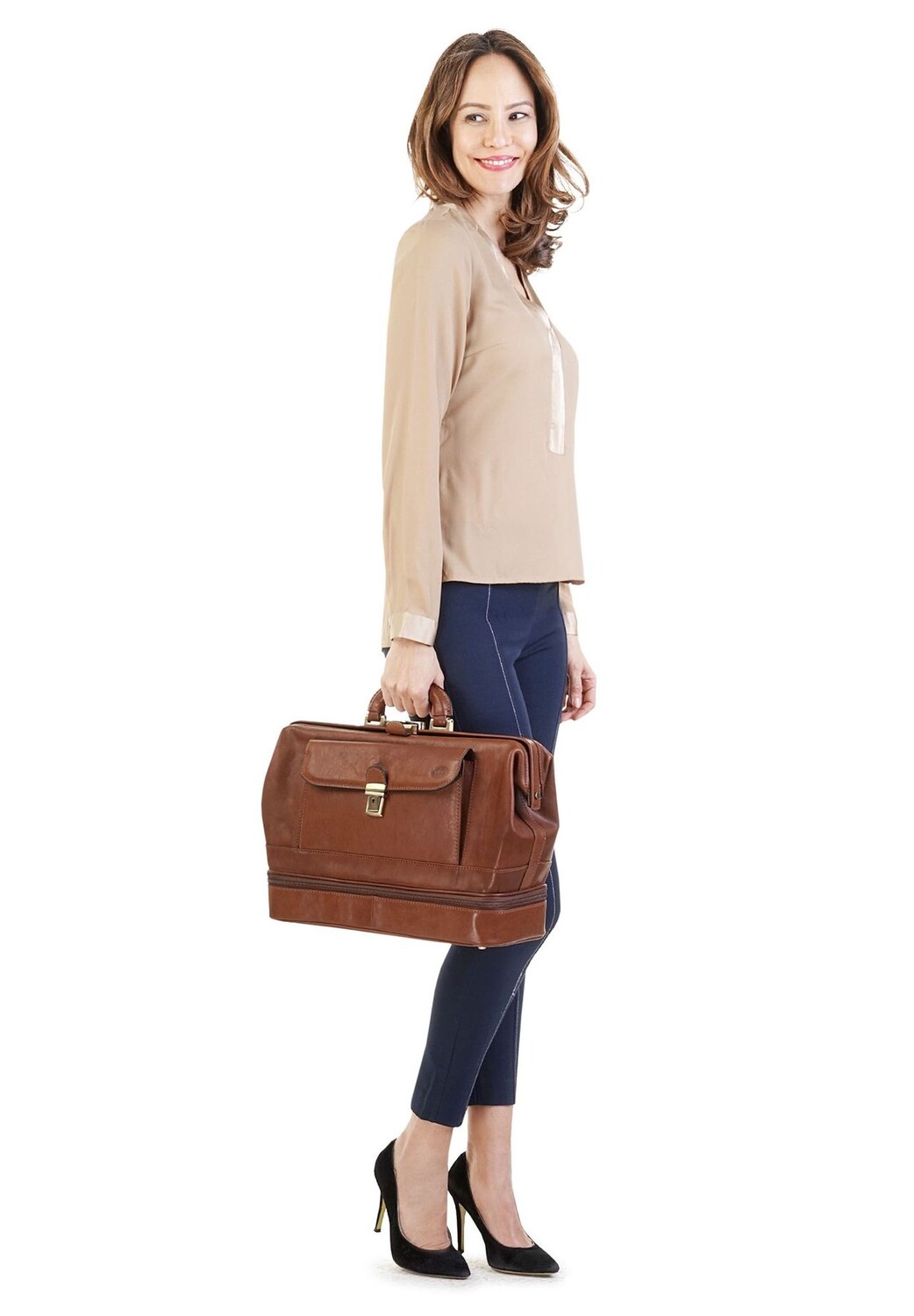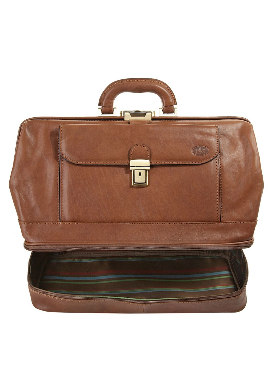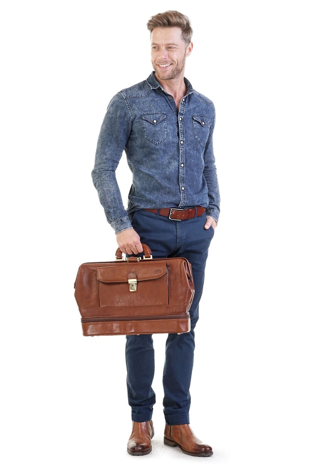 Кожаная дорожная сумка из пике – элегантное, ностальгическое решение в поездках и повседневной деловой жизни. Ретро-дизайн основан на классической врачебной сумке. Благодаря застежке-застежке сумку можно открыть особенно широко, обеспечивая легкий доступ к просторному внутреннему пространству. Различные молнии и прорезные карманы обеспечивают порядок. Запирающаяся застежка обеспечивает безопасность во время путешествия. Придайте очарование и стиль минувших дней вместе с кожаной дорожной сумкой из пике. * 100% натуральная кожа * 1 основное отделение на застежке * 1 внутреннее отделение на молнии * 1 внутреннее отделение для смартфона * 1 накладной карман внутри * 2 держателя для ручек внутри * 1 нижнее отделение на молнии * 1 передний карман с замком * с замком для дополнительных принадлежностей безопасность
