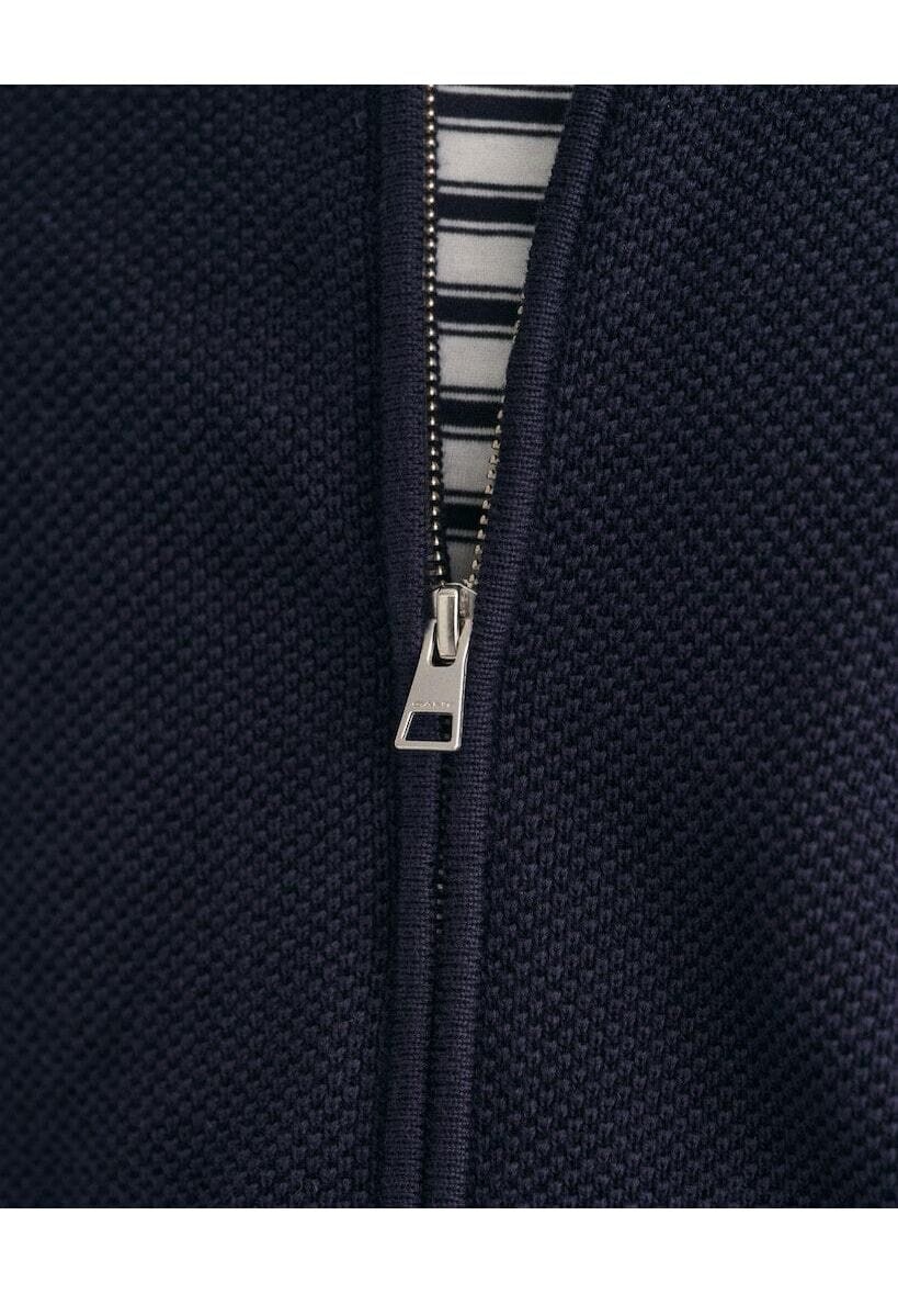 Классический крой. Молния спереди во всю длину. Ребристые манжеты и нижний край. Контрастные полосы на внутренней стороне выреза. Вышивка логотипа GANT на груди. Стирать с аналогичными цветами. Стирать, вывернув наизнанку. Придайте форму, пока она влажная. Придайте форму утюгом.