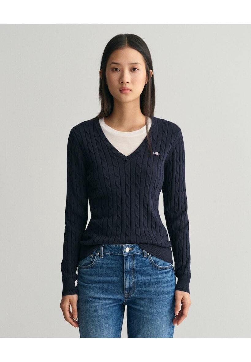 Облегающий крой, V-образный вырез. Ребристые детали. Графическая вышивка GANT на груди. Стирать с похожими цветами. Стирать, вывернув наизнанку. Придайте форму, пока она влажная.