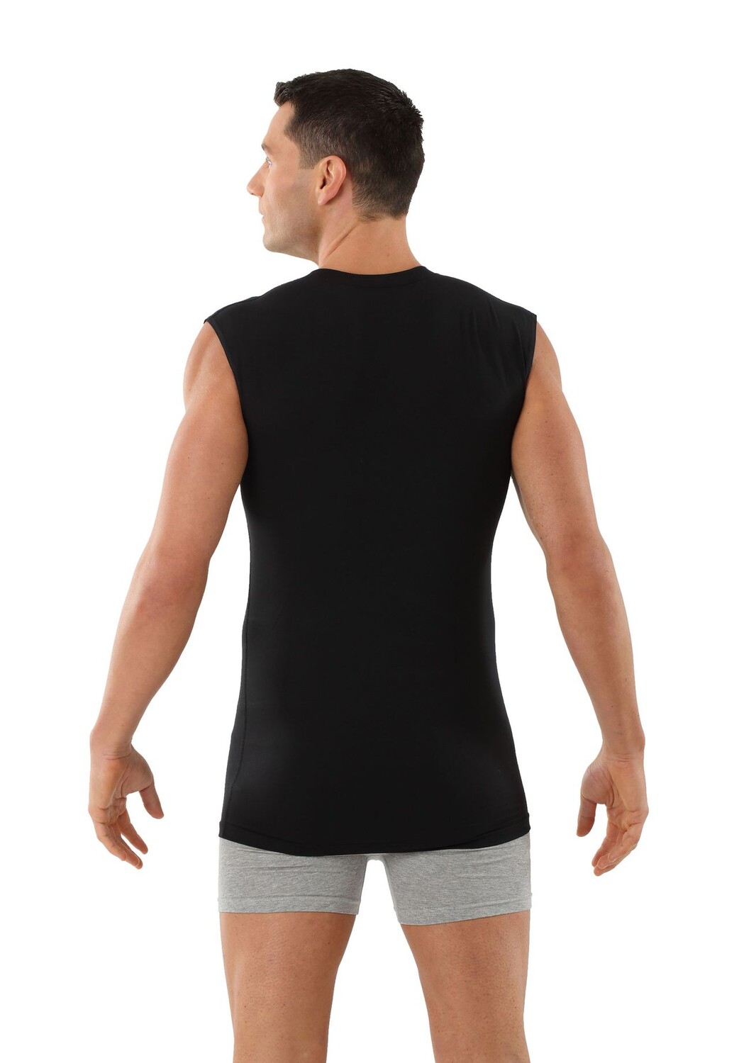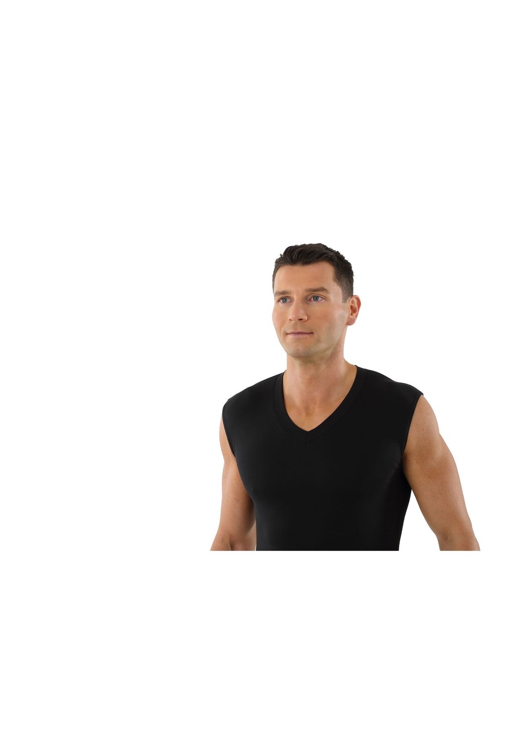 Описание товара: Мужская майка ALBERT KREUZ из тончайшего эластичного хлопка без рукавов с V-образным вырезом черного цвета. Эта майка из серии «Гамбург» изготовлена ​​с особой тщательностью из прохладного, дышащего хлопка. Благодаря низкому содержанию эластана идеально облегает фигуру. Майка имеет типичный V-образный вырез ALBERT KREUZ, который немного ниже обычного. Это означает, что верхнюю пуговицу рубашки или рубашки-поло можно носить расстегнутой, при этом нижняя рубашка не будет выглядывать из-под воротника. Пройма расположена точно под швом рукава рубашки и поэтому закрыта рубашкой. На рубашке нет неприглядных типичных бретелей или рукавов, проглядывающих сквозь рубашку. Приталенный крой гарантирует, что нижняя рубашка не мнется и облегает фигуру. Он имеет очень длинный и тонкий крой.