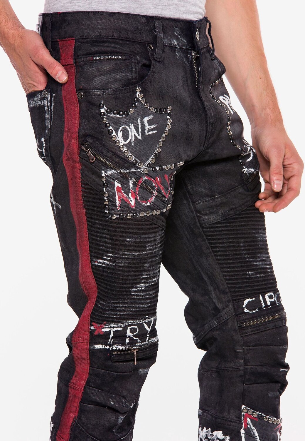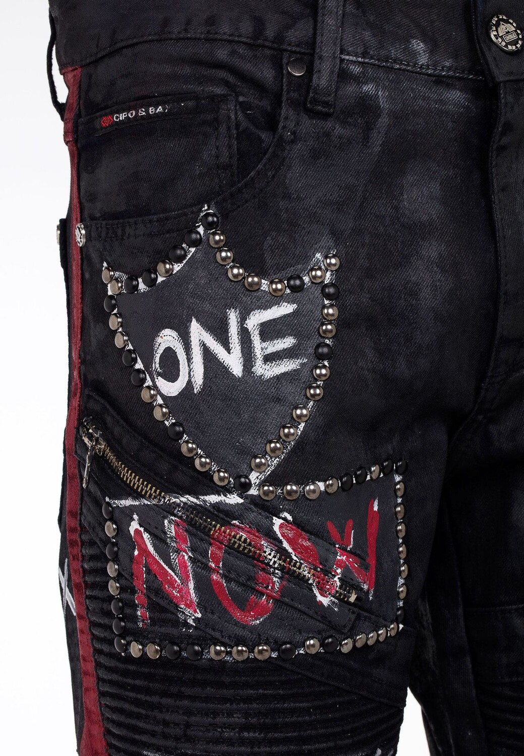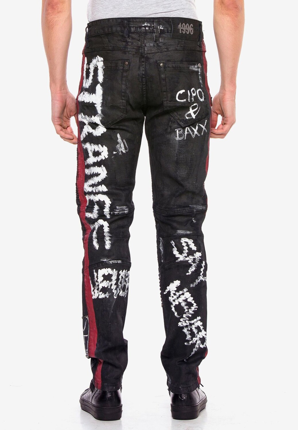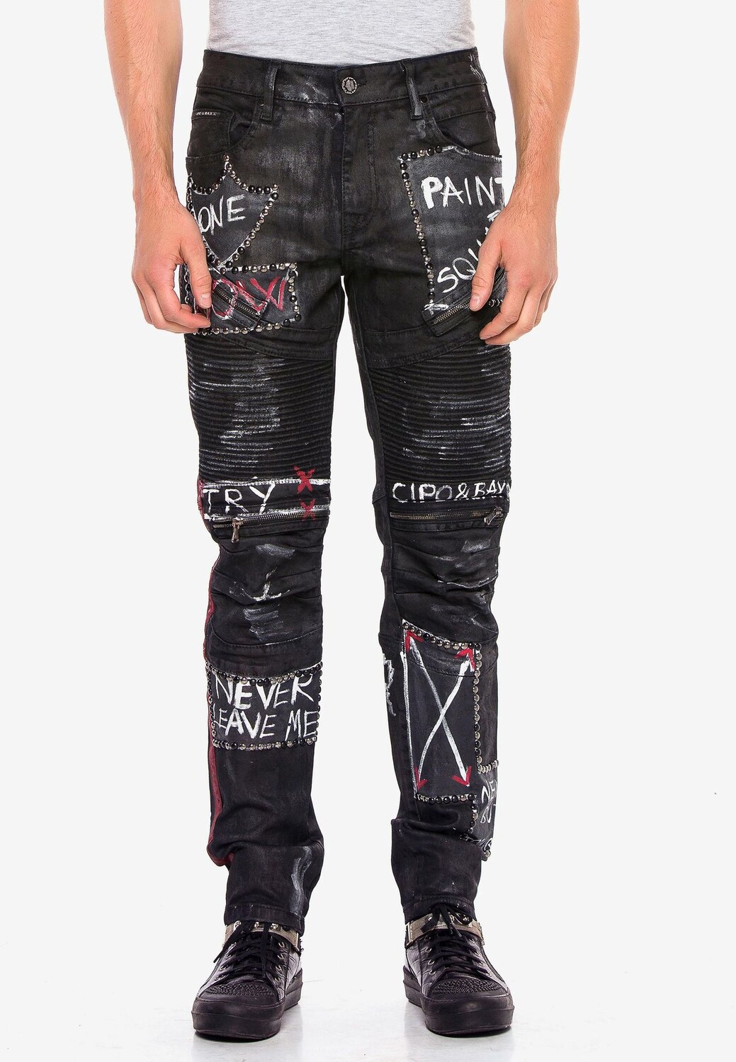 Модные мужские джинсы прямого кроя от бренда Cipo & Baxx имеют отличный крой и поэтому отлично подойдут на любой случай жизни. Он изготовлен из прочного материала и удобен в ношении благодаря производству из чистого хлопка. Она становится изюминкой благодаря классным надписям по всей поверхности, заклепкам и декоративным швам, которые сразу привлекают внимание и делают модель особенной.