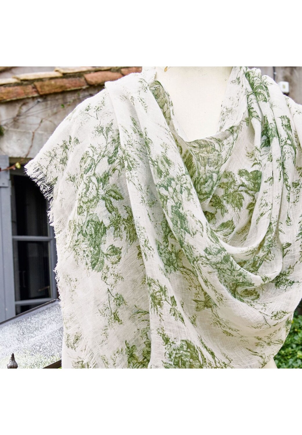 Особенности Неподвластный времени красивый узор Toile de Jouy Натуральная льняная ткань Легкая и воздушная, которую можно носить без украшение зеленый/белый Размеры: Всего: ширина 70 см, высота 180 см