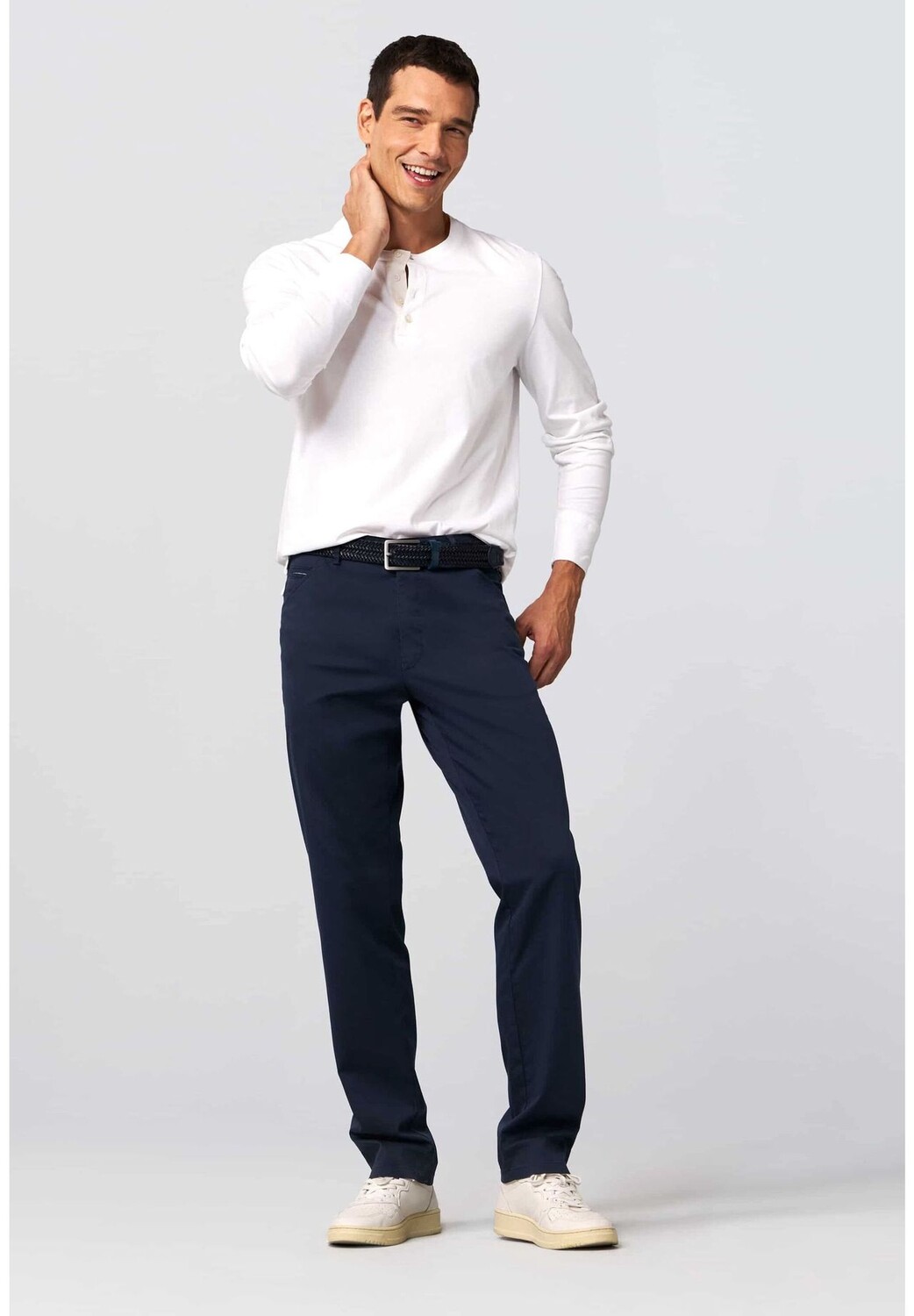 Особенности Спортивные диагональные карманы с дополнительным карманом для монет справа Задние карманы с декоративной стежкой и пуговицами Экологично произведено в Европе Современный крой Растягивается в двух направлениях Содержимое упаковки (шт.): 1 Застежка: Застежка на пуговицы Свойства материала: Дышащий, простой в уходе Стиль: Элегантный Покрой: Прямой Длина: Длинный Высота талии: Средний