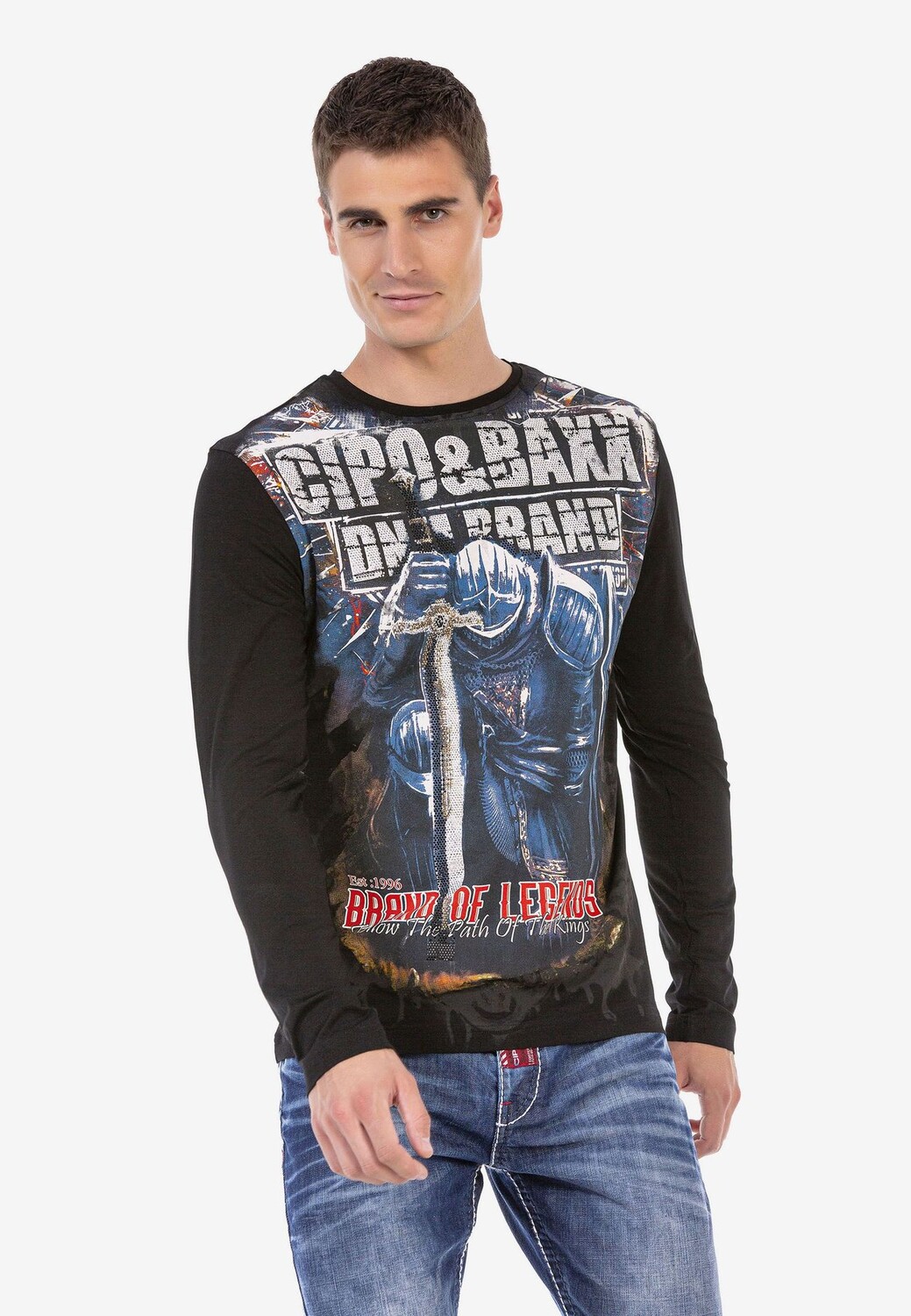 Особенности Отличная рубашка с длинными рукавами от Cipo & Baxx С средневековый принт спереди Большой фирменный принт на спине Легко сочетается с любым нарядом С классическим круглым вырезом Примечание по размеру: Вещь идет нормально Вырез: Круглый вырез Длина рукава: Длинный рукав