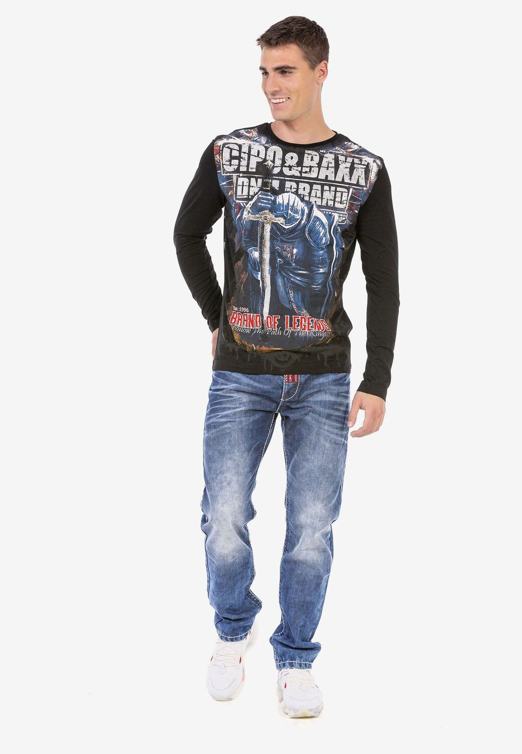 Эта мужская рубашка с длинными рукавами от Cipo & Baxx пользуется модной популярностью – этому способствуют крупные принты спереди и сзади. Модель украшена крупным рыцарским мотивом спереди и огромным фирменным принтом сзади, что делает ее изюминкой. Классический круглый вырез горловины и эластичные манжеты обеспечивают идеальную посадку, а ткань из хлопка и эластана обеспечивает максимальный комфорт.