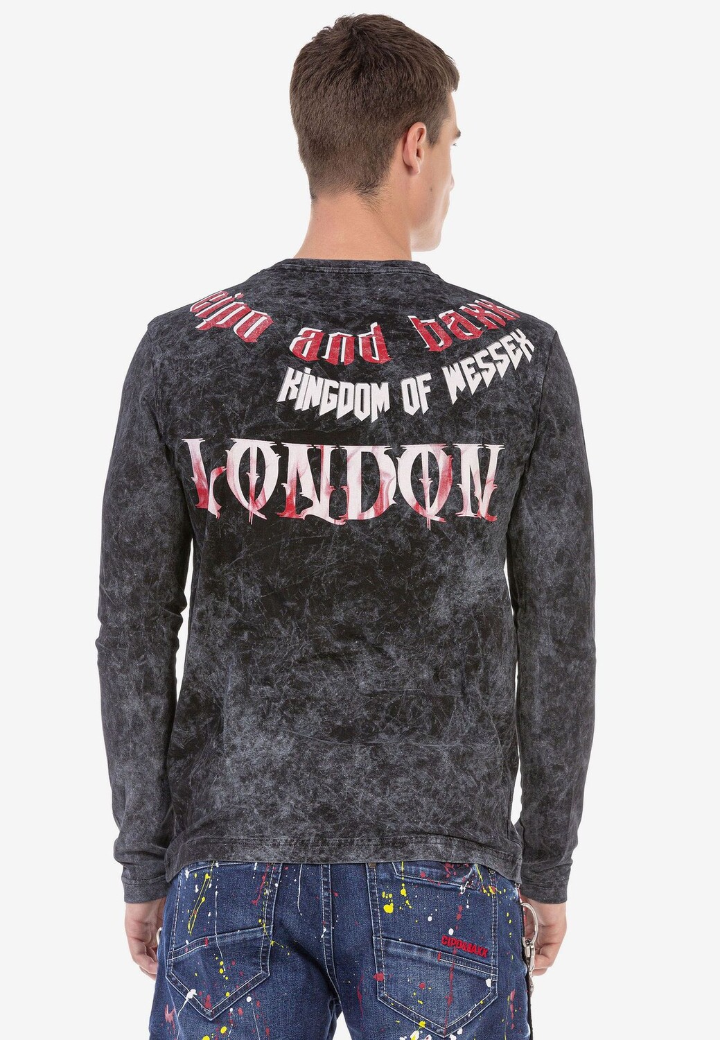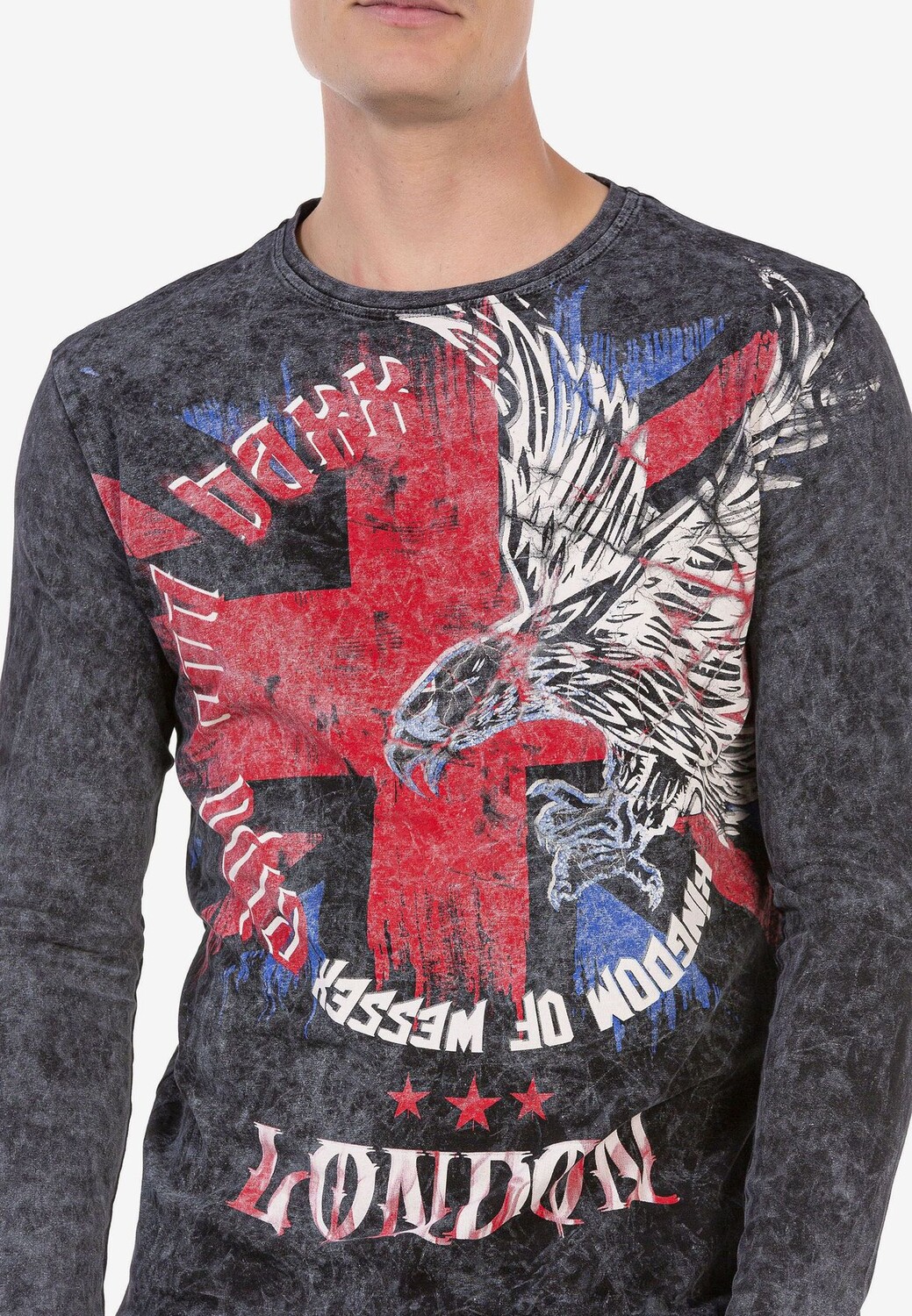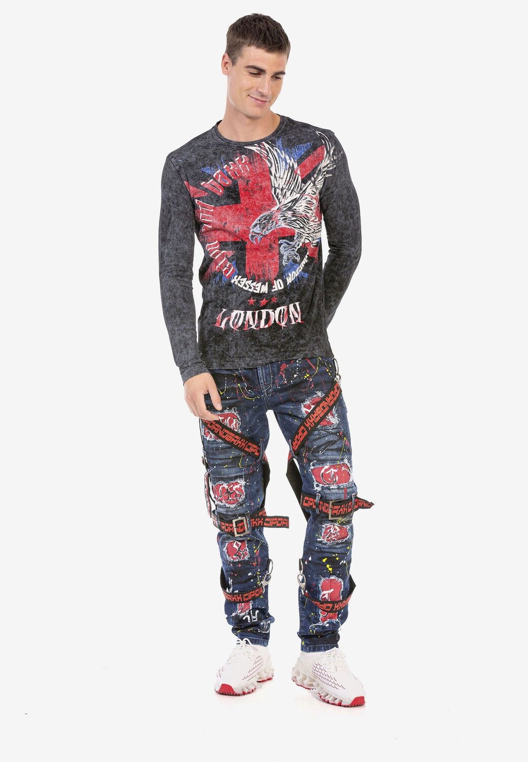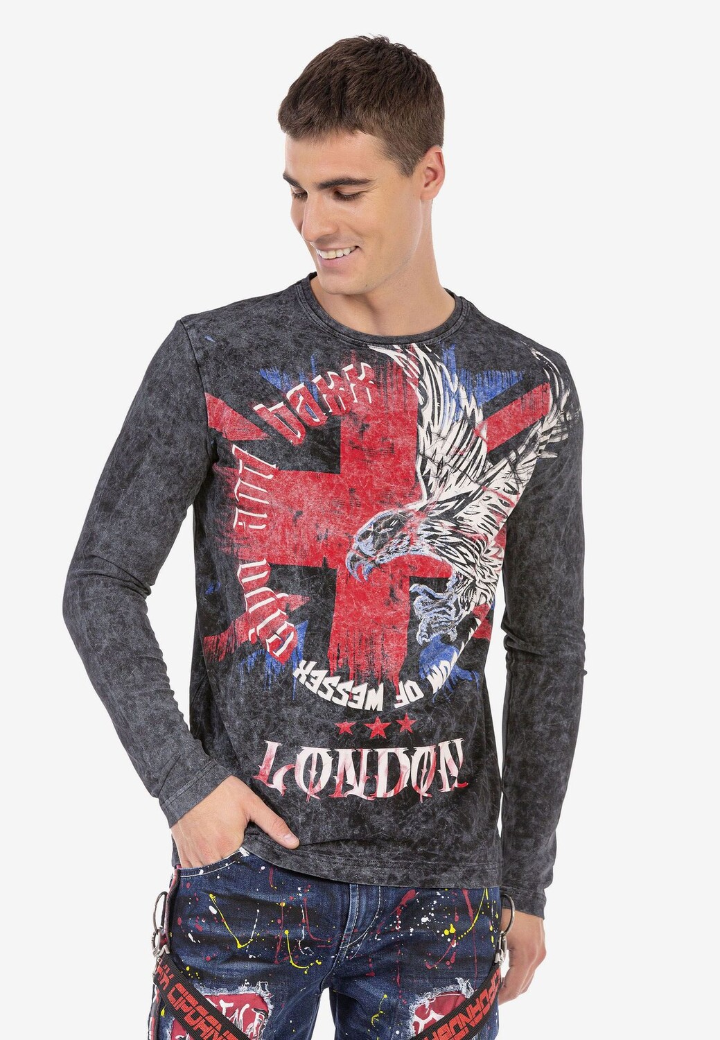 Эта мужская рубашка с длинными рукавами от Cipo & Baxx пользуется модной популярностью. Это обеспечивается крупными принтами спереди и сзади, которые привлекают внимание элементами орла, креста и Лондона. Выполненная из хлопка с содержанием эластана, модель абсолютно удобна в ношении. Оно имеет классический круглый вырез и станет ярким акцентом в холодные дни.