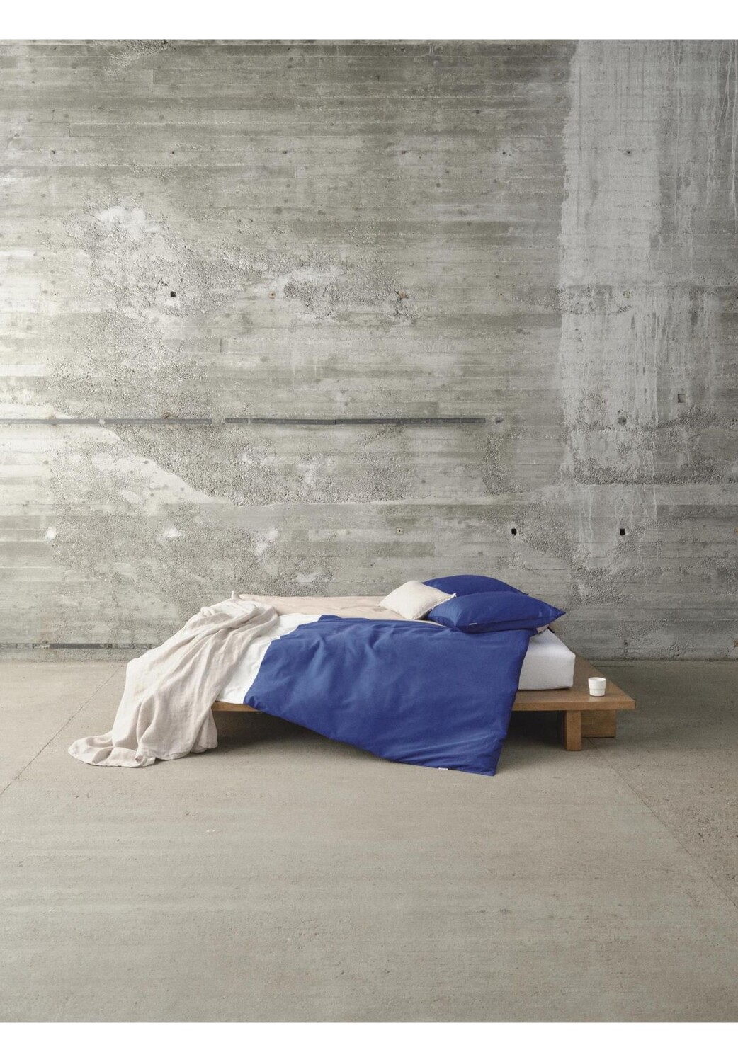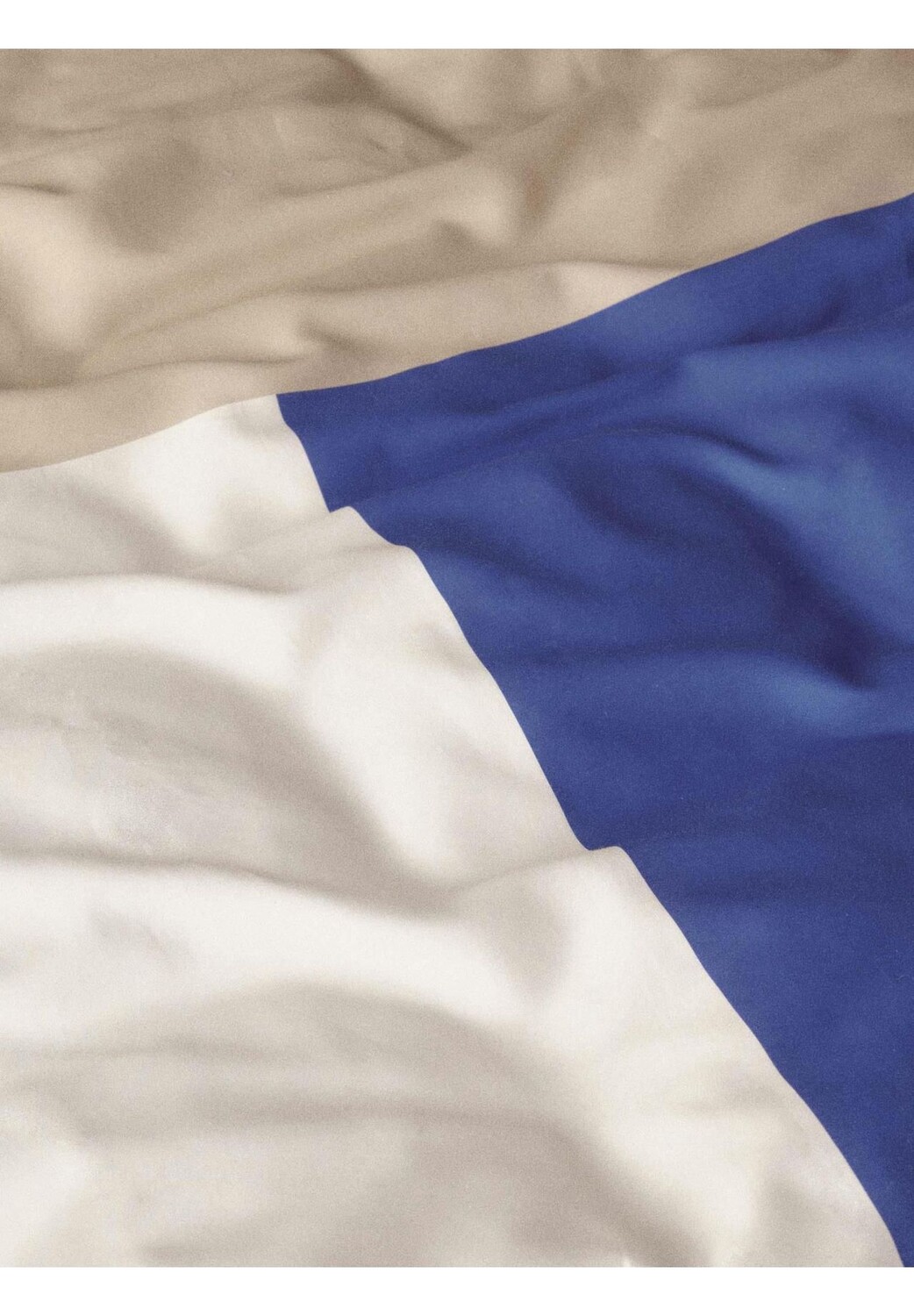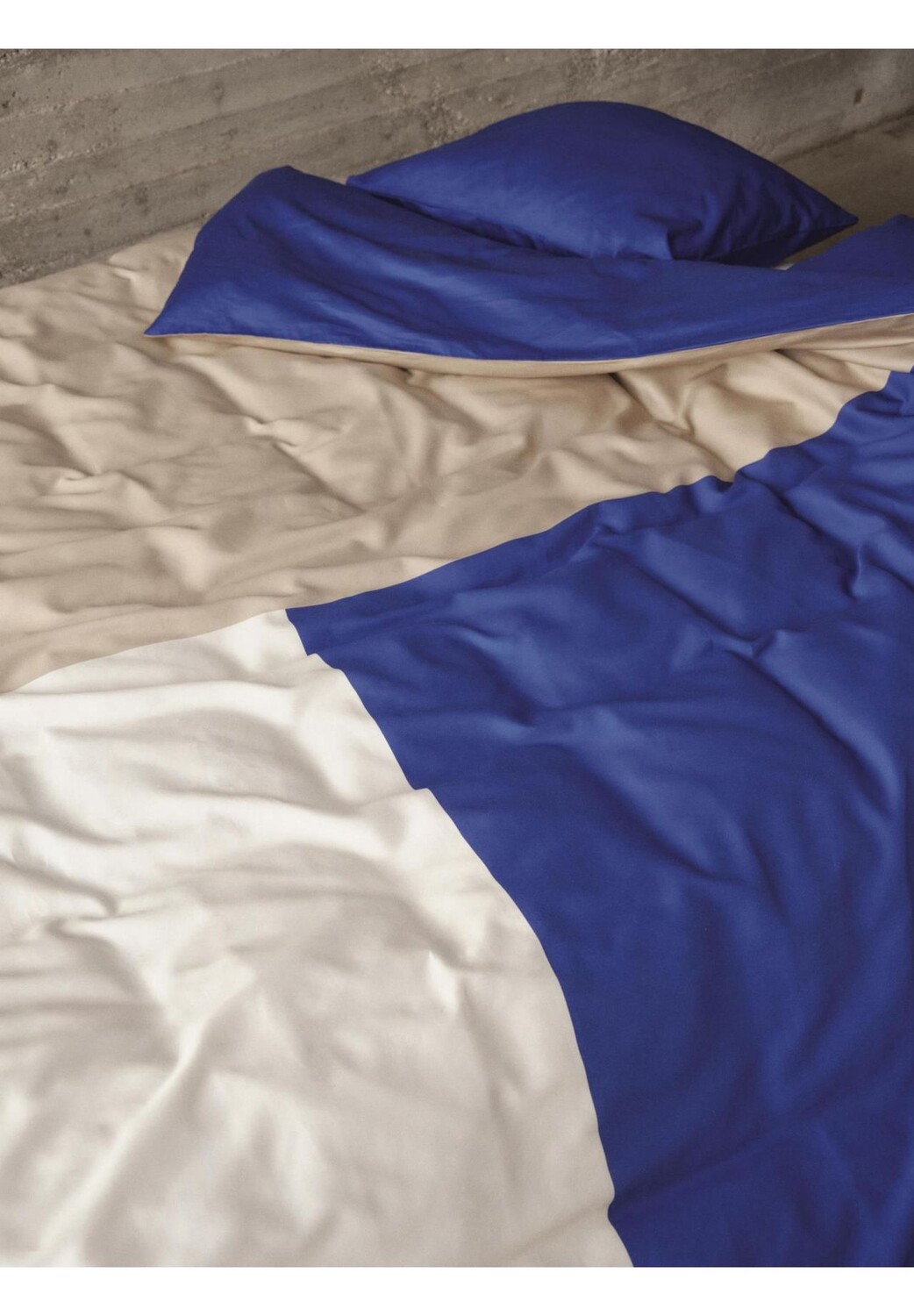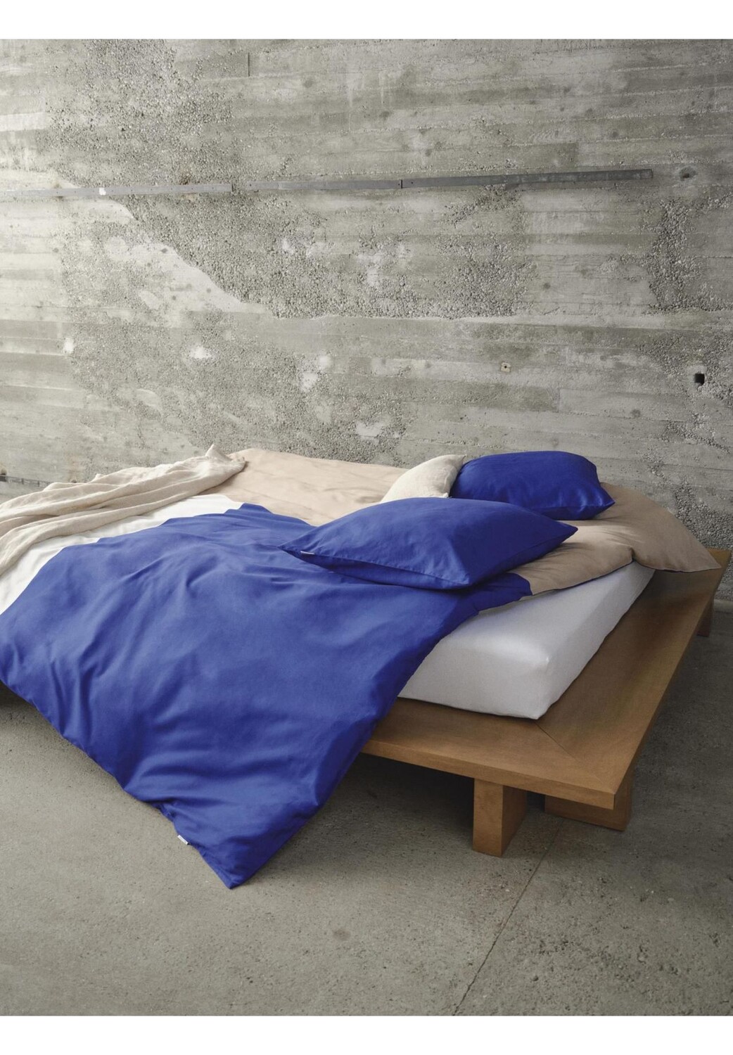Смелая современность. Тонкий сатин из органического хлопка, сертифицирован GOTS. Чистый органический хлопок идеально подходит для постельного белья, поскольку он мягкий, эластичный и в то же время дышащий. С обширной цветовой блокировкой с одной стороны, холодным кобальтом в сочетании с нейтральными песочными тонами. Задняя часть — простой кобальт.