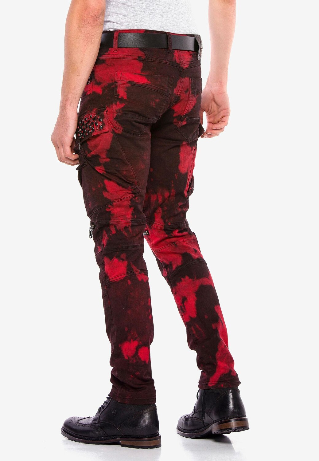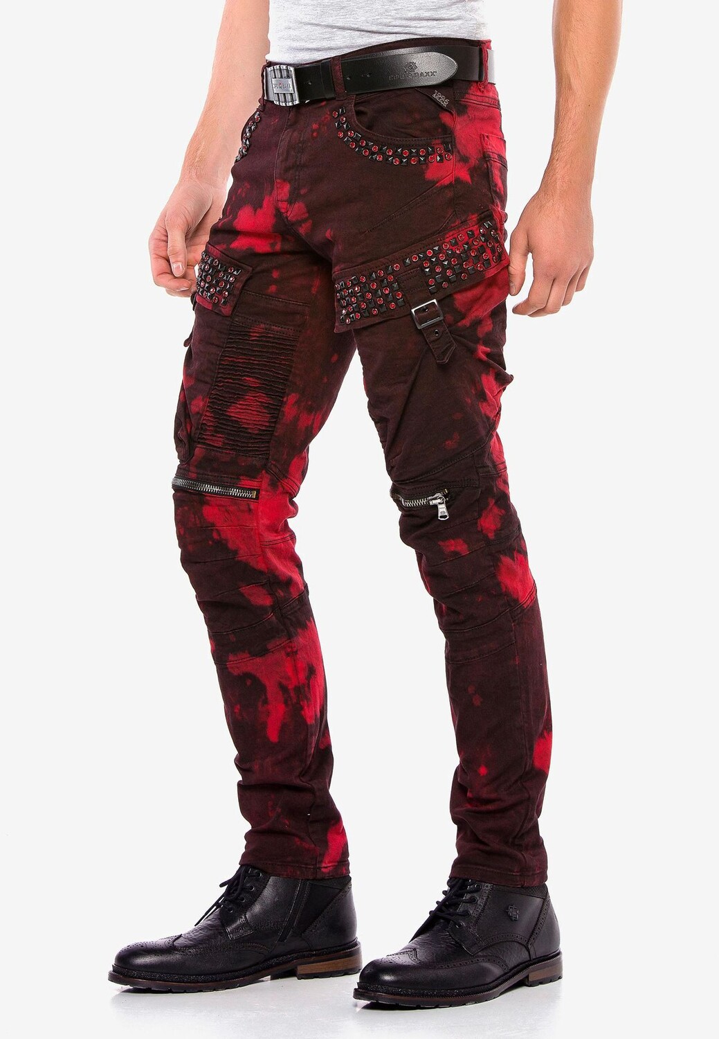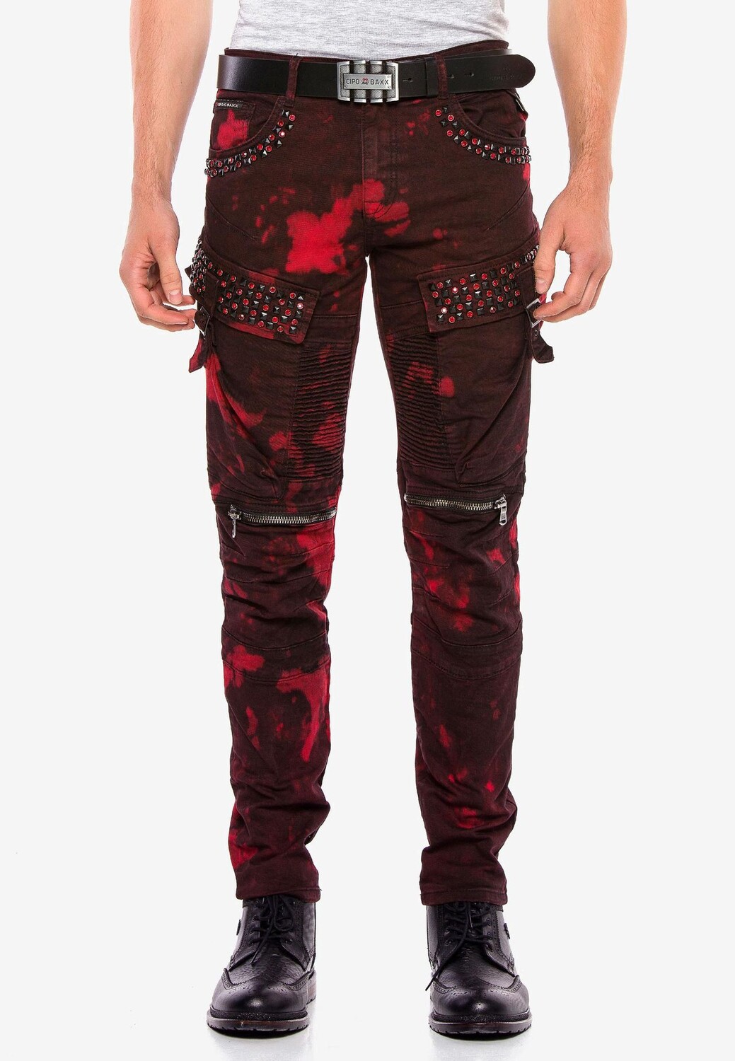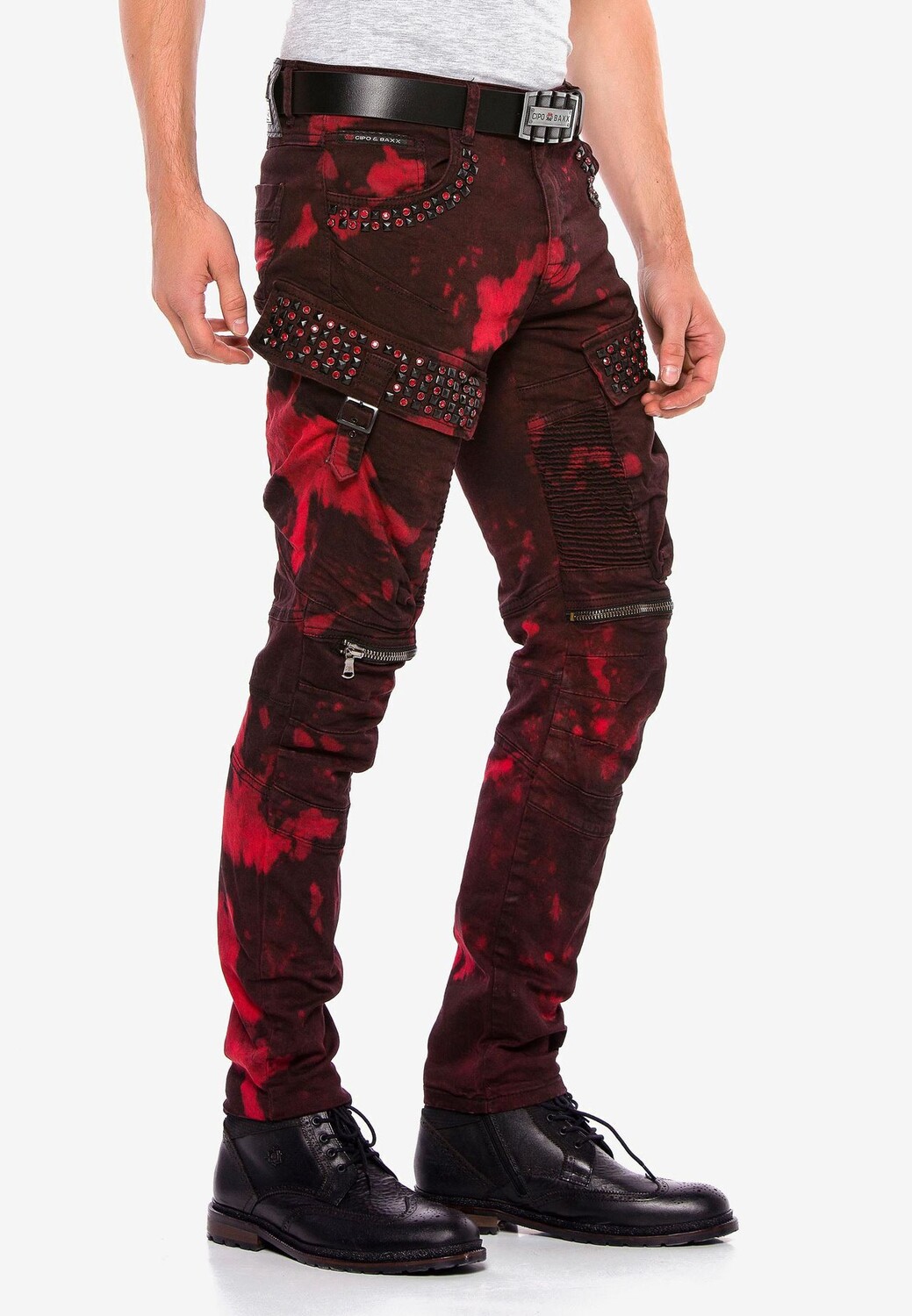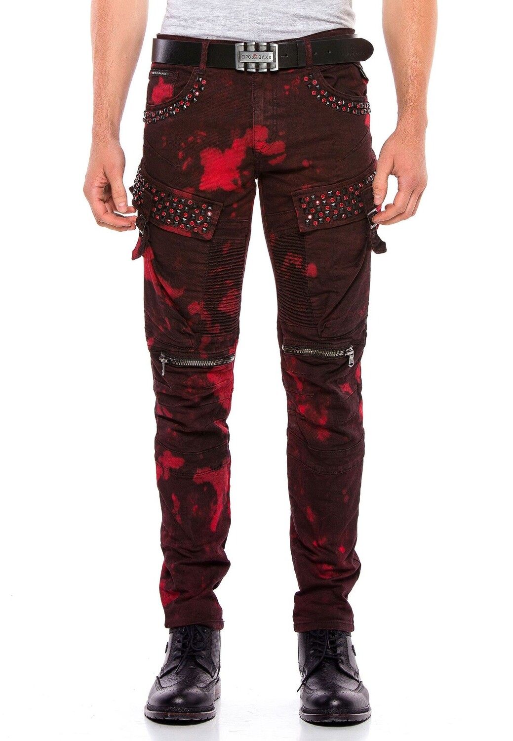 В этих дизайнерских мужских джинсах прямого кроя от Cipo & Baxx есть все. Он выполнен по высоким стандартам с гламурными байкерскими и панковскими элементами, накладными карманами-карго с застежками в армейском стиле с эффектом тай-дай и мужественными байкерскими швами от туловища до колен. Он также оснащен ребристыми швами и декоративными молниями, пирамидальными заклепками, яркими драгоценными камнями и нашивкой из искусственной кожи с логотипом компании. Металлические аппликации Cipo & Baxx идеально дополняют дизайн.