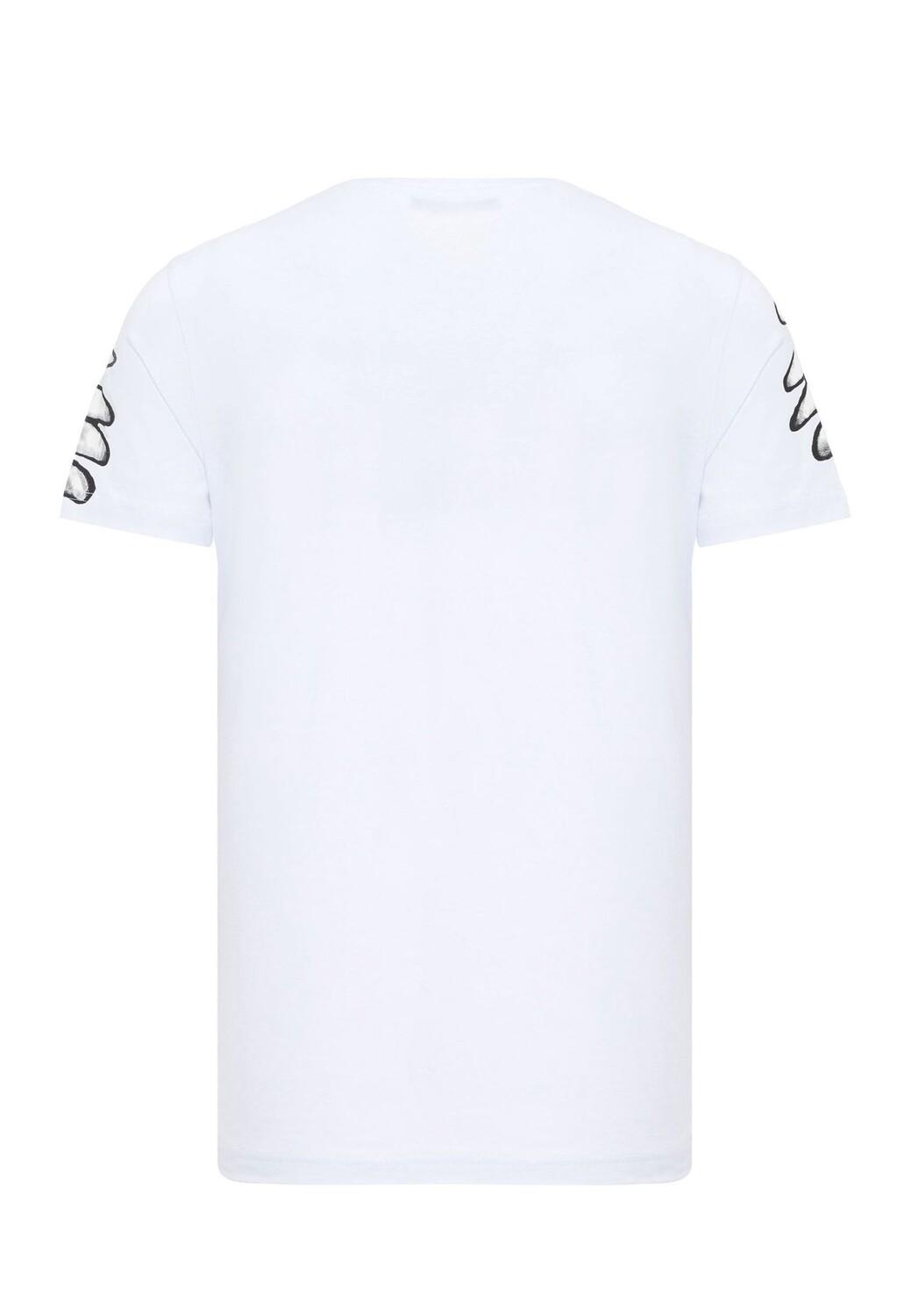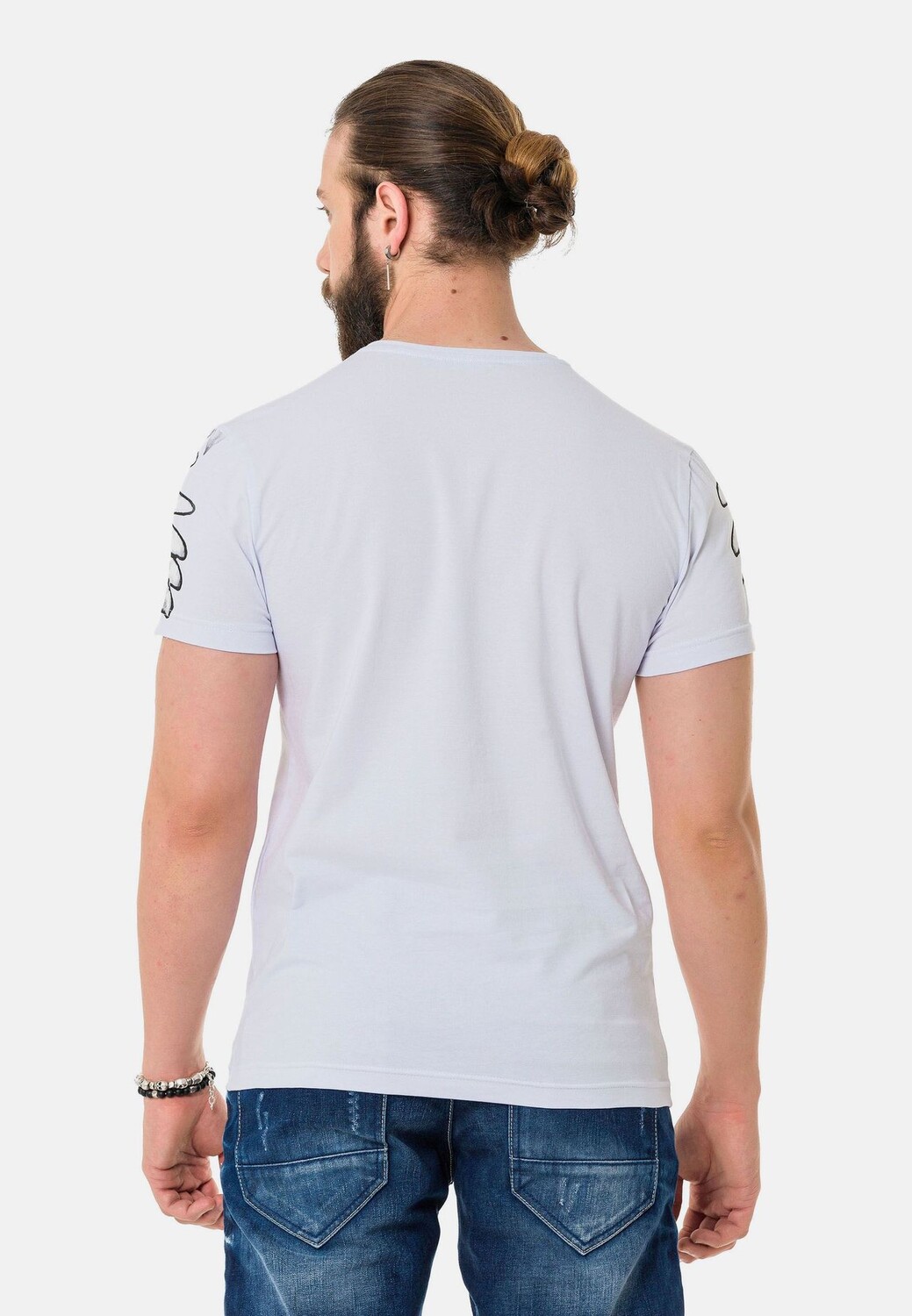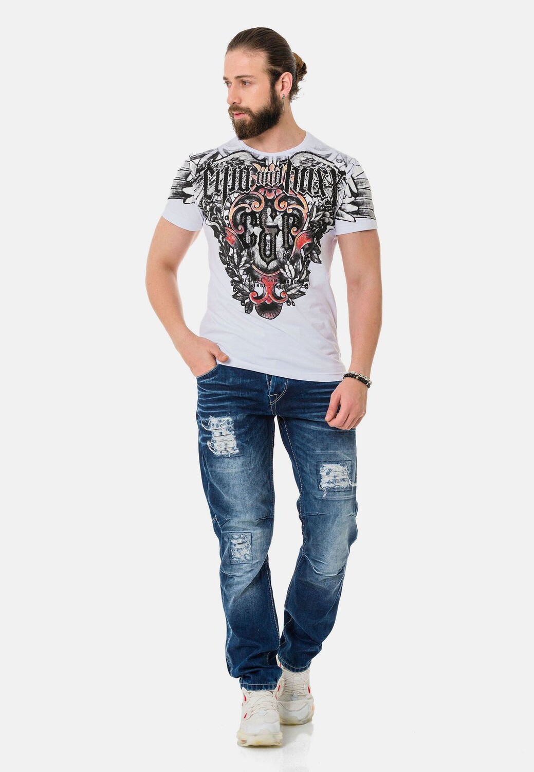Особенные характеристики Модная футболка от Cipo & Baxx для мужчин Высокое содержание хлопка для идеального комфорта при ношении Особенно удобный классический круглый вырез Классный принт спереди со сверкающими деталями из стразов в качестве акцента Можно комбинировать разными способами для создания повседневного образа Примечание по размеру: Изделие работает нормально Длина рукава: длинный рукав