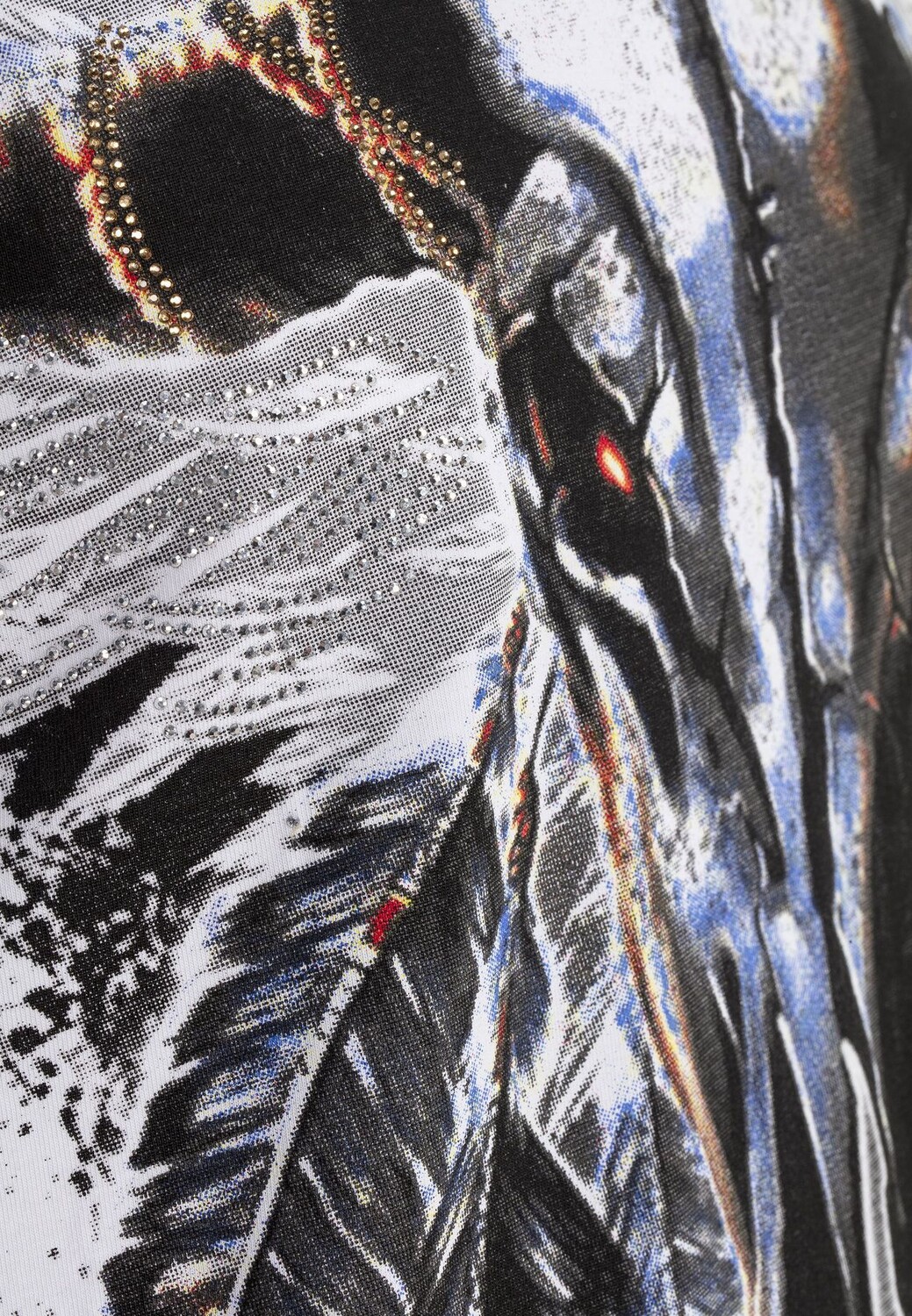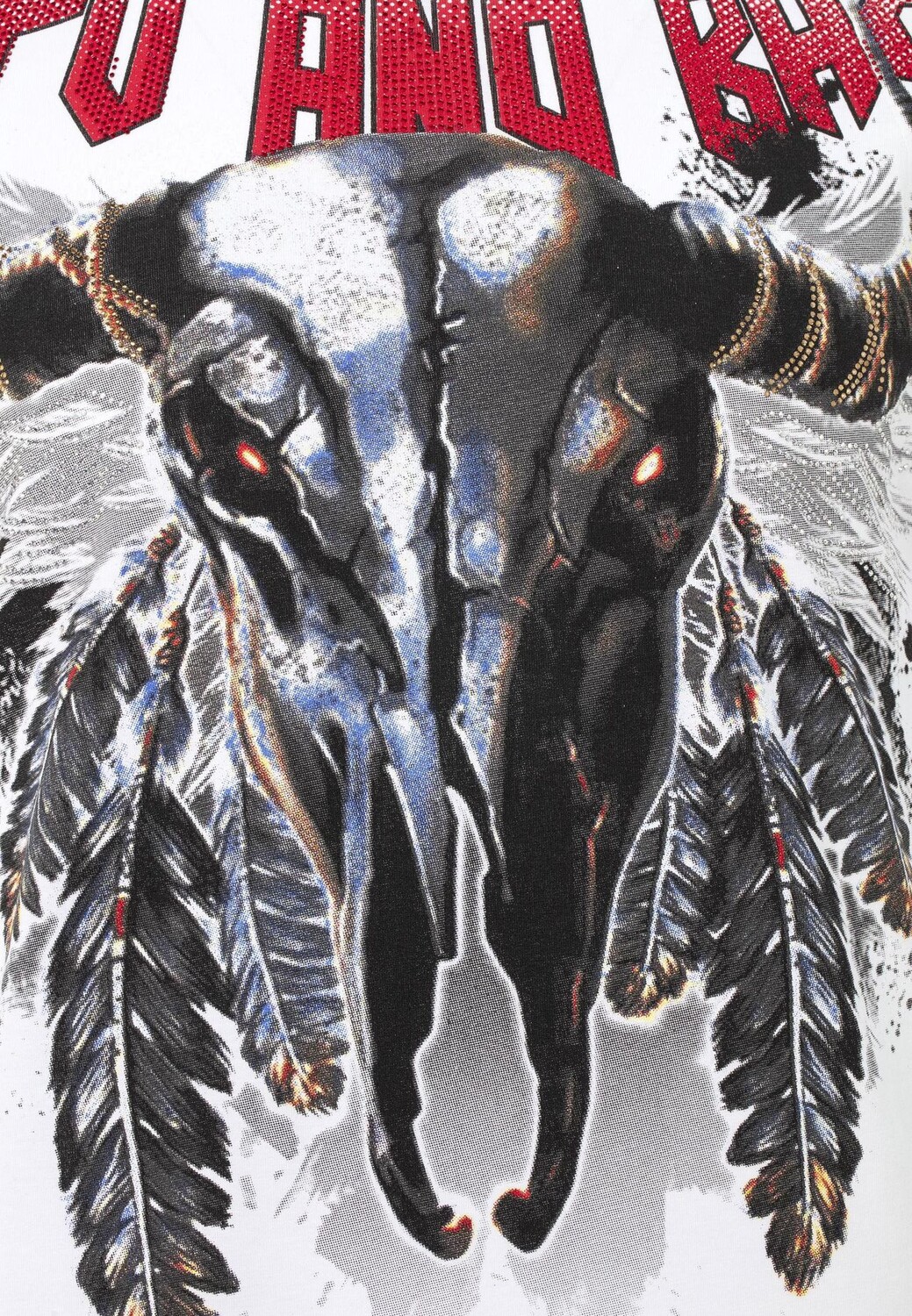 Эта рубашка с длинными рукавами от Cipo & Baxx мужественна и в то же время экстравагантна. Большой принт в виде черепа быка украшает переднюю часть рубашки и с элементами перьев напоминает крутой стиль бохо аборигенов. С другой стороны, большой эффектный логотип бренда украшен блестящими стразами, которые придают рубашке завершающий штрих. Классный образ для осени и зимы, который гарантированно будет принят хорошо.