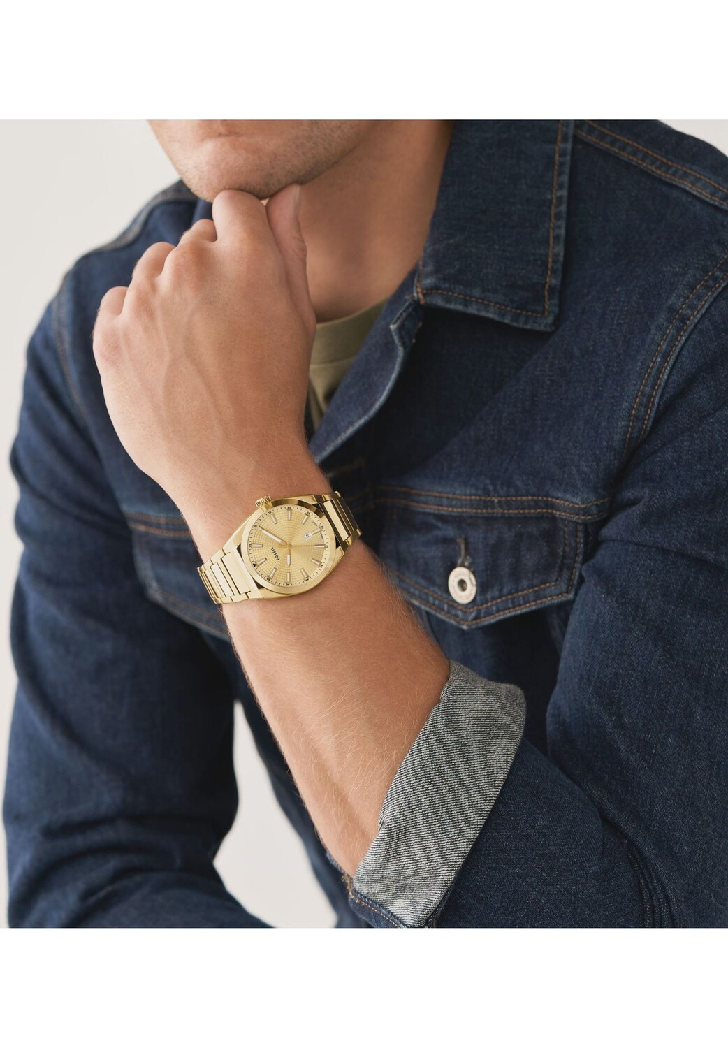 Эти мужские наручные часы марки FOSSIL из серии EVERETT станут верным спутником на любой случай жизни. Часы оснащены кварцевым механизмом. Корпус из нержавеющей стали золотого цвета выглядит красиво. Золотой циферблат соответствует корпусу. Он отображает дату, имеет линейные индексы и окружен минеральным стеклом. Складывающаяся застежка позволяет быстро и безопасно надевать и снимать часы. Звено браслета прочно сидит на запястье. Дождь и вода при мытье рук не смогут навредить корпусу часов.