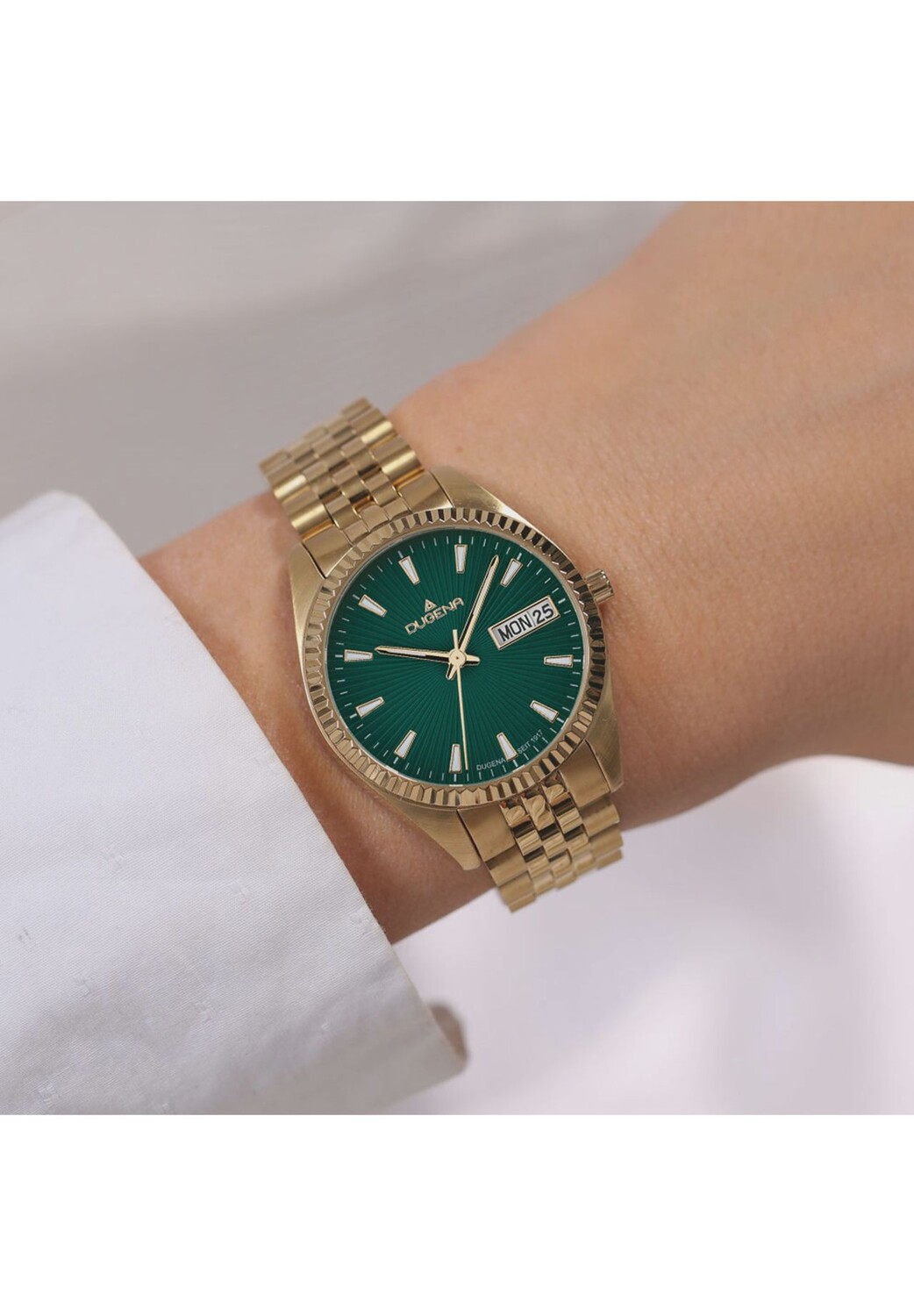 Эти наручные часы бренда DUGENA из серии VENETIA являются настоящим украшением для женщин. Часы оснащены кварцевым механизмом. Корпус золотого цвета, изготовленный из нержавеющей стали, выглядит великолепно. Использование сапфирового стекла, устойчивого к царапинам и надежно защищающего циферблат, является свидетельством первоклассного качества. Он имеет линейные индексы, а также отображает день и дату. Браслет-звено имеет раскладывающуюся застежку, поэтому он надежно и удобно сидит на запястье. Купаться, принимать душ и плавать можно без проблем благодаря водонепроницаемости до 10 бар.
