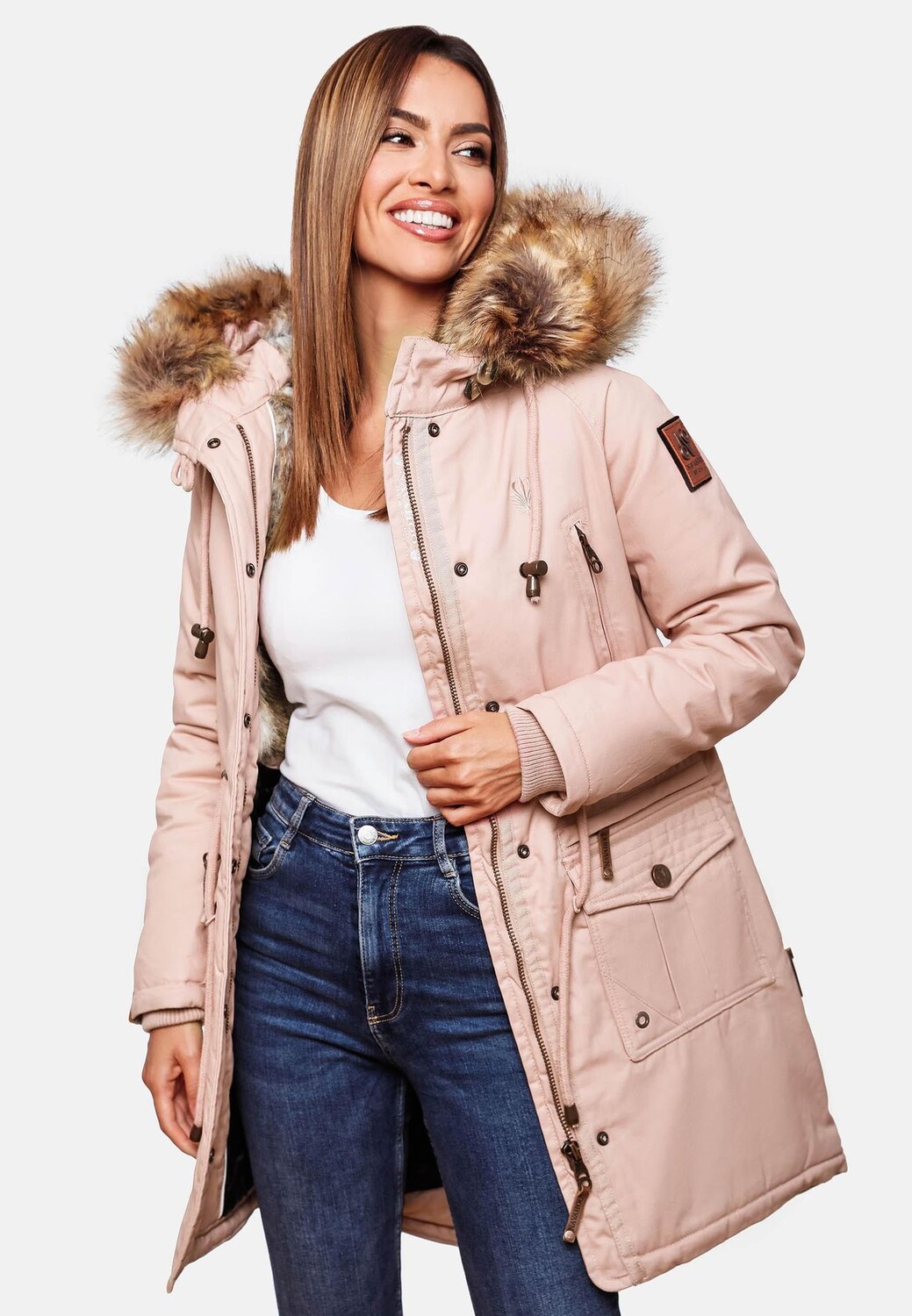 Описание товара: СМОТР: Женская зимняя парка от Navahoo с мягким большим капюшоном из искусственного меха (искусственный мех снимается) и привлекательной талией - идеальна для холодного времени года (осени и зимы)! МАТЕРИАЛ: Короткое пальто из нескользящего хлопкового внешнего материала, теплая внутренняя подкладка внизу с модной стежкой в ​​клетку, сверху с пушистым искусственным мехом, очень удобная в ношении. Подходит: парка для отдыха на открытом воздухе красивого кроя, с кулиской на талии и идеальная длина примерно до середины бедра с вырезом «ласточкин хвост» (длиннее сзади), подчеркивает фигуру. ДЕТАЛИ: Мягкая, теплая набивка, карманы с клапанами на подкладке (для предотвращения холода рук), стильная потайная планка на кнопках, эластичная резинка. Трикотажные манжеты, толстые шнуры. Это женское пальто на теплой подкладке – настоящий универсал для холодного времени года – модный стиль для активного отдыха! Теплое зимнее полупальто с капюшоном из искусственного меха от Navahoo Parka, выполненное с большим вниманием к деталям.