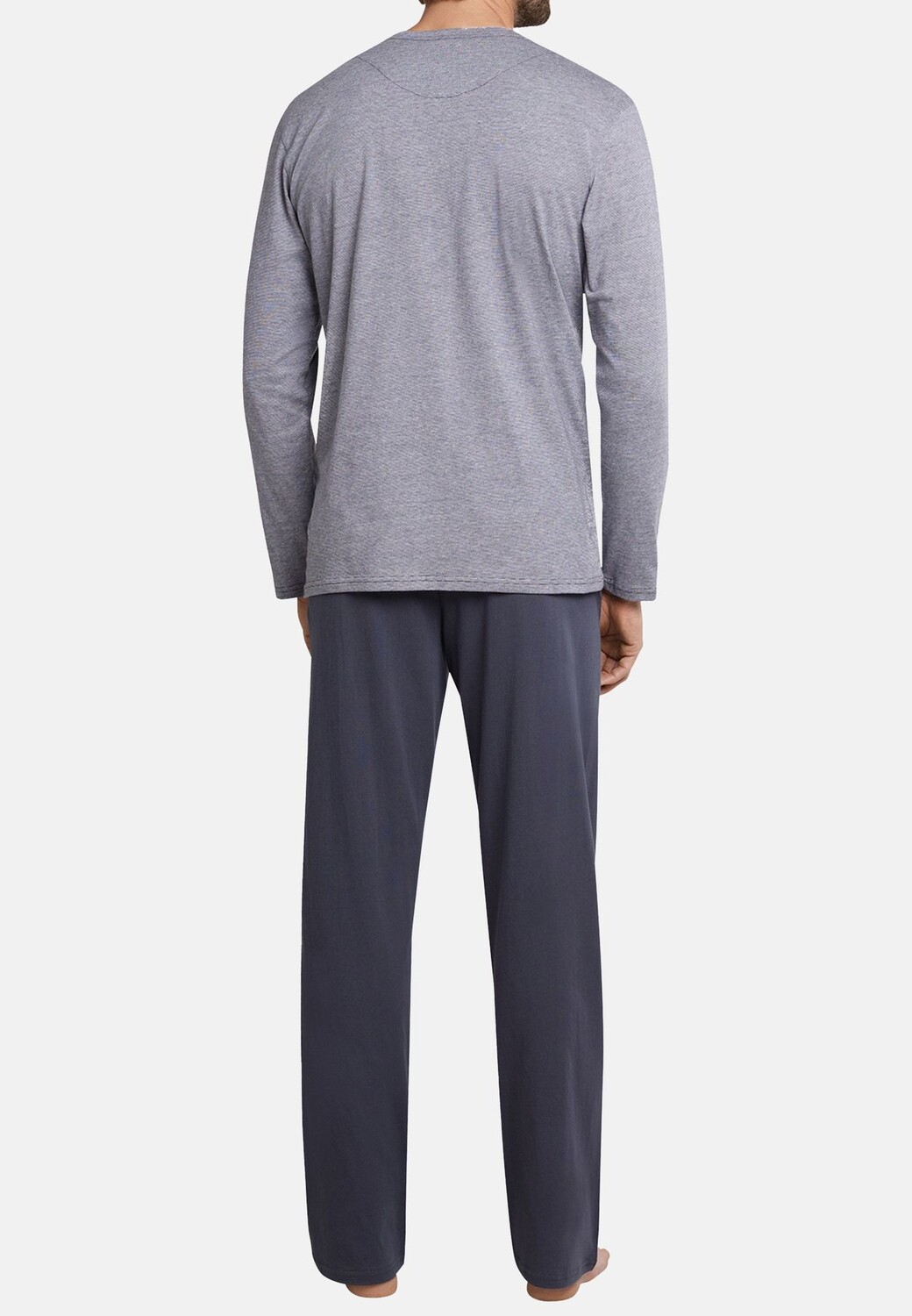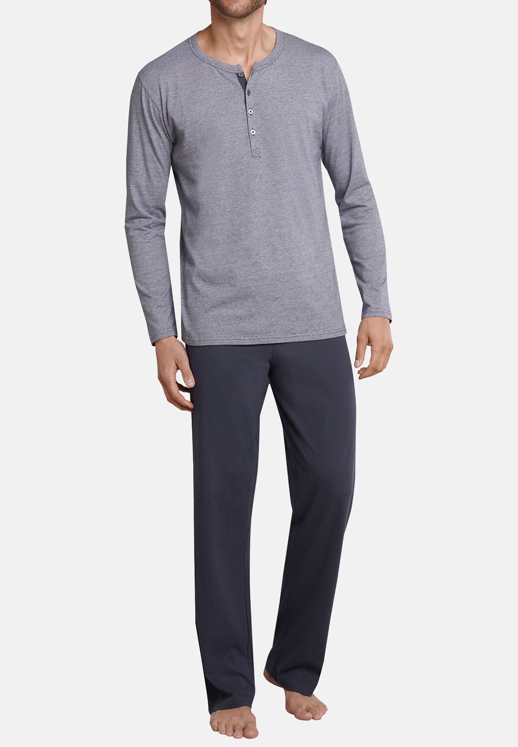 Длинная пижама с планкой на пуговицах. Эти длинные пижамы спортивного вида, изготовленные из 100% мягкого хлопка, привлекают взыскательных мужчин. Воротник Serafino с планкой на пуговицах придает топу с серыми и белыми тонкими полосками изящную деталь, которая гармонично сочетается с длинными серыми брюками. Свободный, легкий одинарный трикотаж берет на себя удобную часть и делает костюм-двойку особенно комфортным. То, что нужно мужчинам, которые предпочитают наслаждаться спокойными ночами в лучшем качестве!