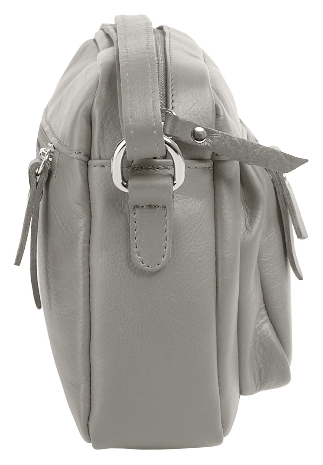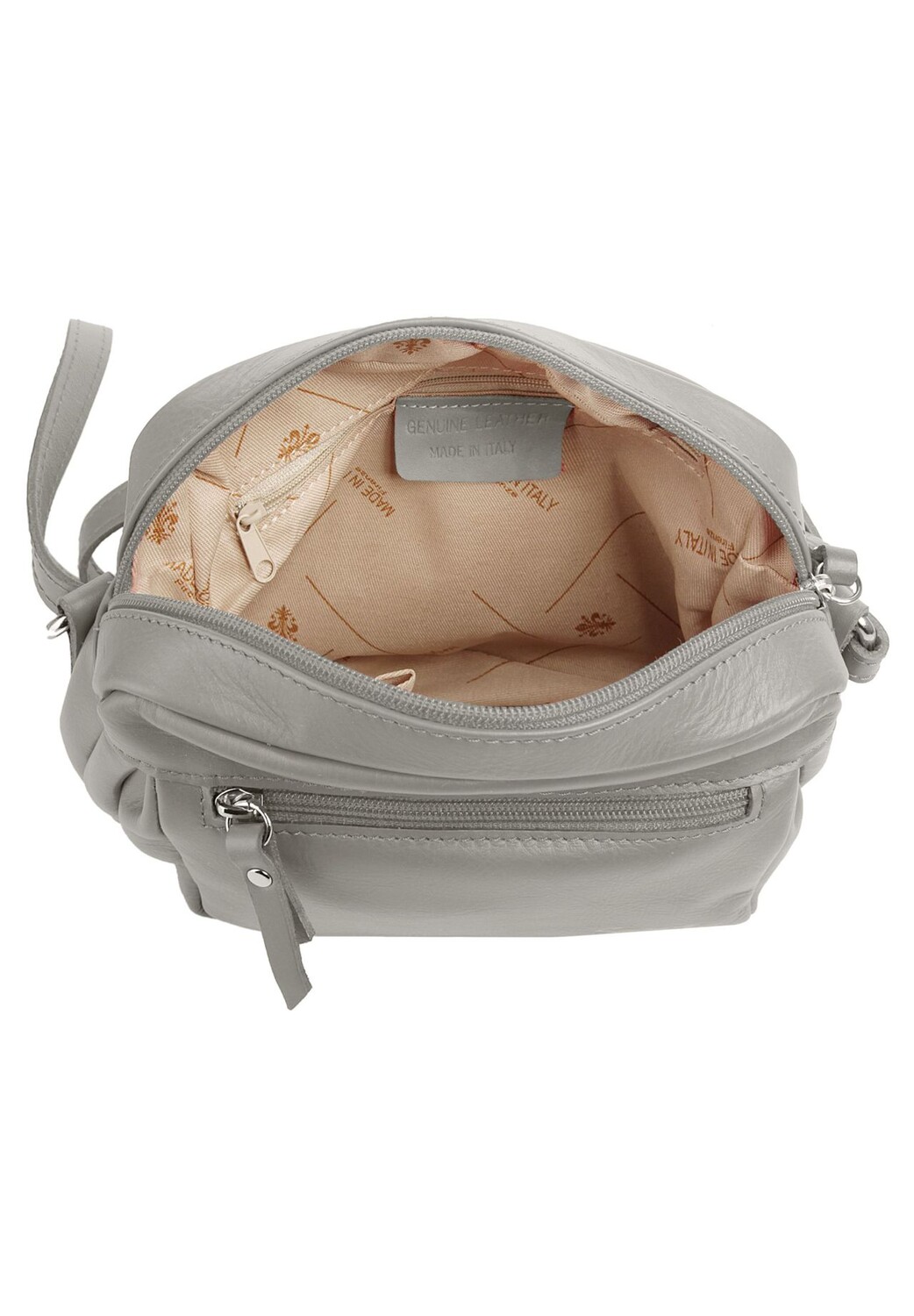 Особенности 300 г Сделано в Италии Высота 18 см x ширина 23 см x глубина 5 см Сделано в Италии 100% воловья кожа 1 отделение для смартфона внутри (до 6 дюймов) 1 регулируемый плечевой ремень (70–140 см) Цвет: серый