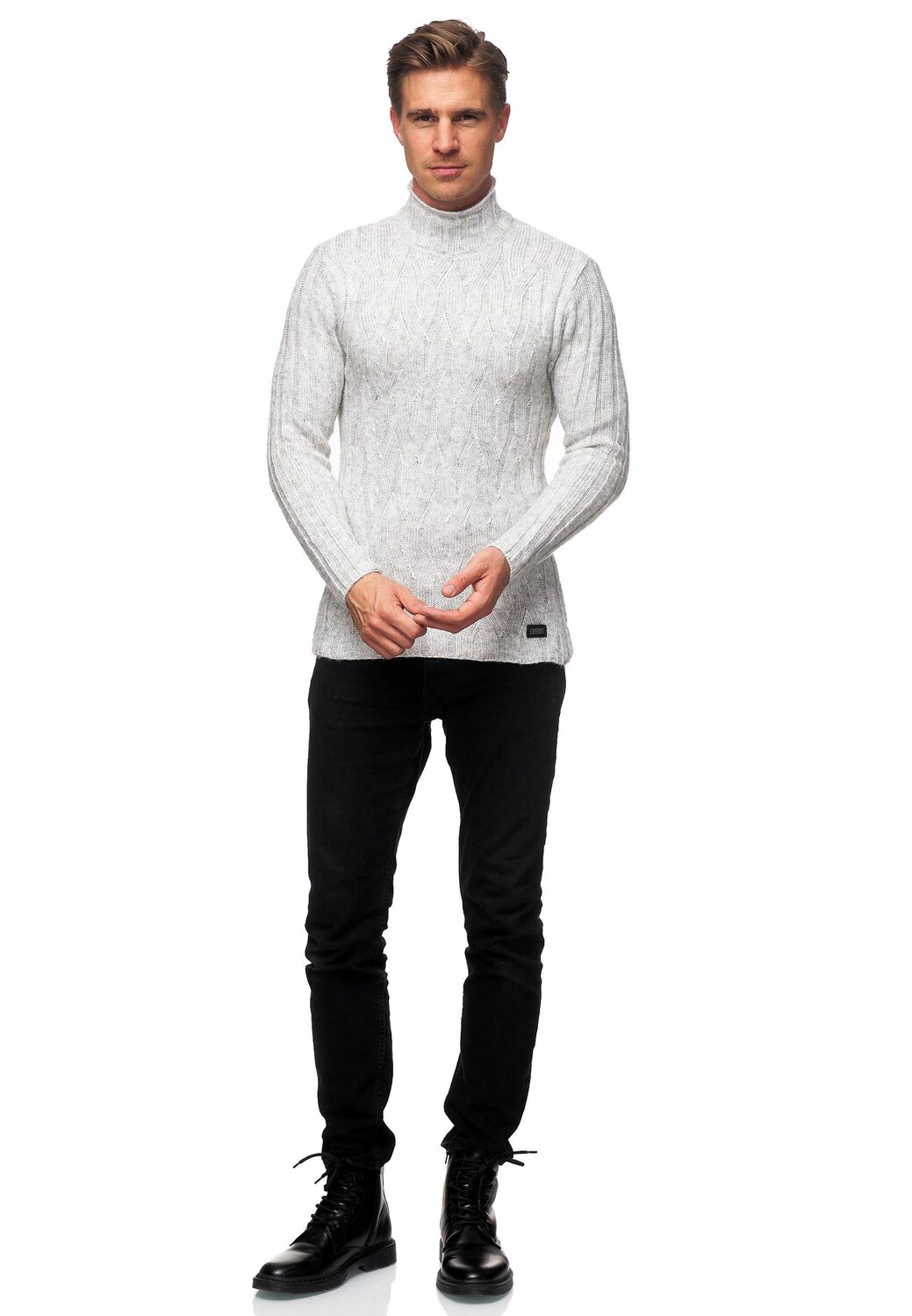 Модный вязаный мужской свитер от Rusty Neal впечатляет утепляющим воротником-стойкой. Свитер, выполненный из мягкого сочетания материалов, обеспечивает абсолютно удобную посадку. Модель имеет ребристый узор на спине и тонкий плетеный узор спереди. Свитер можно легко комбинировать для создания универсальных повседневных образов. Наша модель ростом 1,85 м весит более 80 кг, носит размер М.