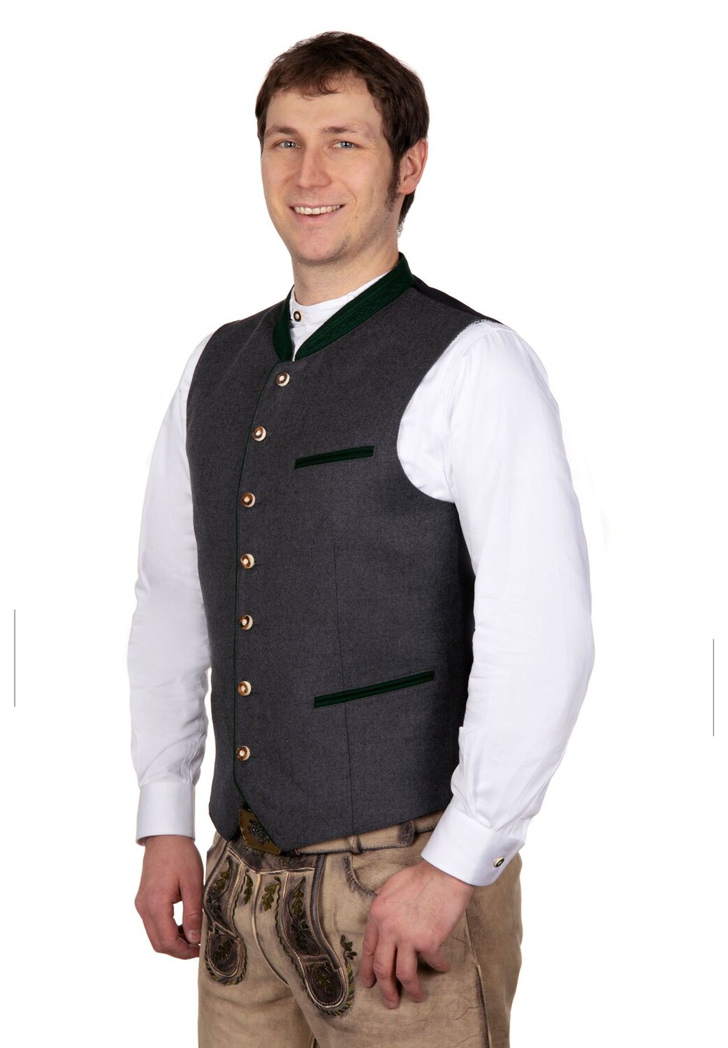 Настоящим «вечнозеленым» является традиционный традиционный жилет из серой шерсти. Высококачественная внешняя ткань серого цвета из шерсти удивительно мягкая и очень элегантная. Зеленая окантовка и изящно вышитый воротник создают красивый контраст с серым цветом. Наконец, традиционные пуговицы в виде рогов завершают классический традиционный стиль. Задняя часть выполнена в простом черном цвете и может быть скорректирована и сделана уже с помощью соответствующей ленты и пряжки. Это означает, что вы всегда можете оптимально подогнать жилет под свой размер!