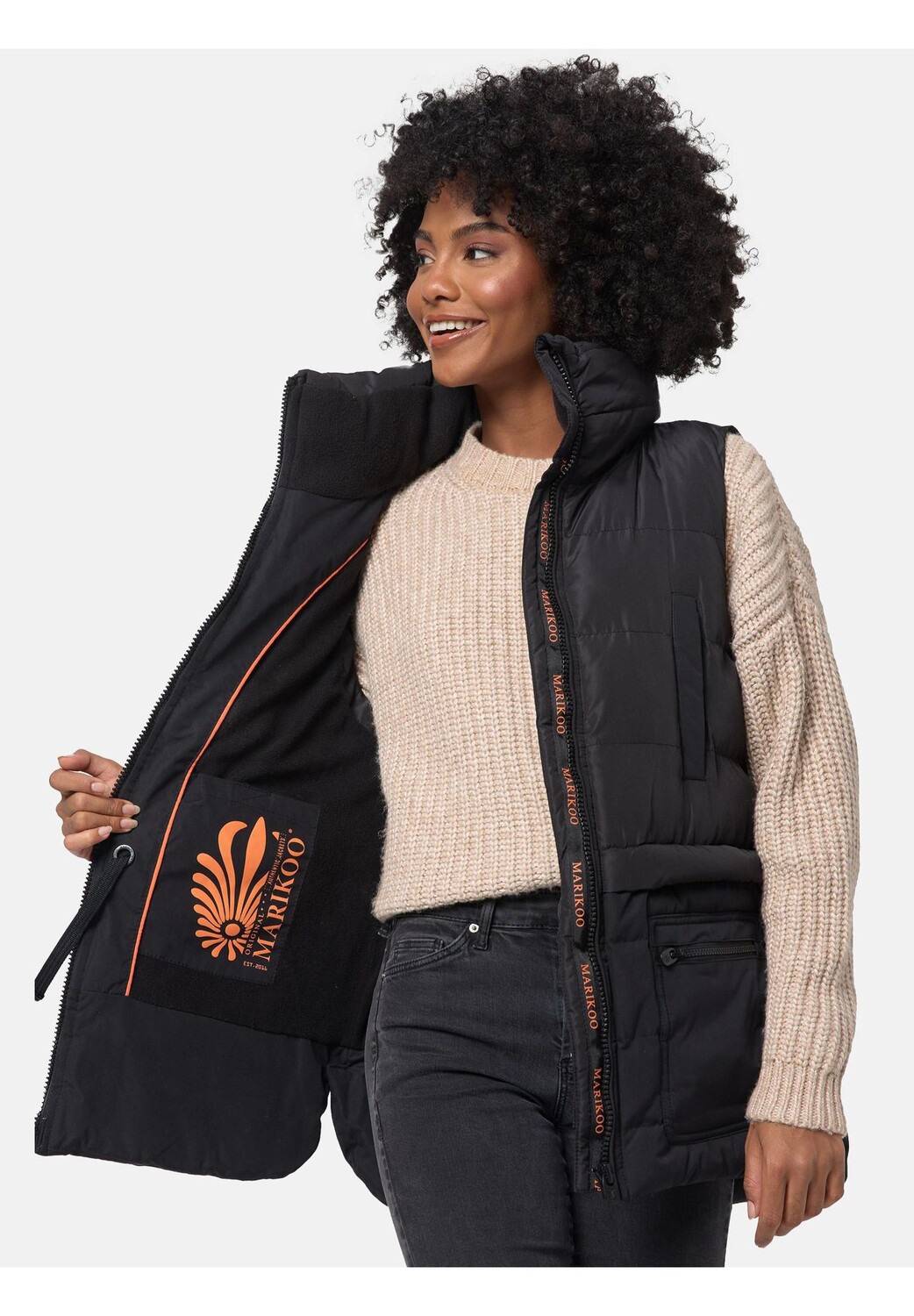 Описание товара: ВИД: Модный стеганый жилет без рукавов в модном цветовом сочетании со множеством карманов от Marikoo - идеально подходит для холодных зимних дней, а также для весны и осени! МАТЕРИАЛ: Женский жилет из сверхмягкого водоотталкивающего наружного материала, внутренняя подкладка из флиса обеспечивает ощущение суперкомфорта и тепла при ношении. ПОДХОД: Этот сверхлегкий, но теплый жилет для активного отдыха имеет прямой крой (кулиска на талии с внутренней стороны). для индивидуальной регулировки) и стежка не громоздкая, стеганая куртка без рукавов с большой длиной по низу (сзади длиннее, чем спереди). ДЕТАЛИ: Высокий воротник-стойка на флисовой подкладке (защита подбородка) и многочисленные подкладки. Внешние карманы согреют вас и в то же время обеспечат достаточно места для хранения всех необходимых вам вещей, а внутренние карманы позволят вам взять с собой в дорогу (мобильный телефон, кошелек и т. д.). Эта стильная куртка без рукавов — настоящий универсал.