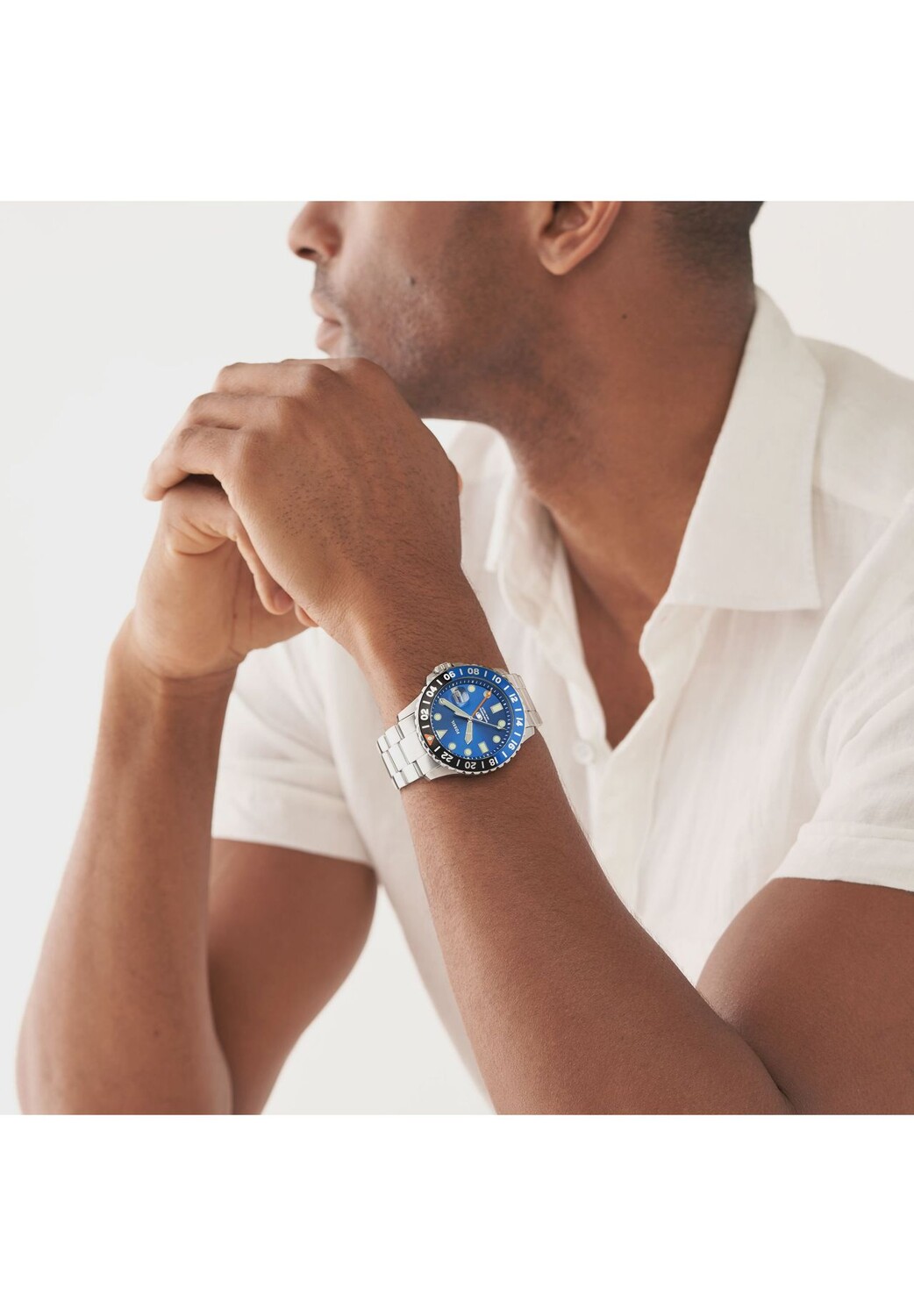 Наследие Fossil Blue продолжает жить в этом специальном выпуске GMT. Эти часы являются незаменимым аксессуаром для путешествий и позволяют сразу увидеть время с помощью легко читаемой стрелки GMT. Модель водонепроницаема до 100 метров и имеет двухцветный вращающийся безель с 24-часовым индикатором и синий циферблат с солнечными лучами. Сюда входит лента из нержавеющей стали.