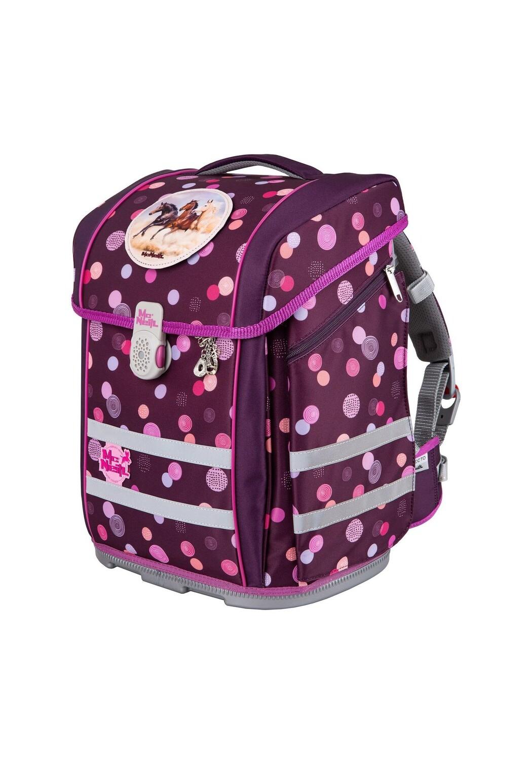 Набор школьных сумок из пяти предметов от McNeill, состоящий из школьной сумки, сумки для спортивной обуви, пенала с наполнением, пенала и съемного/сменного рюкзака McAddy, позволяющего персонализировать школьную сумку. Максимальный комфорт при ношении благодаря дышащей подкладке спинки, регулируемым по высоте лямкам, а также поясным и нагрудным ремням. Сумка имеет стильный светоотражающий магнитный замок, который закрывается очень плавно, как будто сам по себе. В просторные боковые карманы можно положить бутылку с водой или другие школьные сувениры. Внешние размеры школьной сумки: 30 см x 22 см x 38,5 см / вес пустого: ок. 1250 г / объем: ок. 22 л.