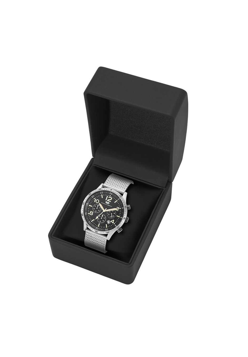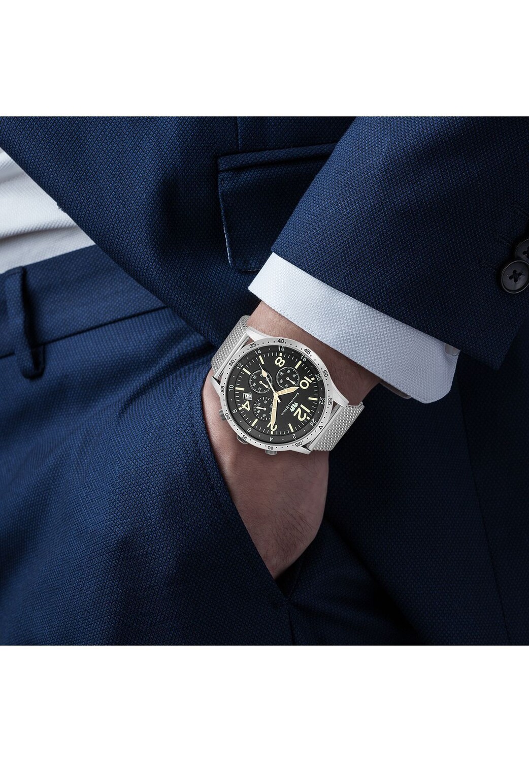 Описание товара: ОБЩАЯ ИНФОРМАЦИЯ: Целевая группа: мужские часы: хронограф Дисплей: аналоговый МЕХАНИЗМ: Механизм: кварцевый Механизм: Япония БРАСЛЕТ: Материал браслета: нержавеющая сталь Покрытие браслета: нет Поверхность браслета: тисненая Застежка браслета: Скользящая застежка Цвет браслета: серебро Длина браслета (мм) - прибл.: 220,0 Ширина браслета/ушко (мм) - прибл.: 21,7 Тип браслета/дизайн браслета: Миланский браслет, можно укоротить?: нет КОРПУС: Форма корпуса: круглый Размеры корпуса (мм) - прибл.: 43,8 Высота корпуса (мм) - прибл.