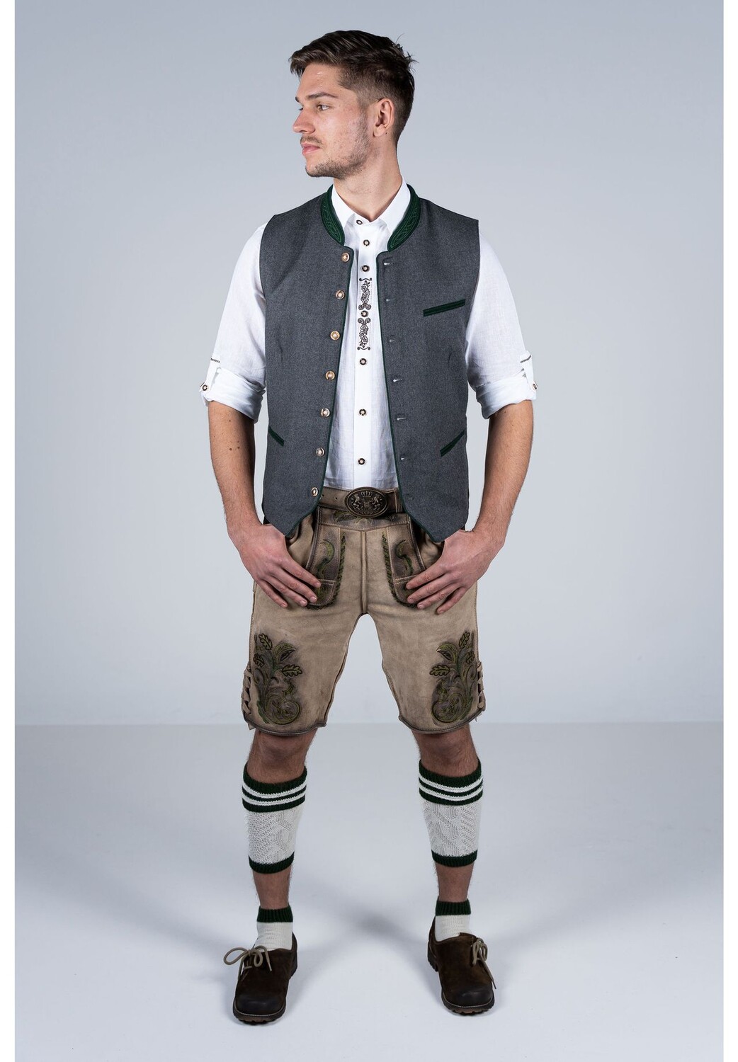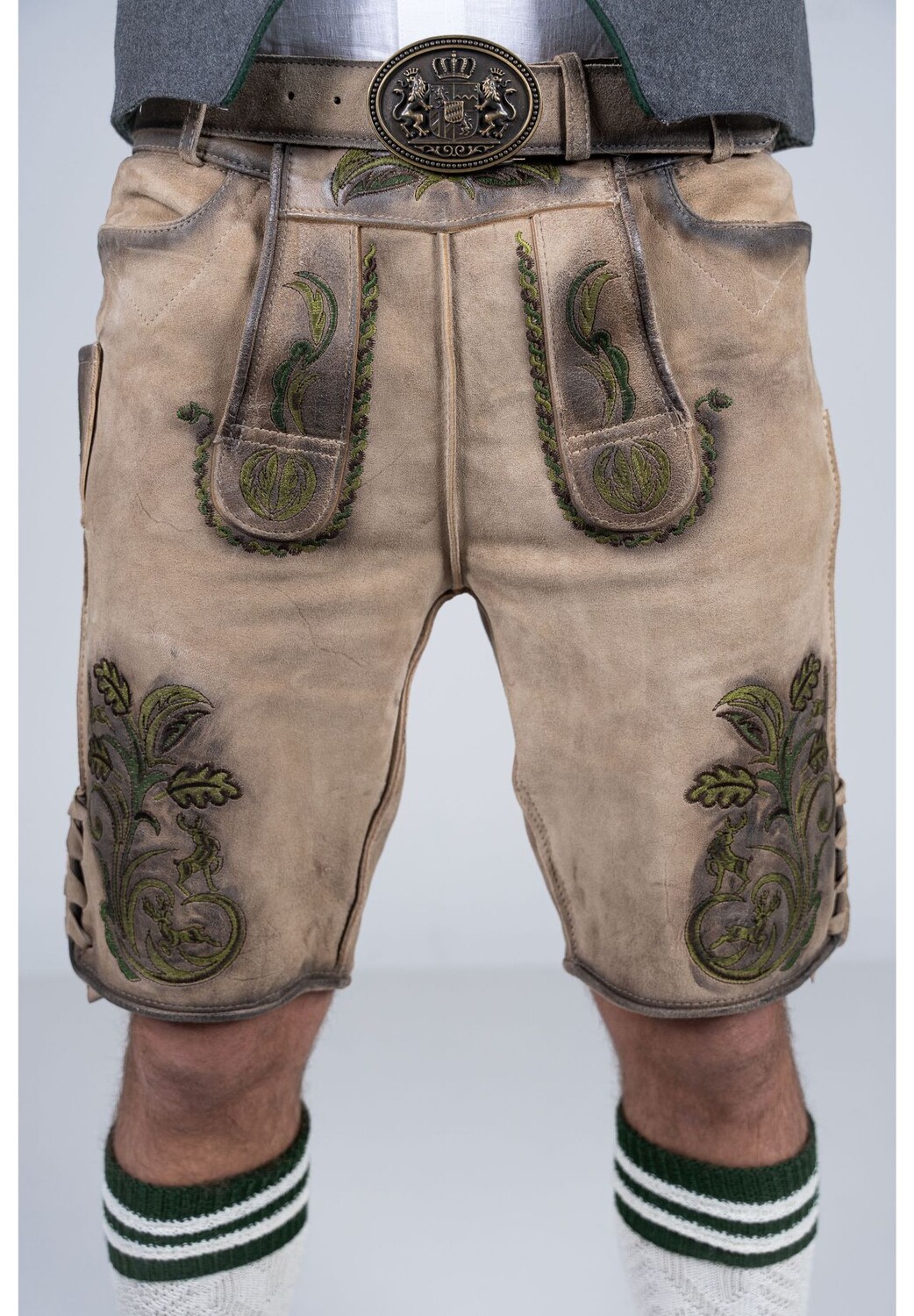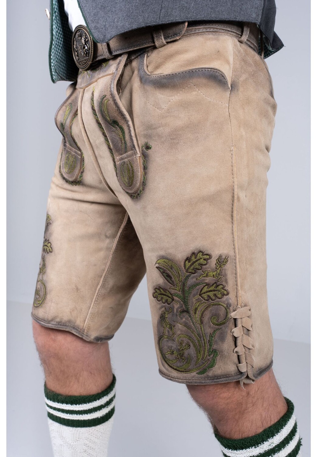 В этих стильных коротких кожаных брюках вы гарантированно привлечете всеобщее внимание. Кожаные брюки впечатляют своей очень мягкой и эластичной козьей кожей стильного естественного тона. Зеленая вышивка прекрасно контрастирует по цвету и делает брюки привлекательными, но в то же время выглядит гармонично и не слишком подавляюще. В комплект поставки также входит соответствующий традиционный ремень с баварским мотивом.
