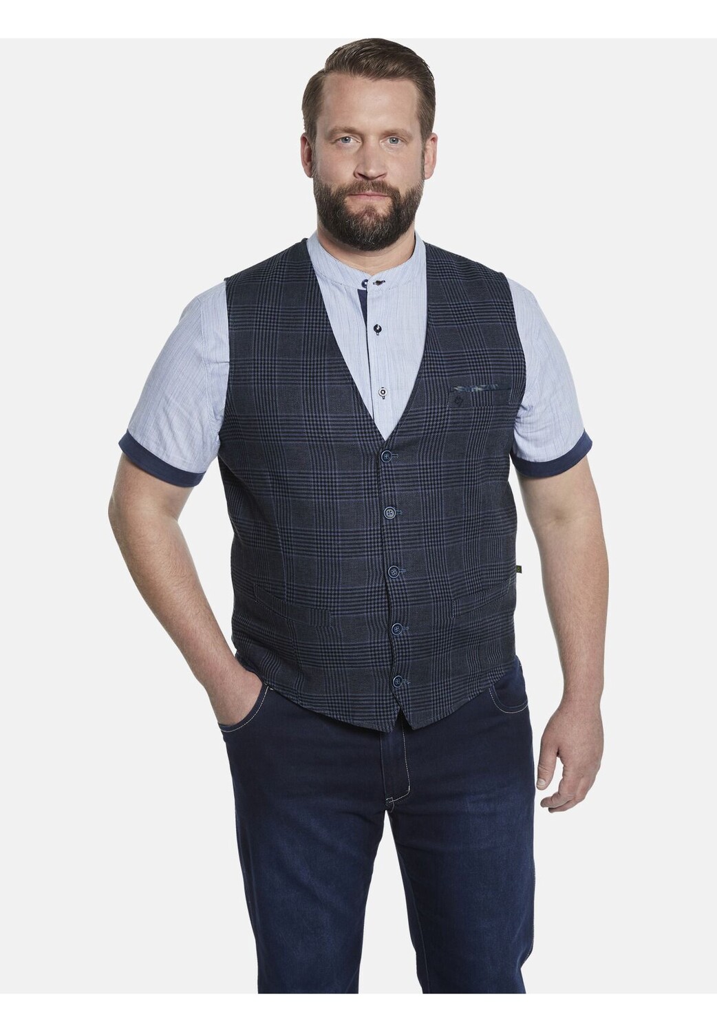 Особенности модный узор в клетку темно-синий в клетку Стирать с похожими цветами, стирать наизнанку, гладить наизнанку Жилет DUKE NIVEN, в клетку с гленом -Дизайн Комфортная посадка - прямой и удобный крой Смесь хлопка и льна Подкладка из полиэстера с принтом Нагрудный карман с нагрудным платком и вышитым логотипом Застежка : застежка на пуговицы Свойства материала