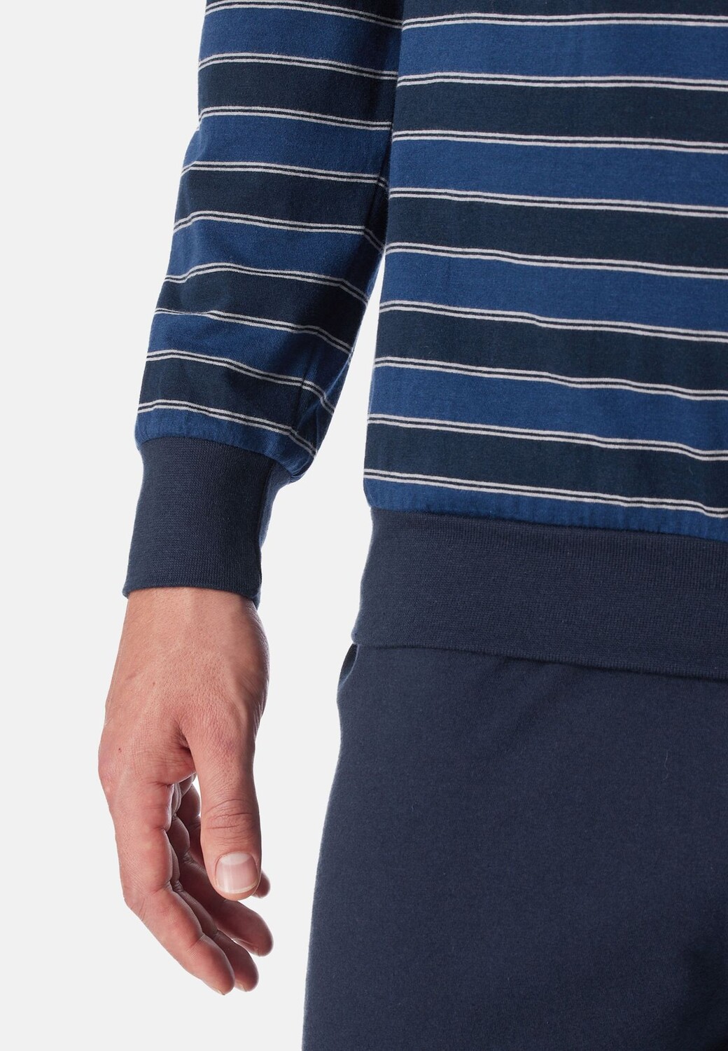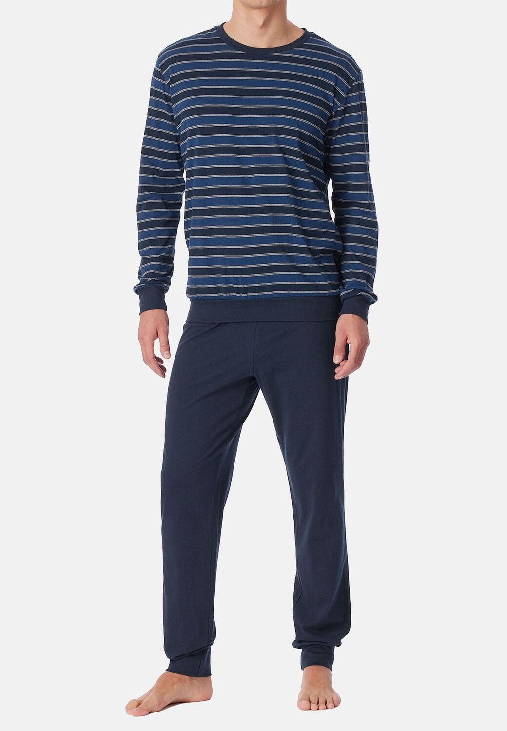 Вневременная пижама из серии Uncover, состоящая из длинных однотонных брюк и длинного топа в полоску. Благодаря манжетам на рукавах и штанинах, а также 100% хлопковому материалу пижама обеспечивает идеальный комфорт и отвечает даже самым высоким требованиям.