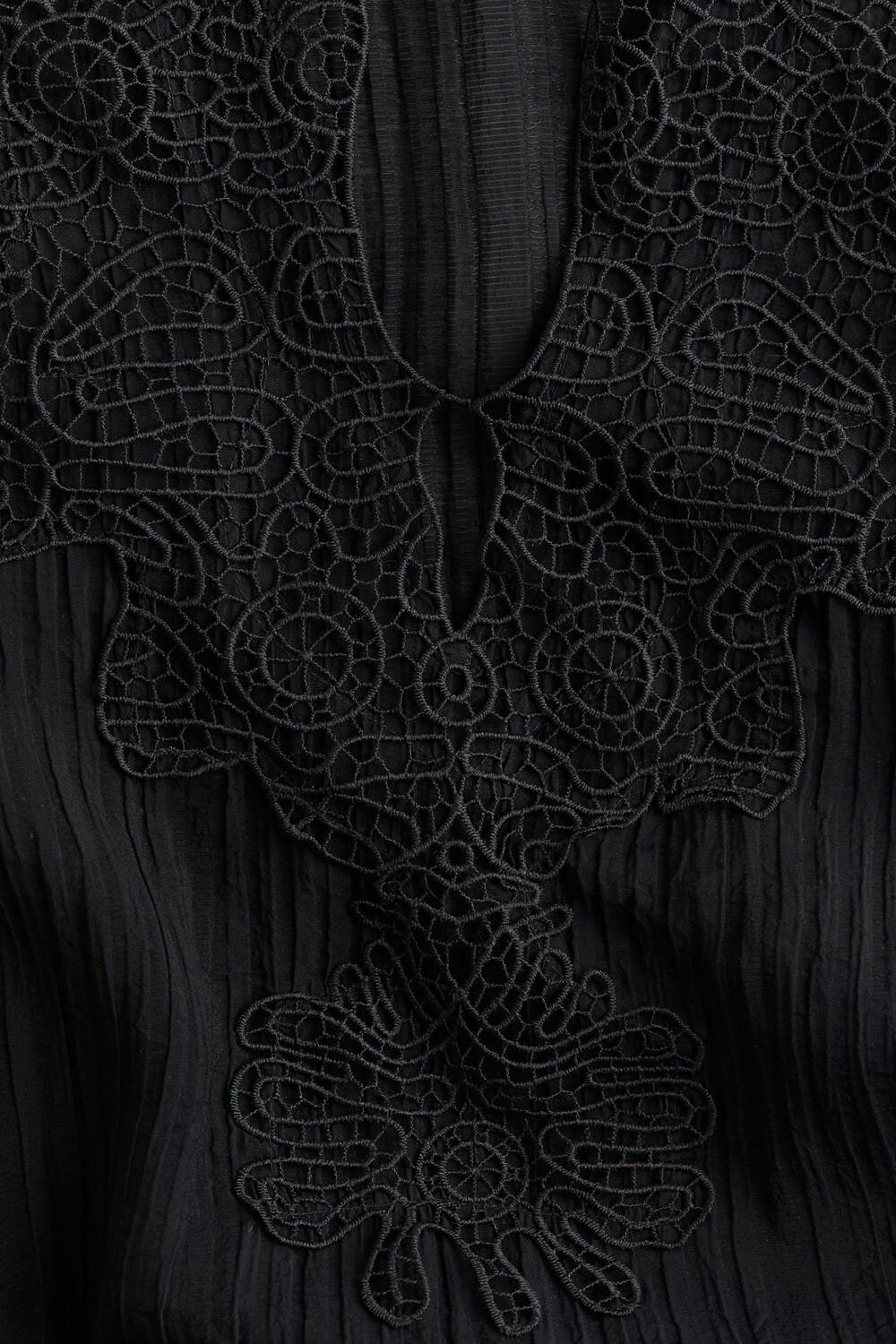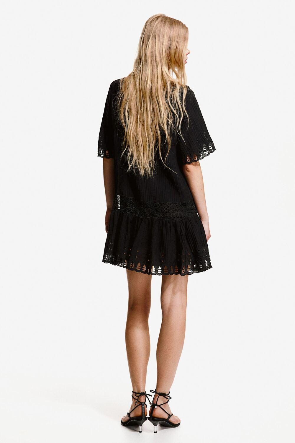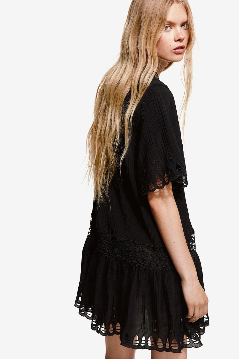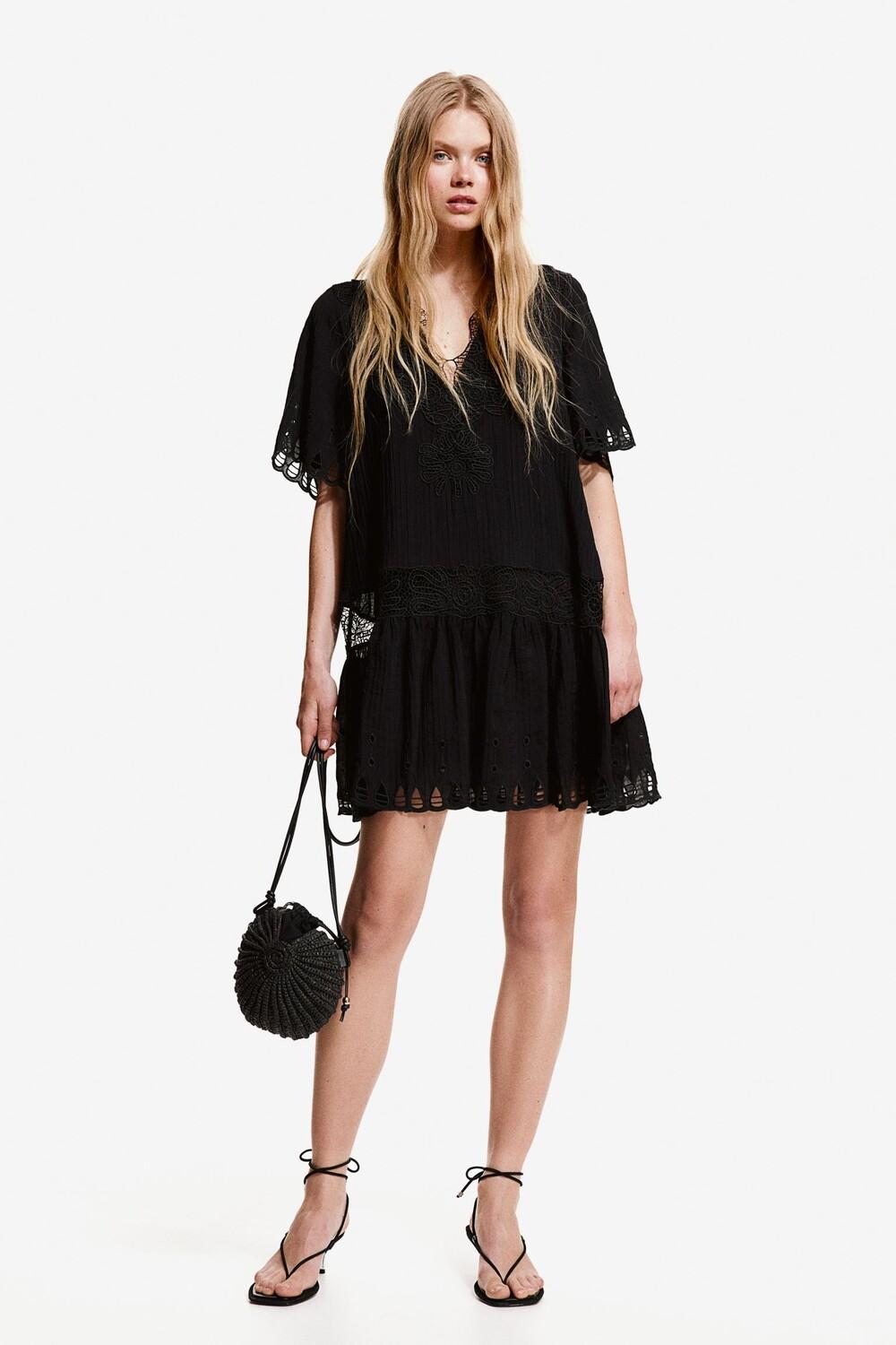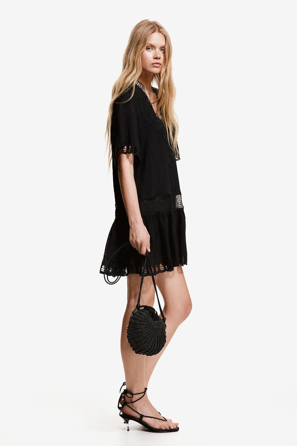 Короткое свободное платье из жатой ткани «добби», украшенное вышивкой в том же цвете. Глубокий V-образный вырез, короткие широкие рукава и расклешенный низ. Рукава и низ с волнистым краем украшены английской вышивкой. Платье-комбинация из джерси на узких регулируемых бретелях.