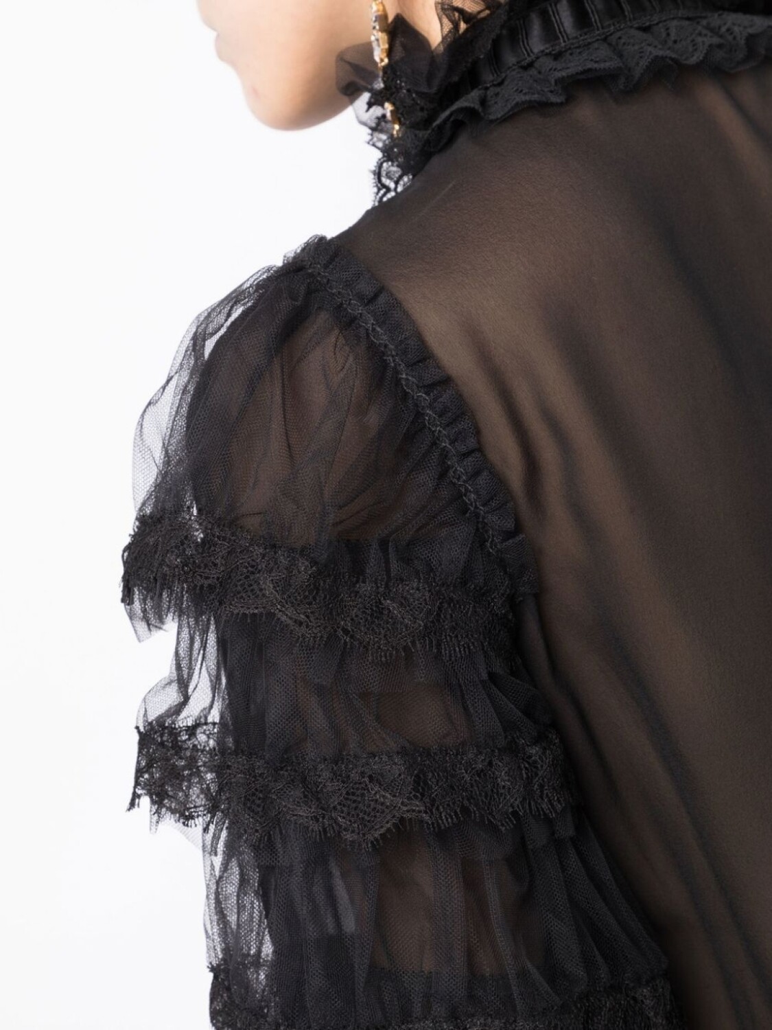 Черный, шелк малбери, вставки с оборками, вставки из кружева, высокий присборенный воротник, потайная застежка спереди, длинные рукава и прямой подол.