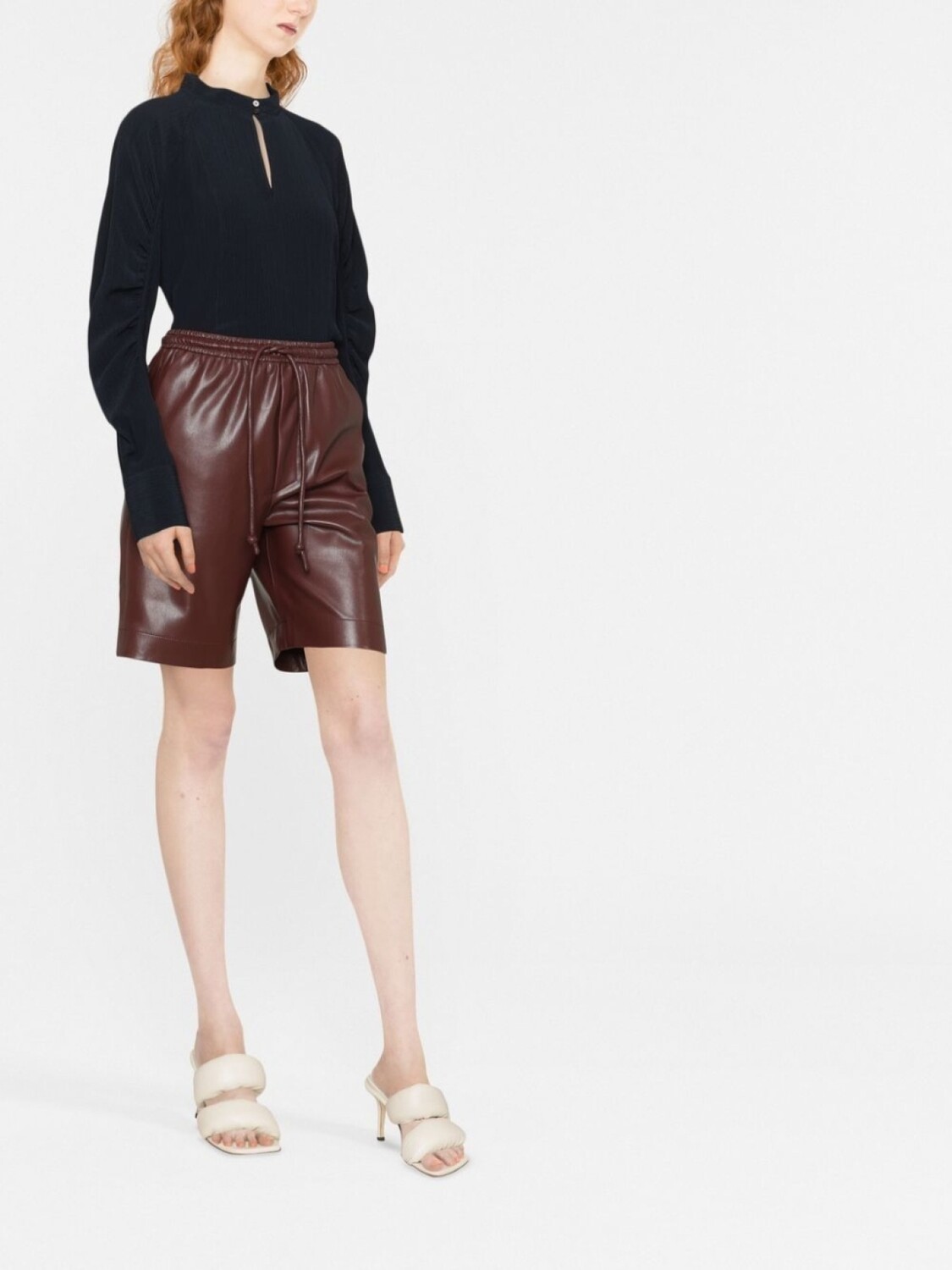 Темно-синий, шелк, высокий воротник, вырез с прорезью, длинные рукава и прямой подол.