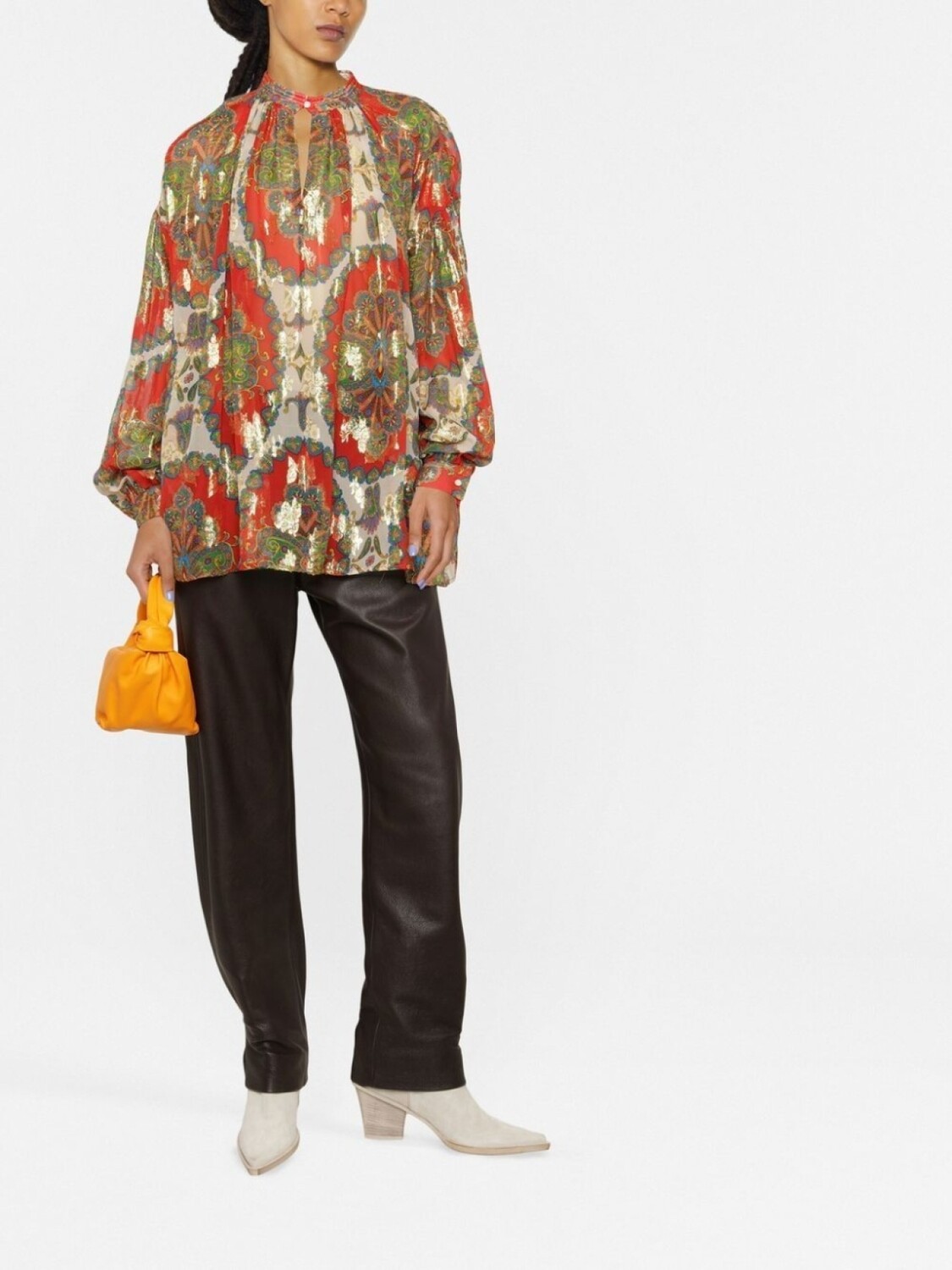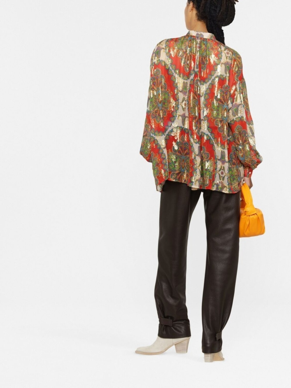 Разноцветный, шелк, люрекс, высокий воротник, принт пейсли, длинные широкие рукава, манжеты на пуговицах и прямой подол.