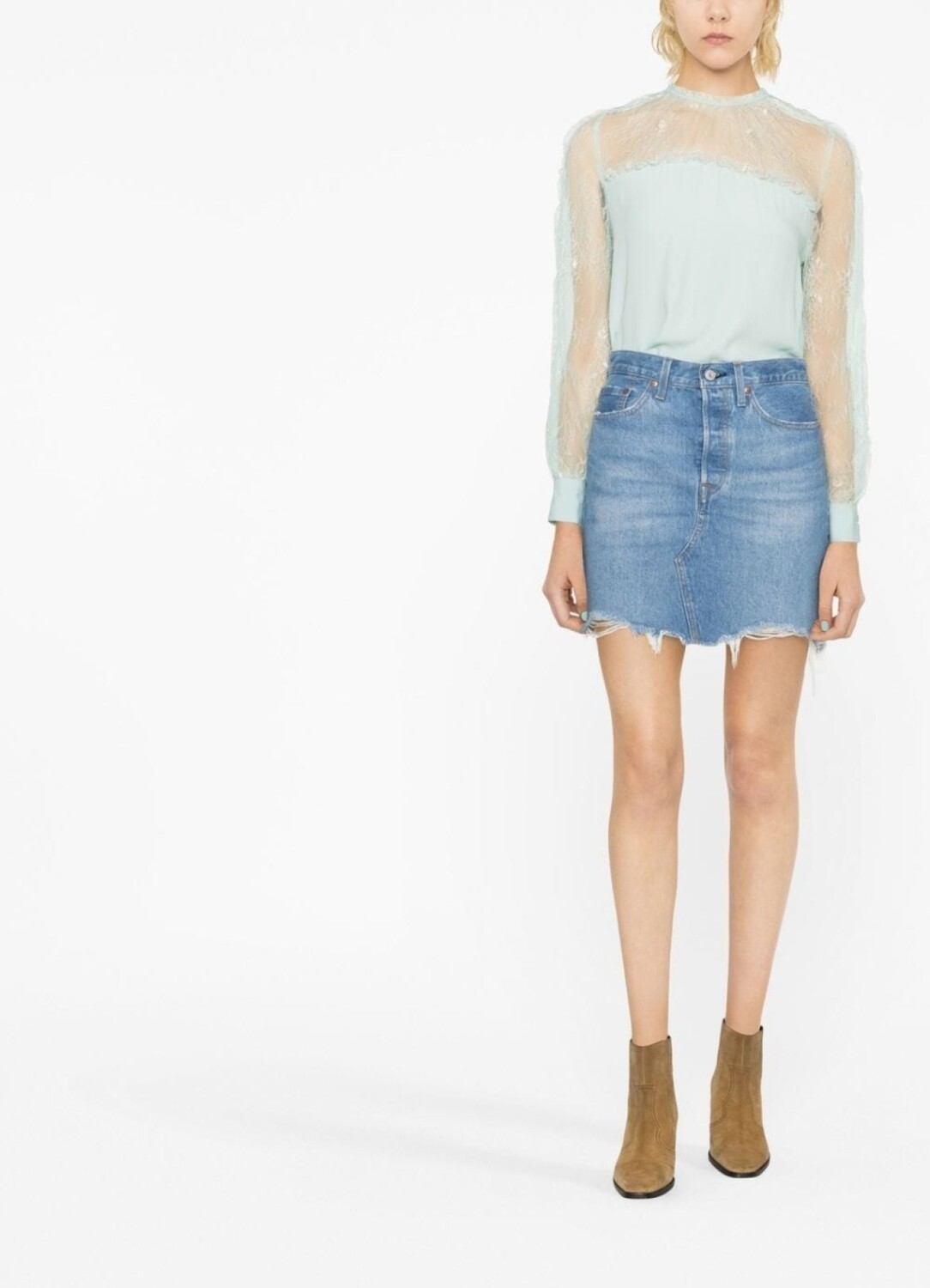 Светло-зеленый, смесовый шелк, полупрозрачные вставки, вставки с оборками, круглый вырез и длинные рукава.
