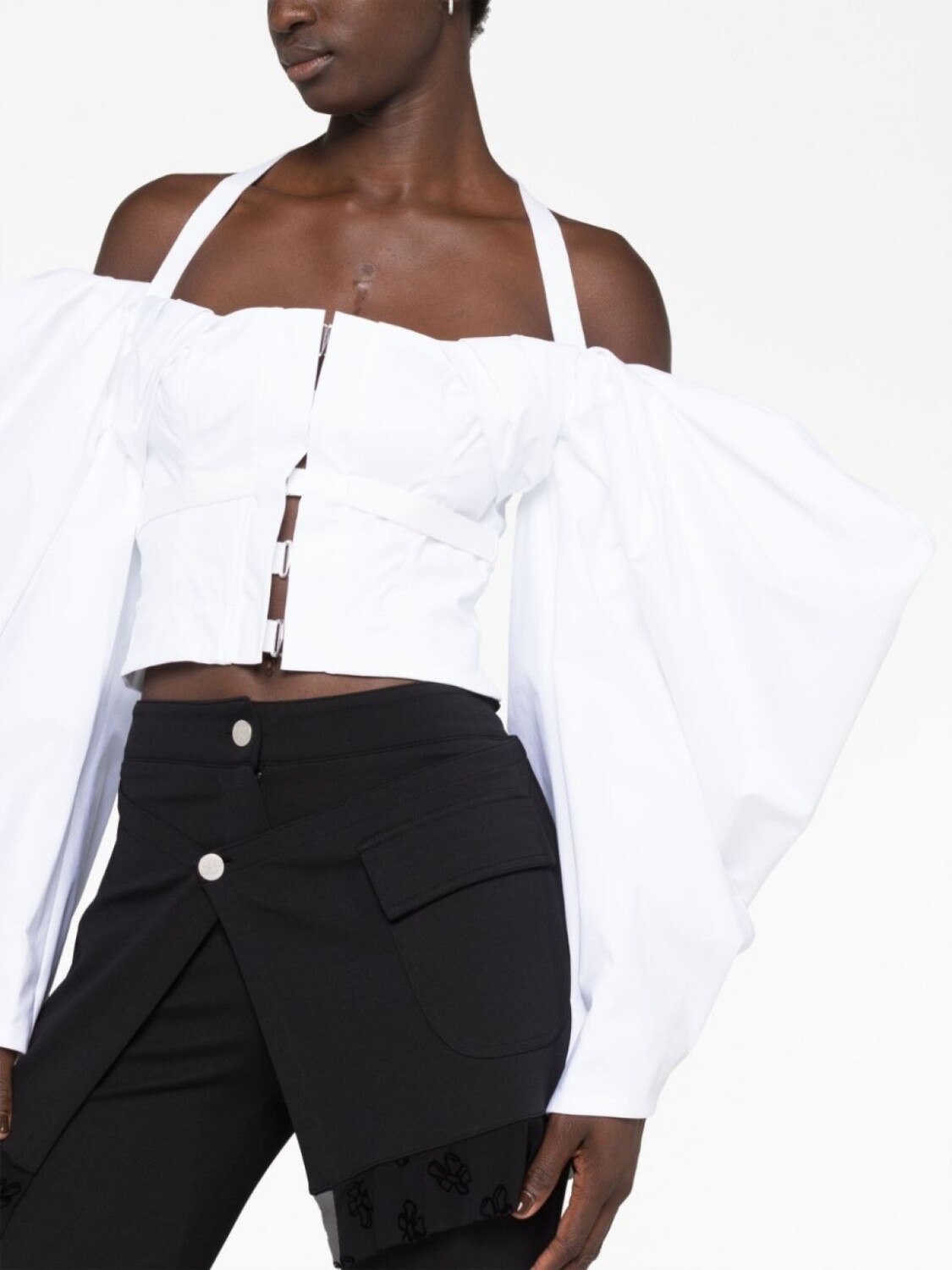 Белый, эластичный хлопок, открытые плечи, объемные рукава, застежка на крючок, серебристая фурнитура, укороченная длина и прямой подол.