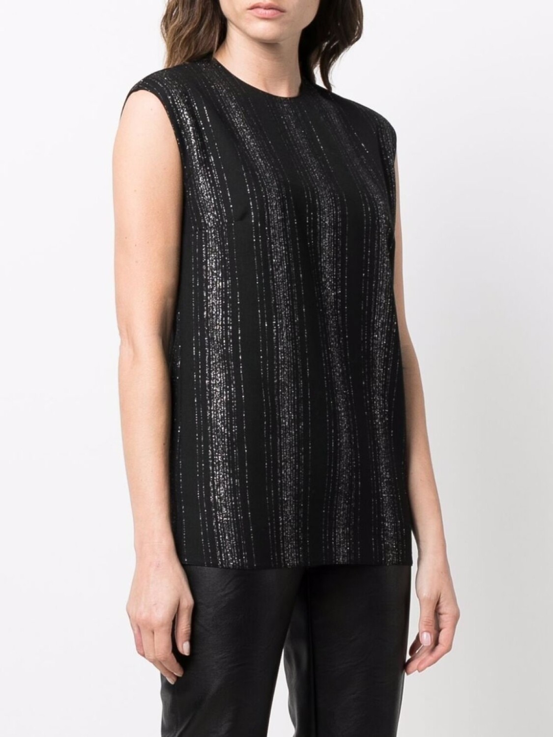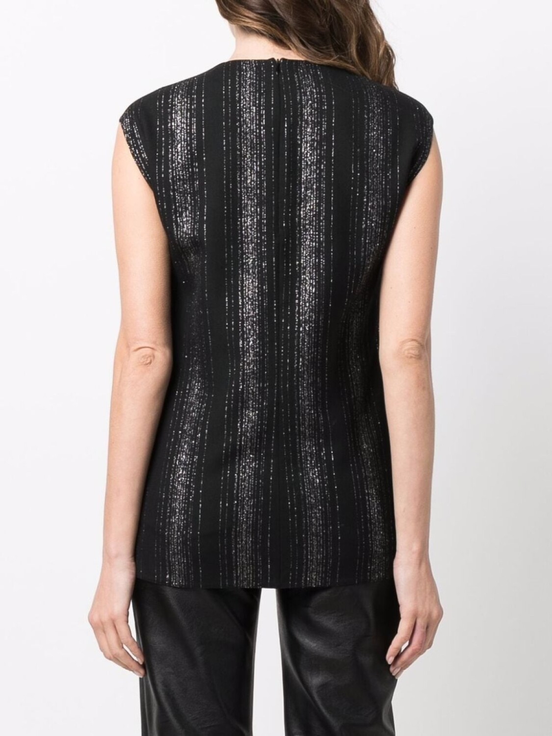 Вставки из люрекса, узор в вертикальную полоску, без рукавов, круглый вырез и потайная застежка на молнии сзади. Цвет: черный. .