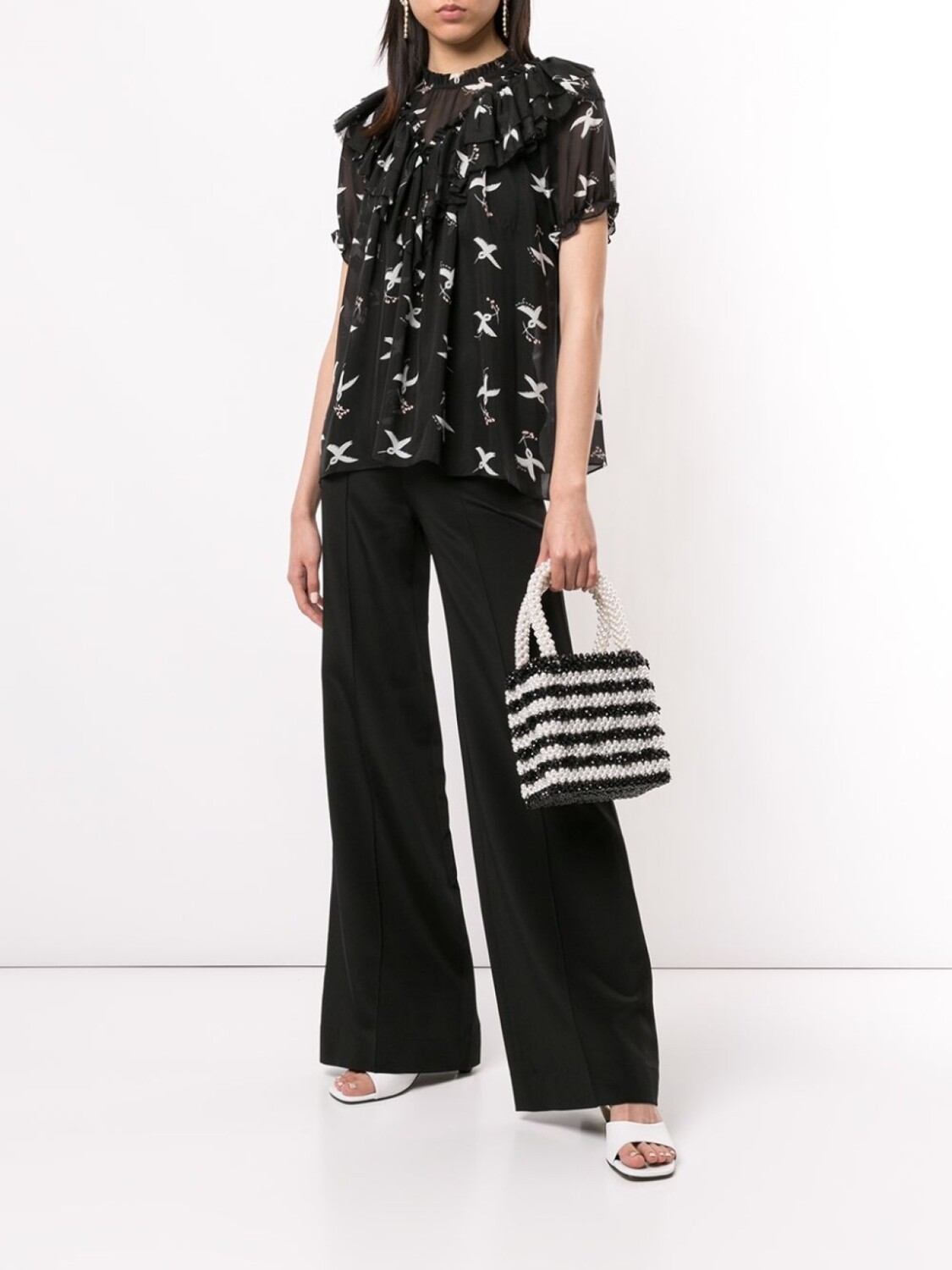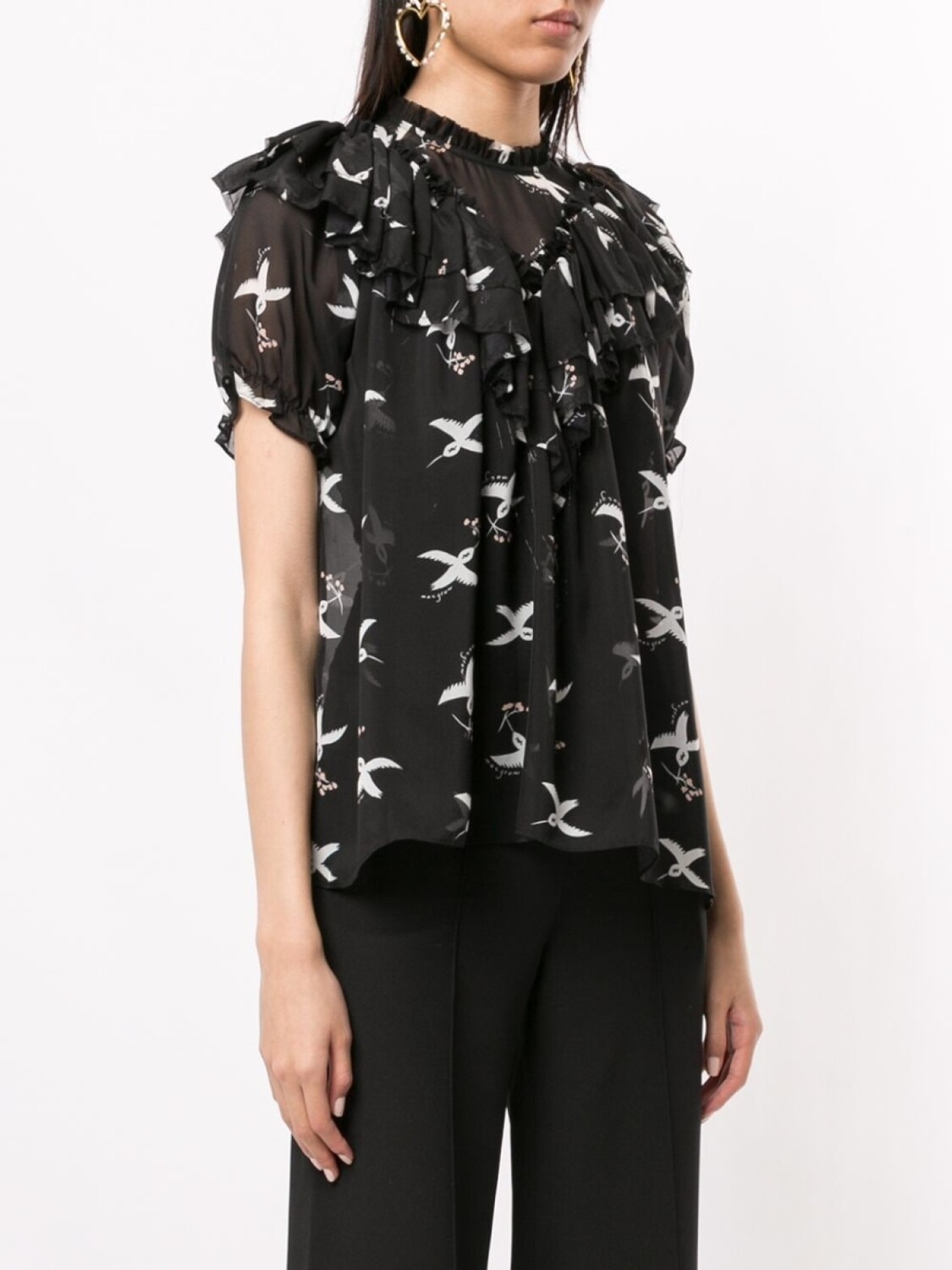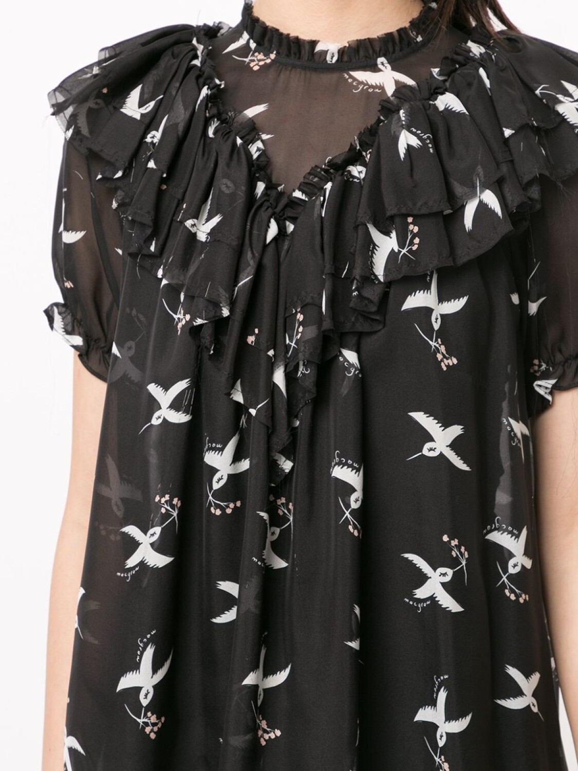 Блузка с принтом Migration Bird от McGraw (МакГроу). Прозрачная деталь, высокая горловина, V-образная горловина, оборочная отделка, короткие рукава, сплошной узор, прорезь на спине, задняя застежка на пуговице и подол "тюльпан".