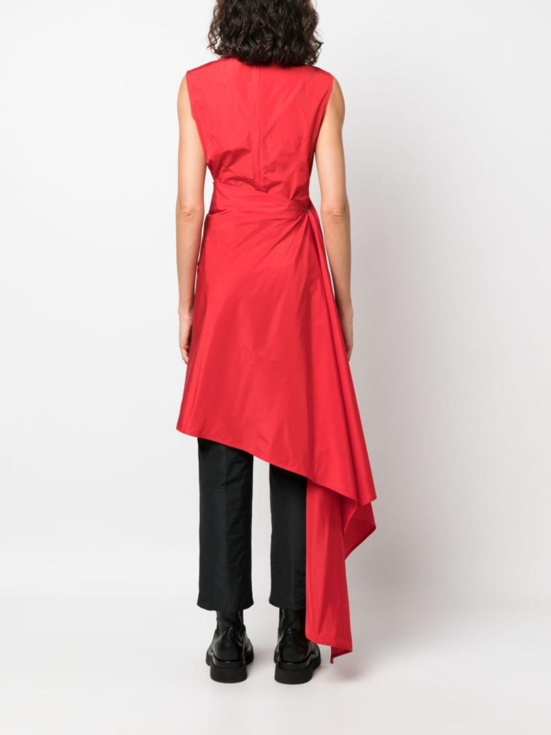 Ярко-красный, съемные вставки, драпировка, круглый вырез, застежка на молнии сзади, без рукавов и неравномерный подол.
