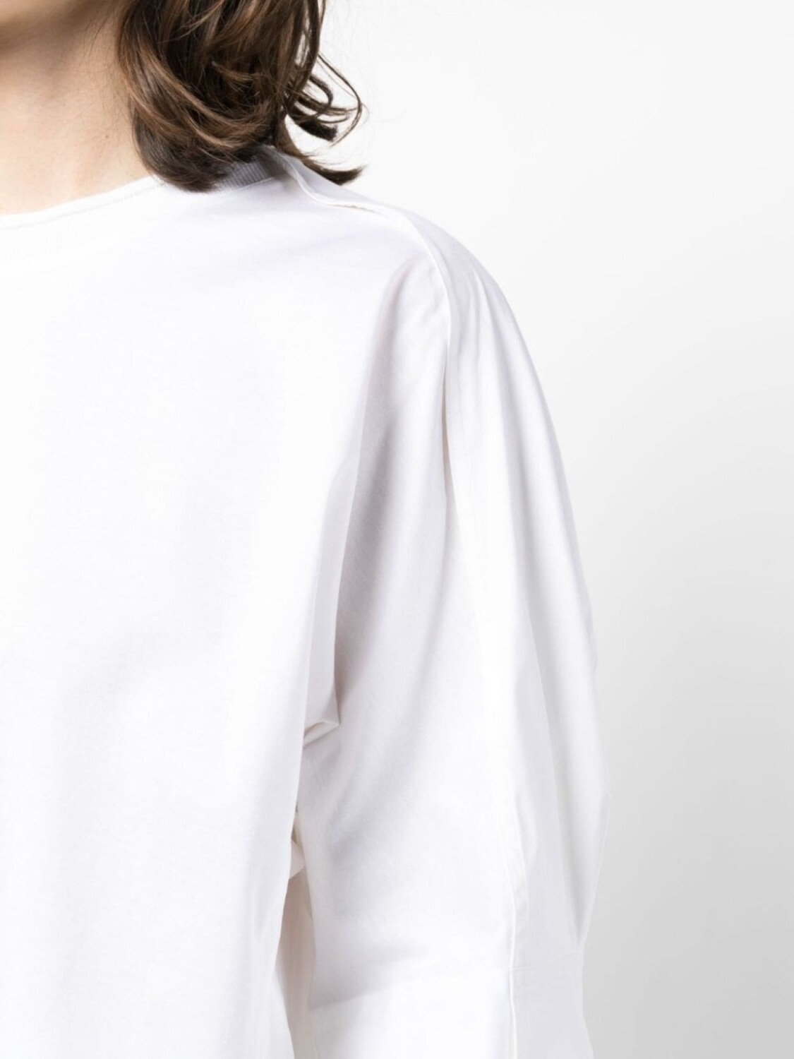 Белый, смесовый хлопок, складки, круглый вырез, короткие рукава и прямой подол.