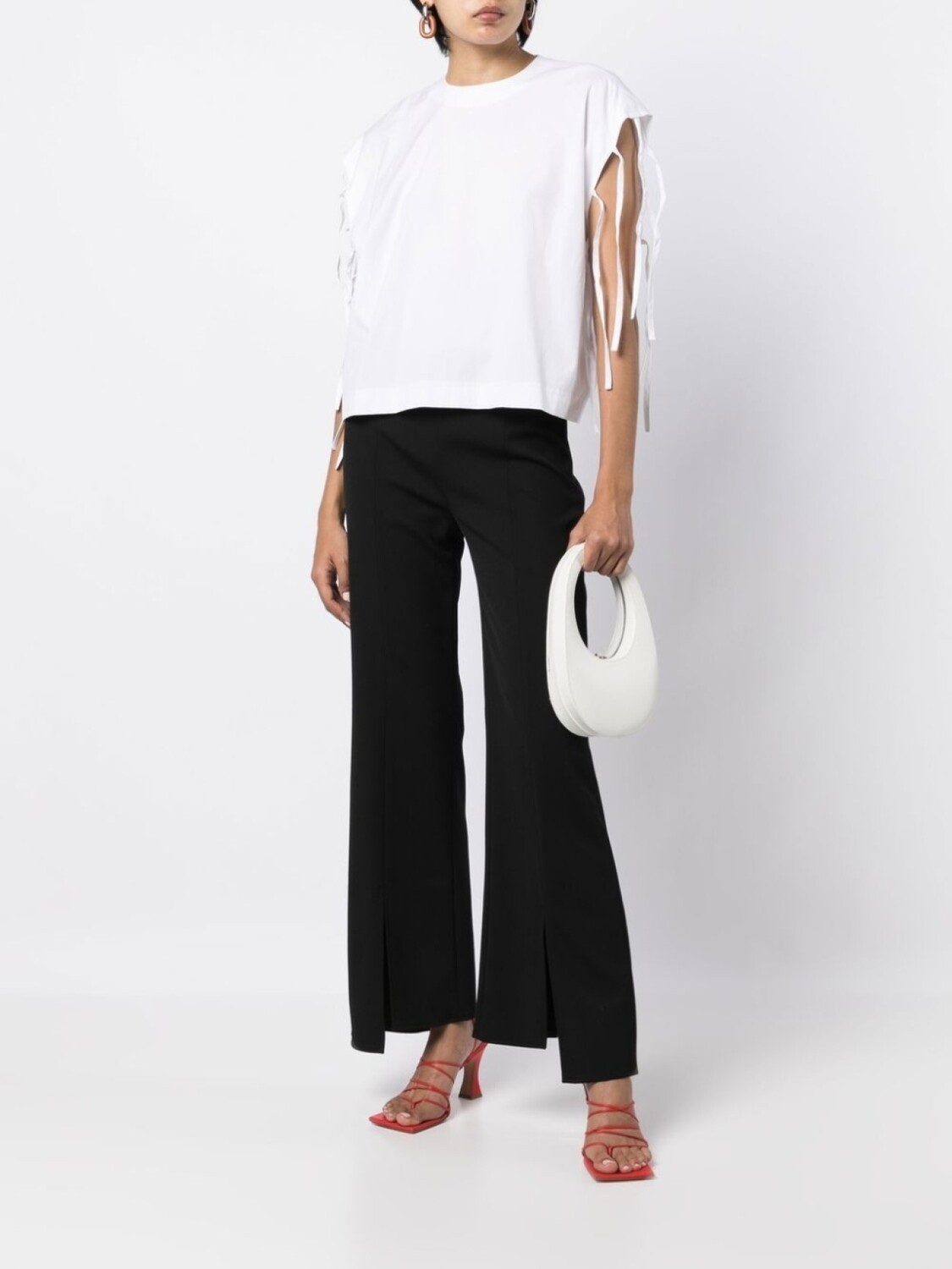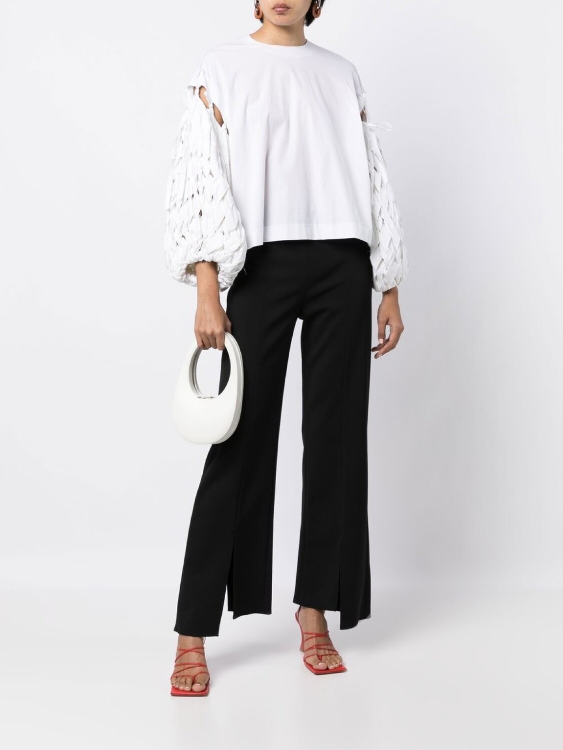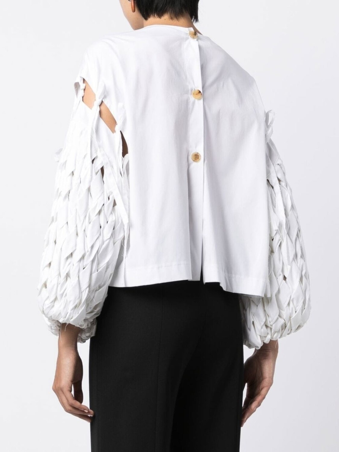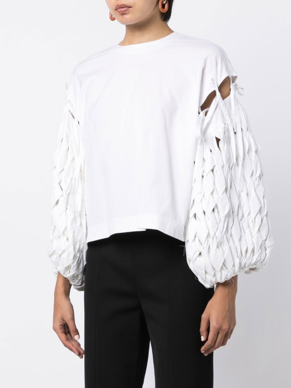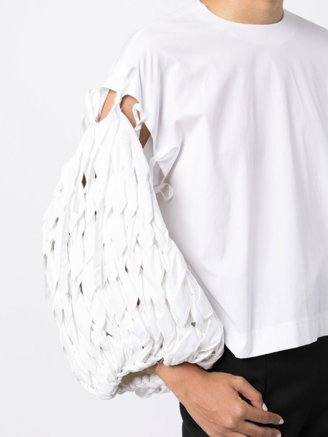 Белый, смесовый хлопок, вырезные детали, переплетенный дизайн, объемные рукава и прямой подол.