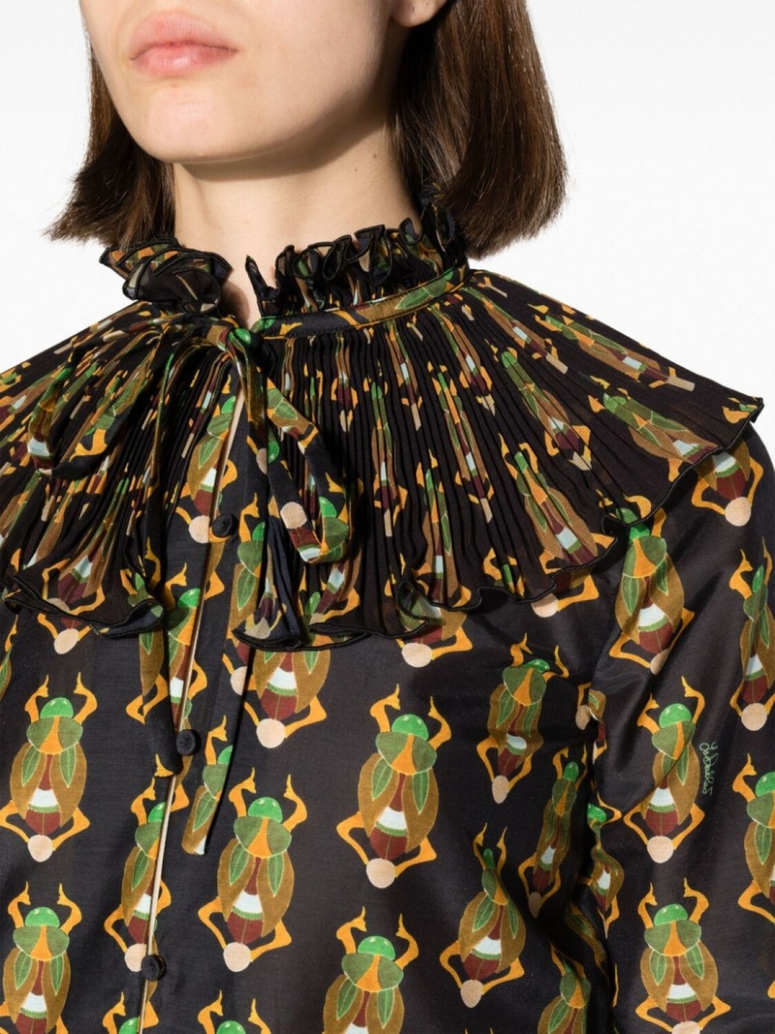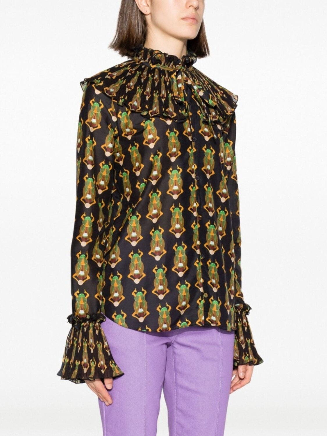 Черный/разноцветный, смесь хлопка и шелка, сплошной графичный принт, складки, высокий присборенный воротник, застежка на пуговицах спереди, длинные рукава, расклешенные манжеты и прямой подол.