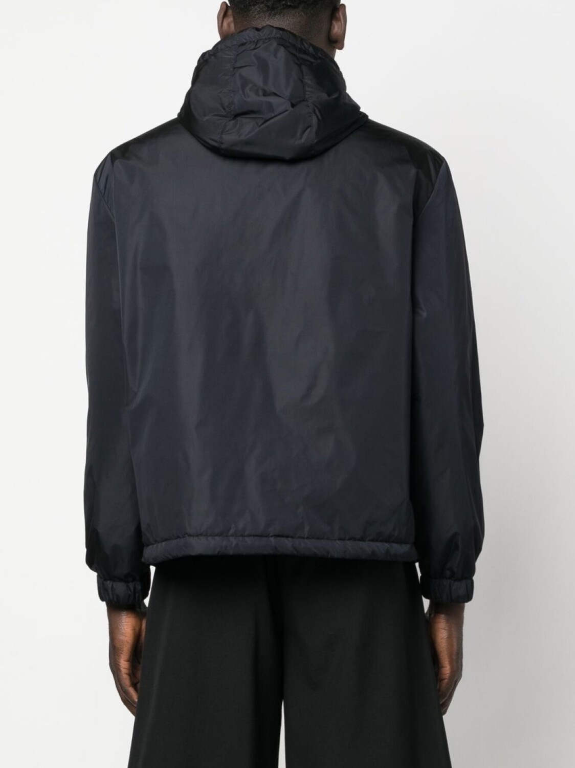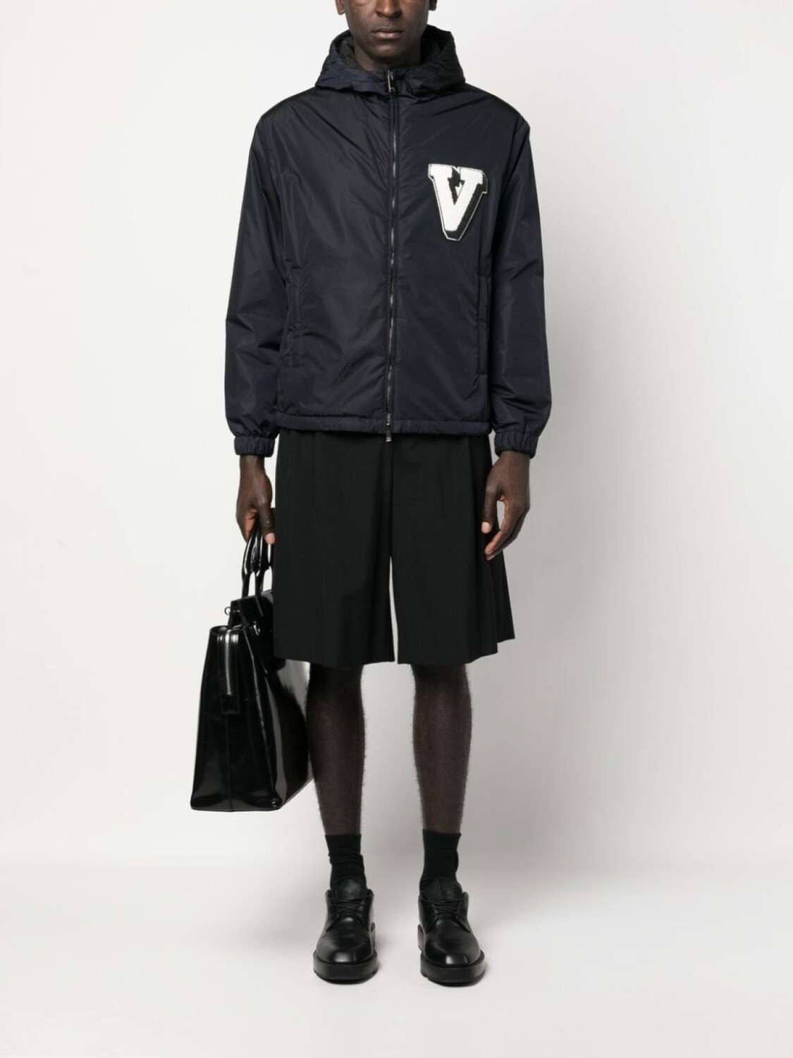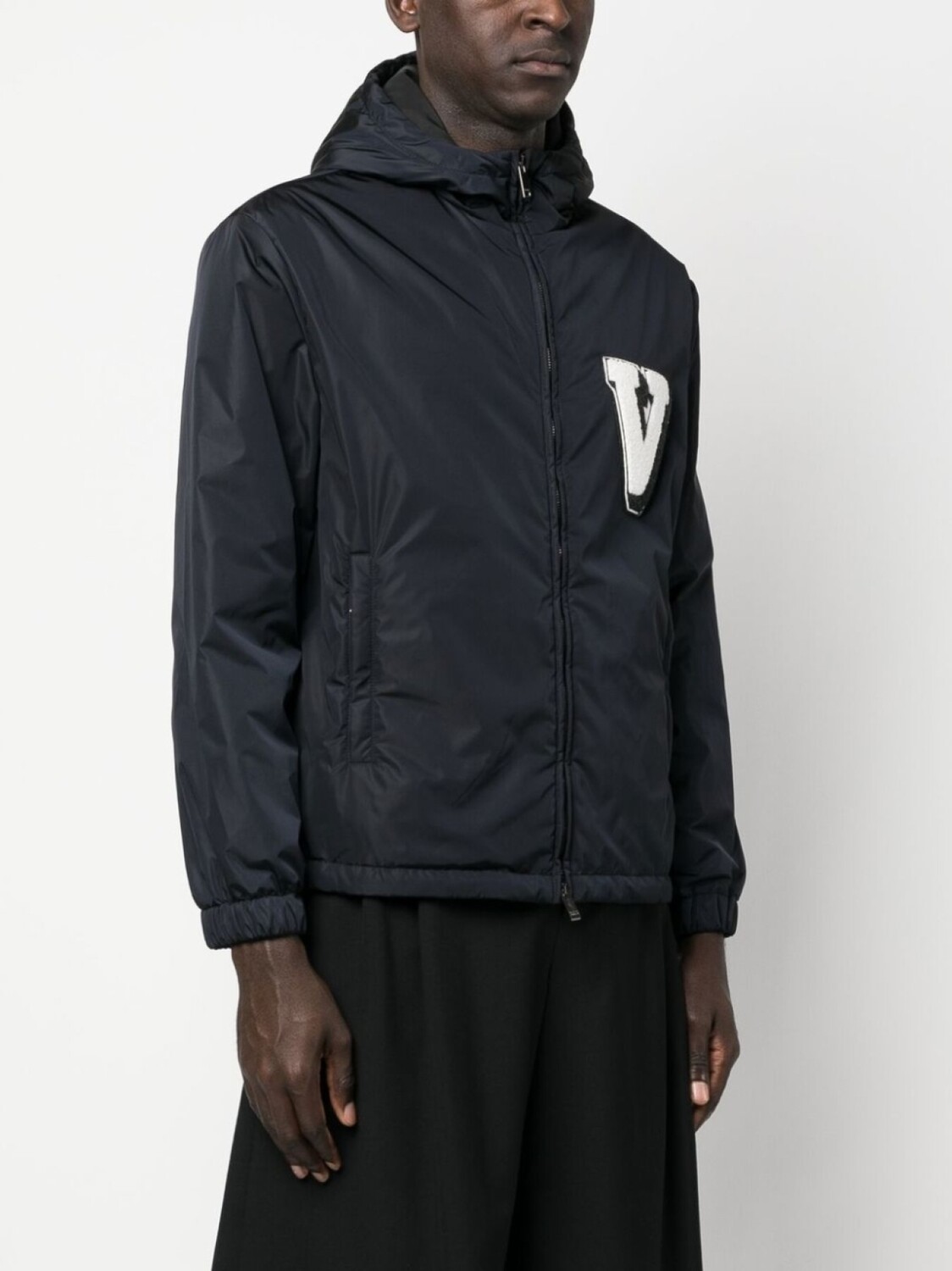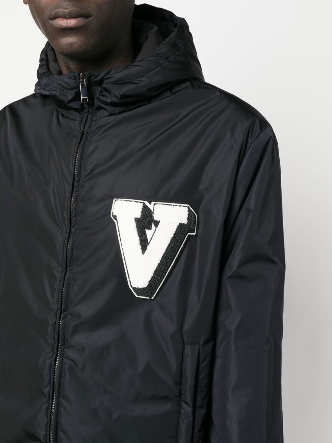 Коллекция Valentino Ready To Wear, темно-синий, дутый материал, нашивка с логотипом на груди, классический капюшон, двусторонняя молния спереди, длинные рукава, два прорезных кармана сбоку и прямой подол.