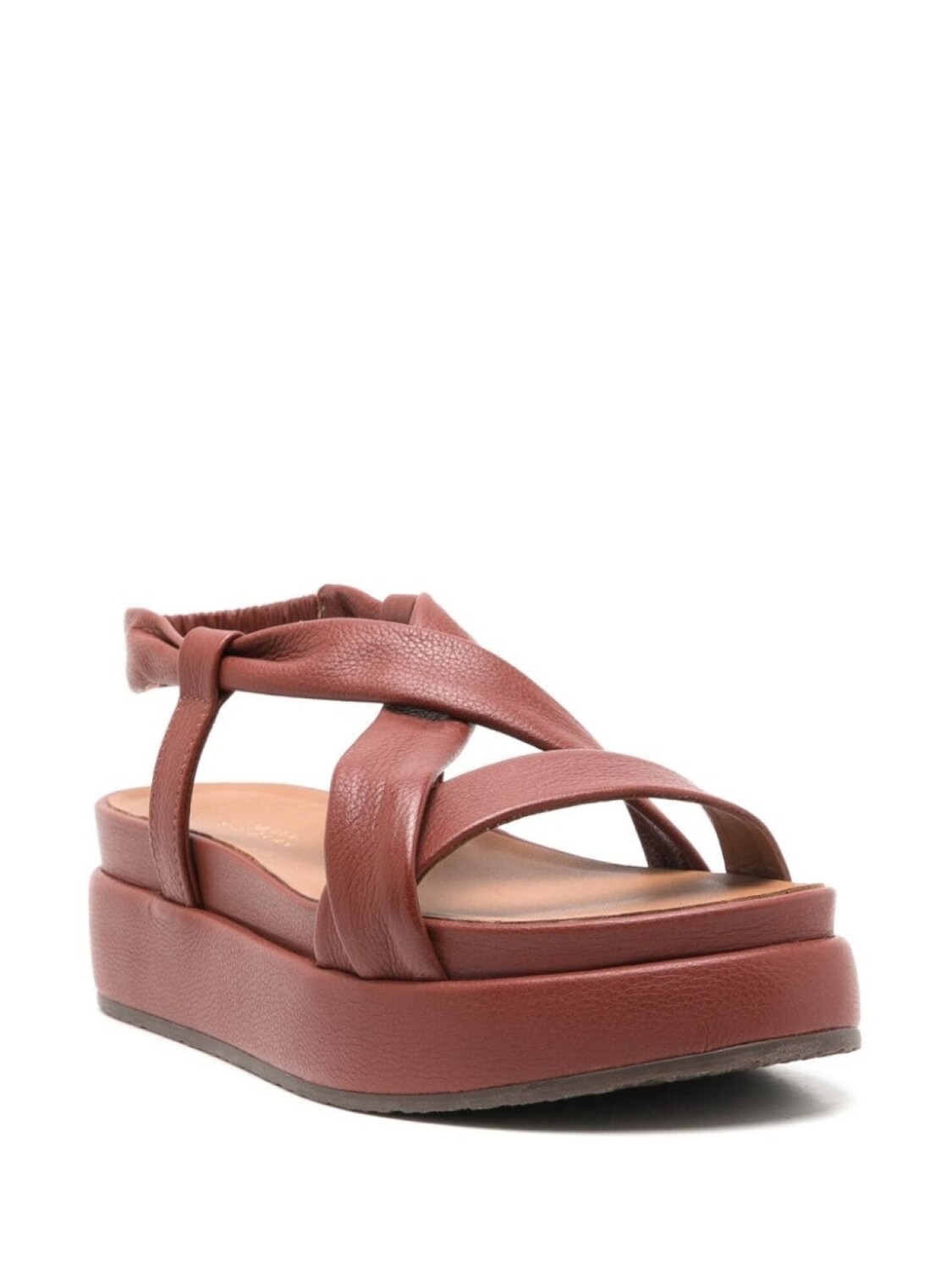 Коричневый, кожа, несколько вариантов крепления ремня, открытый носок, эластичный ремешок на пятке, кожаная стелька с логотипом и подошва на платформе.