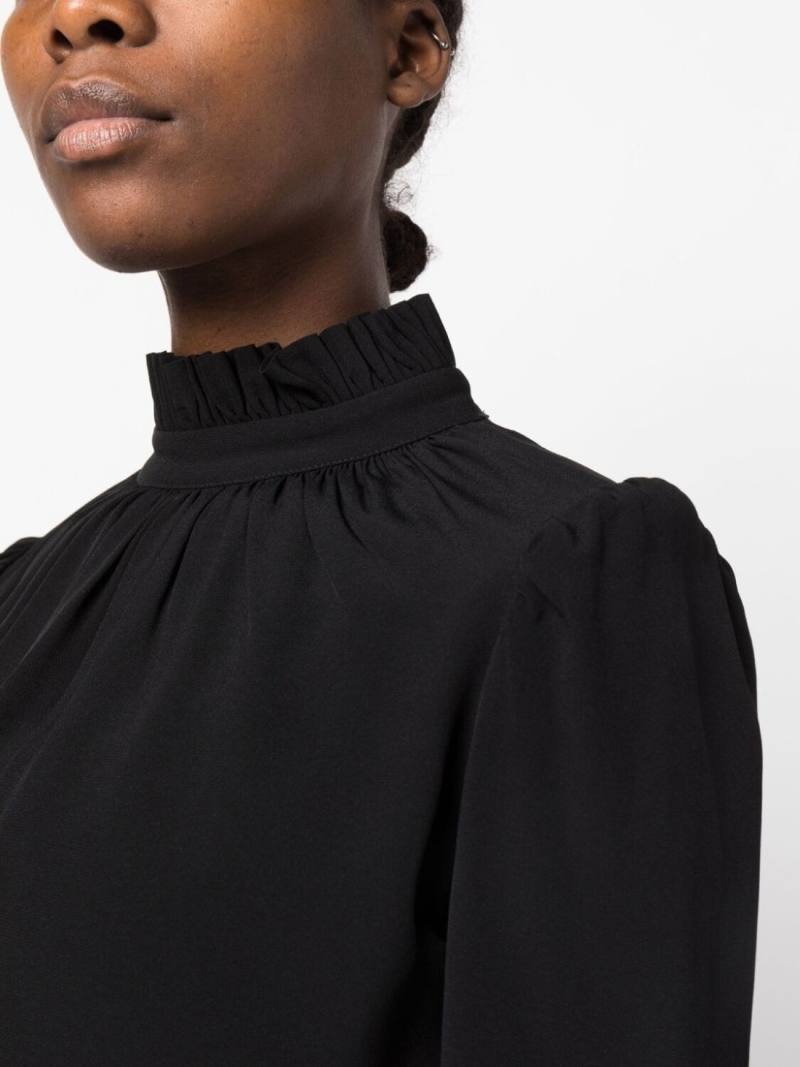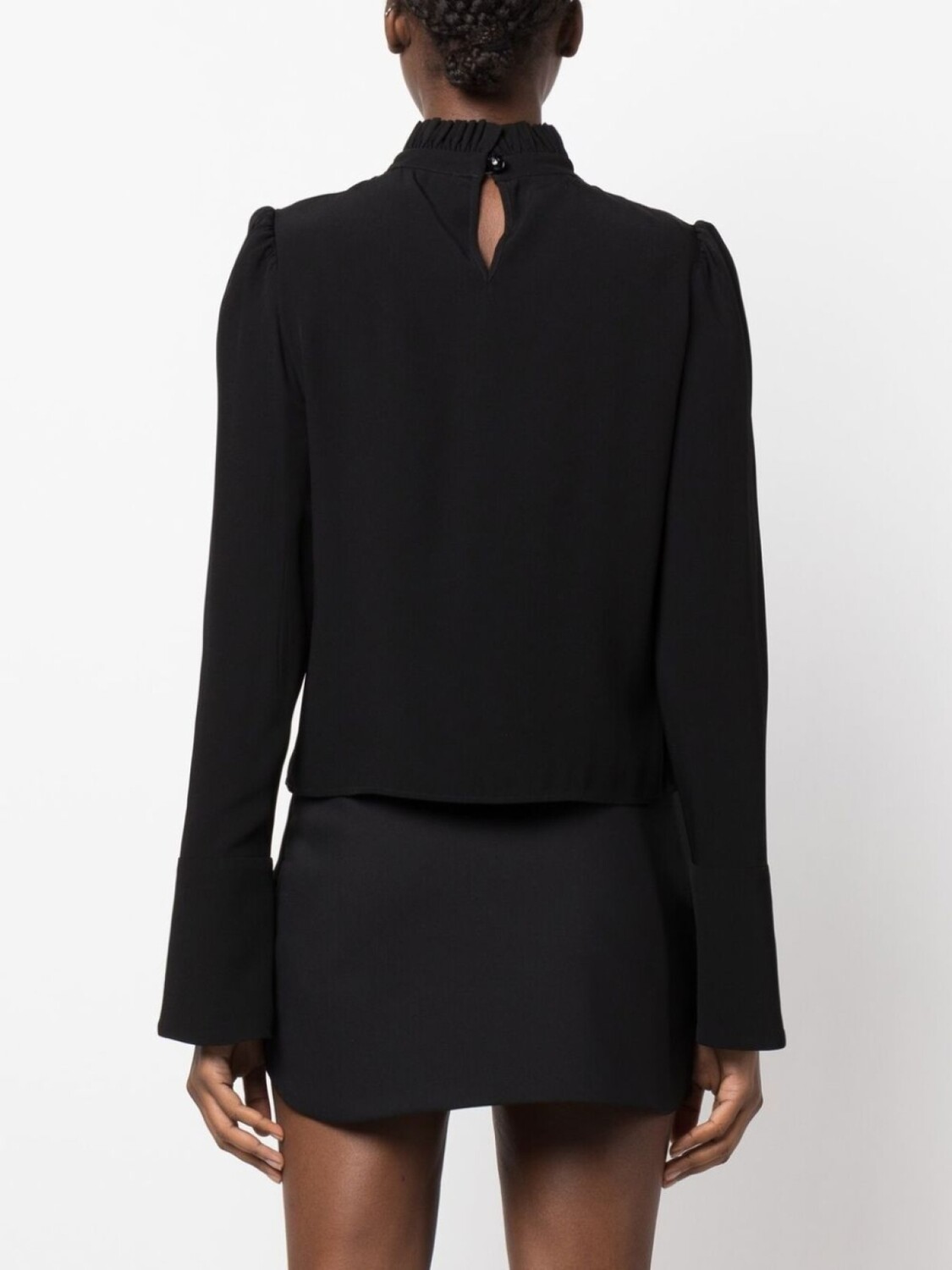 Черный, высокий воротник, детали с оборками, присборенные плечи, длинные рукава и расклешенные манжеты.
