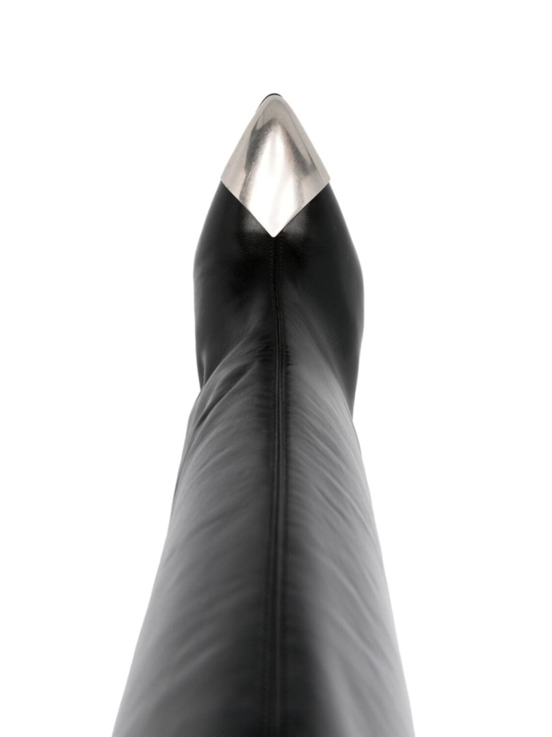 Черный, телячья кожа, гладкая текстура кожи, строчка в тон, носок с металлической накладкой, заостренный носок, модель без застежки, кожаная стелька с логотипом, высокий каблук в форме конуса и кожаная подошва.