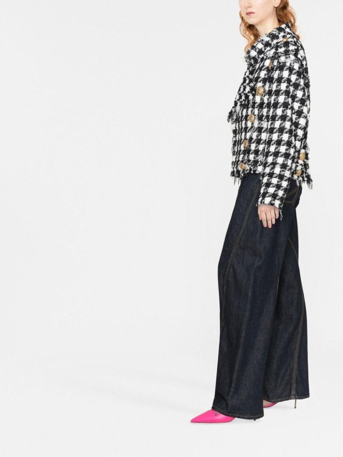 Черный/белый, смесь хлопка и шерсти, необработанные детали, узор в ломаную клетку, зазубренные лацканы, золотистые пуговицы с тиснением, длинные рукава и укороченная длина.