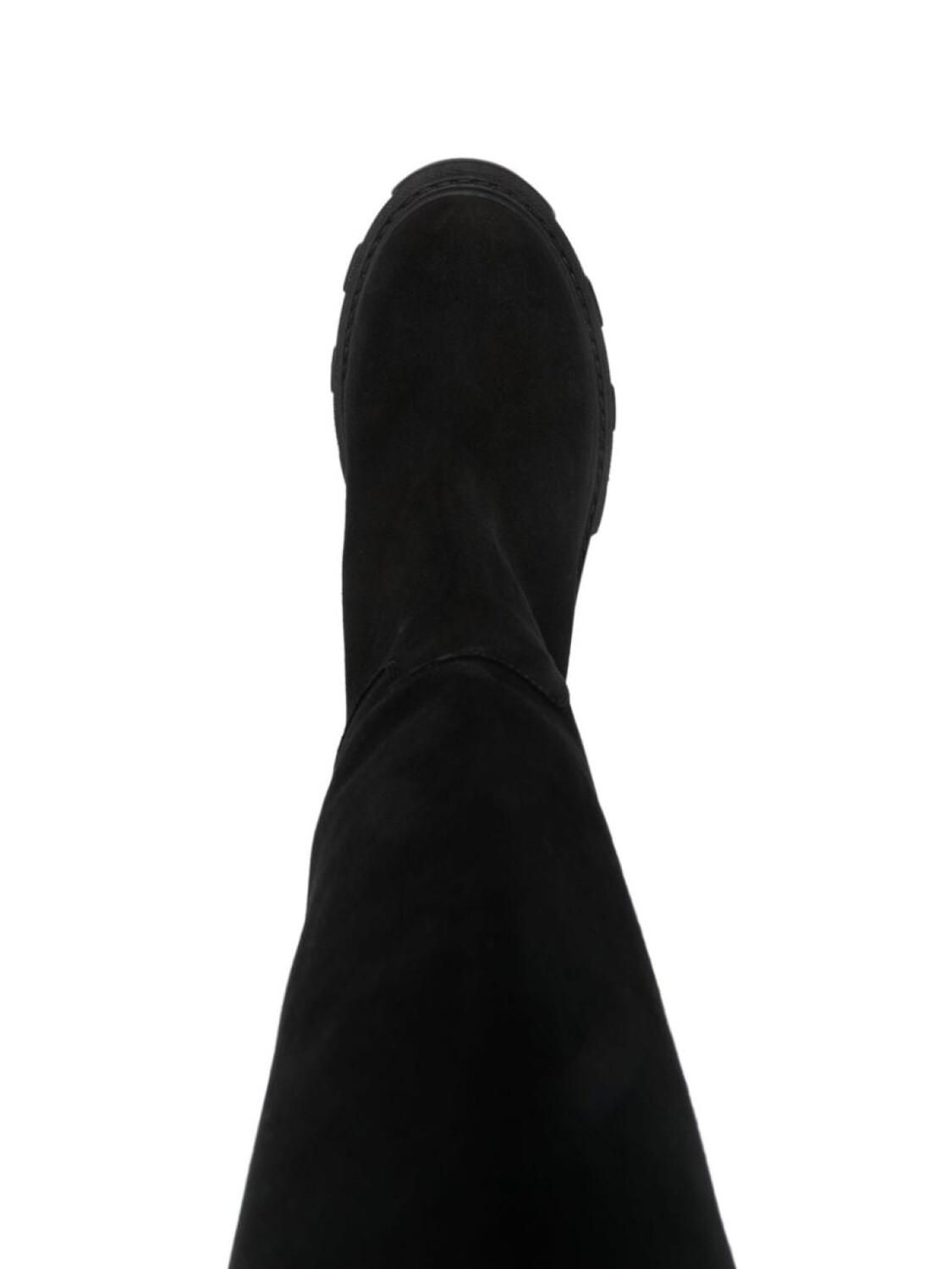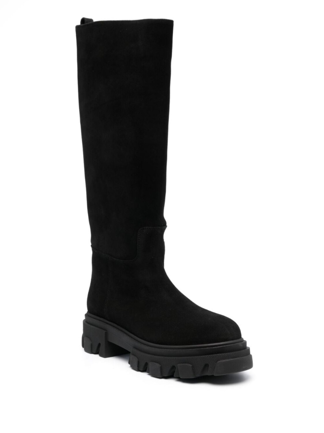 Черный, замша из телячьей кожи, телячья кожа, круглый вырез, длина до середины голени, двойная петля для подтягивания и массивная резиновая подошва.